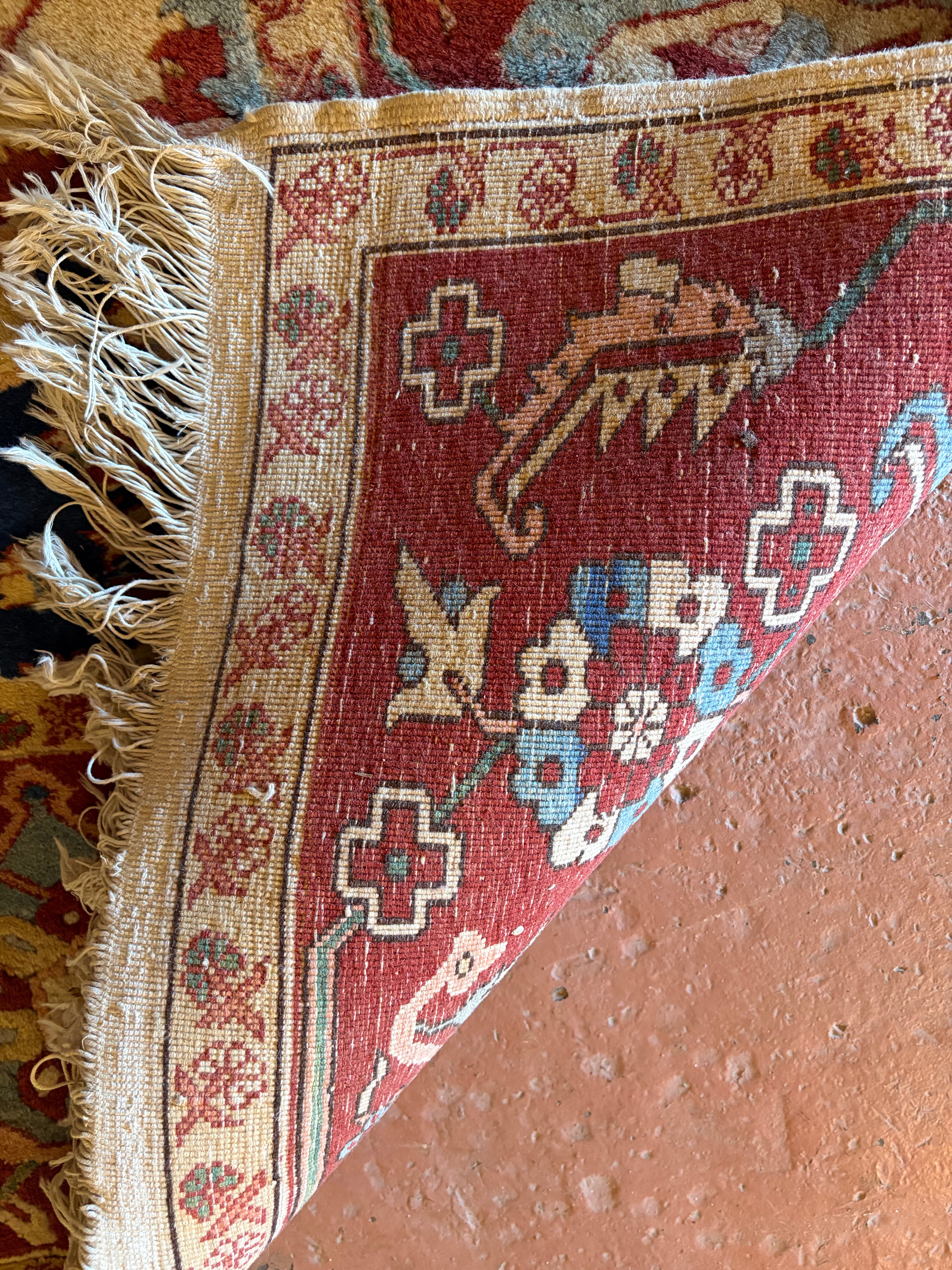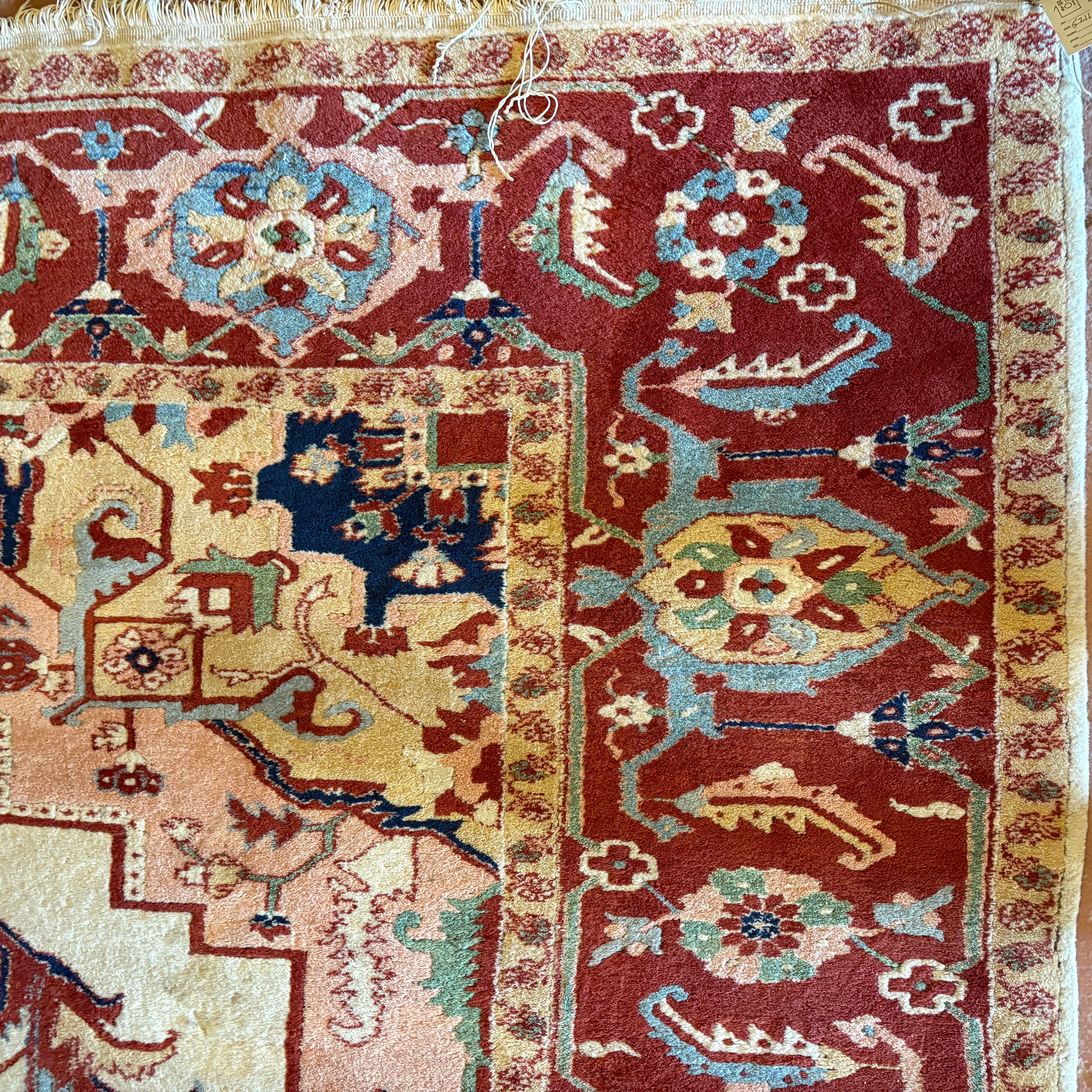 100% Wool Area Rug, Traditional Turkish Design in Rust, Rose, Navy on Beige Background.