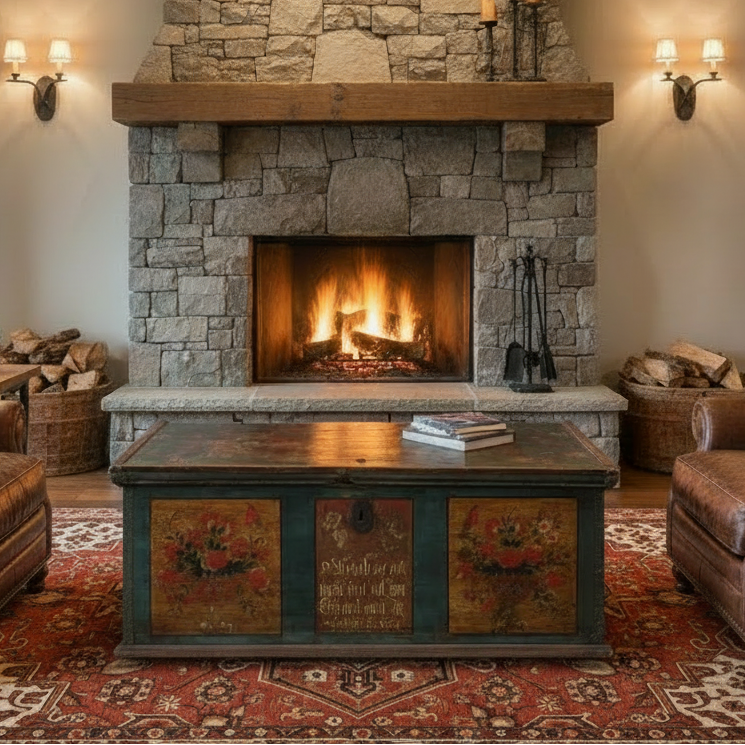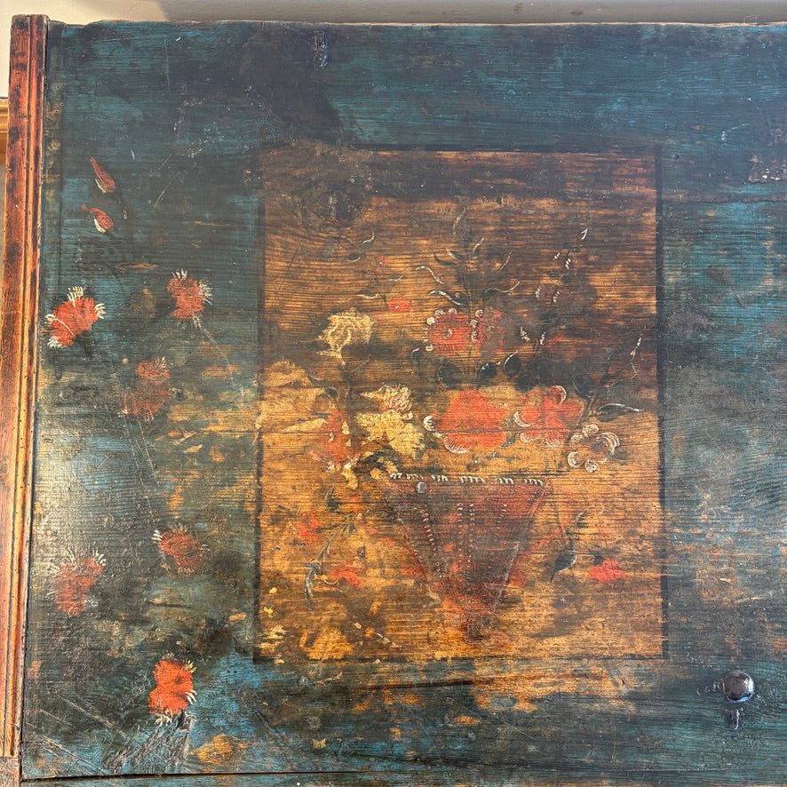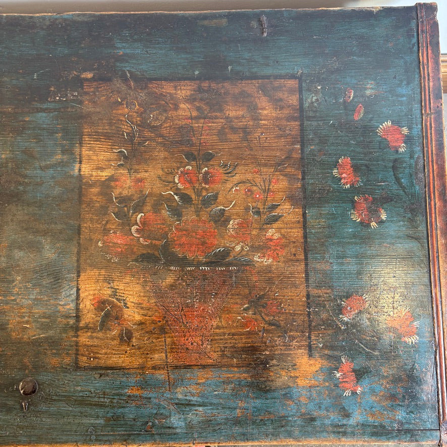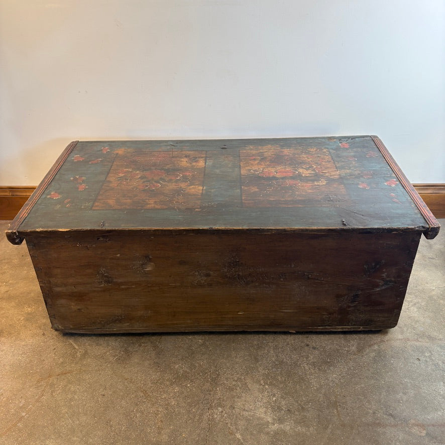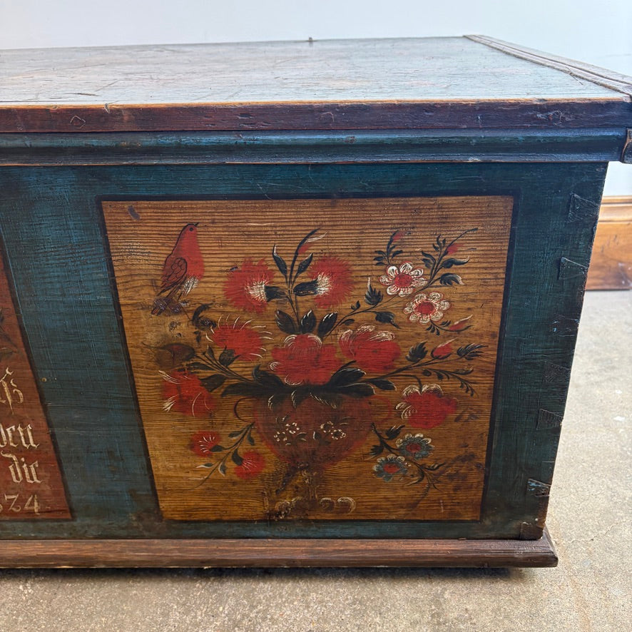 1874 German Antique Blanket Chest, Inscription translates to "O human, do not forget what matters to you; think of your soul, death, and eternity."