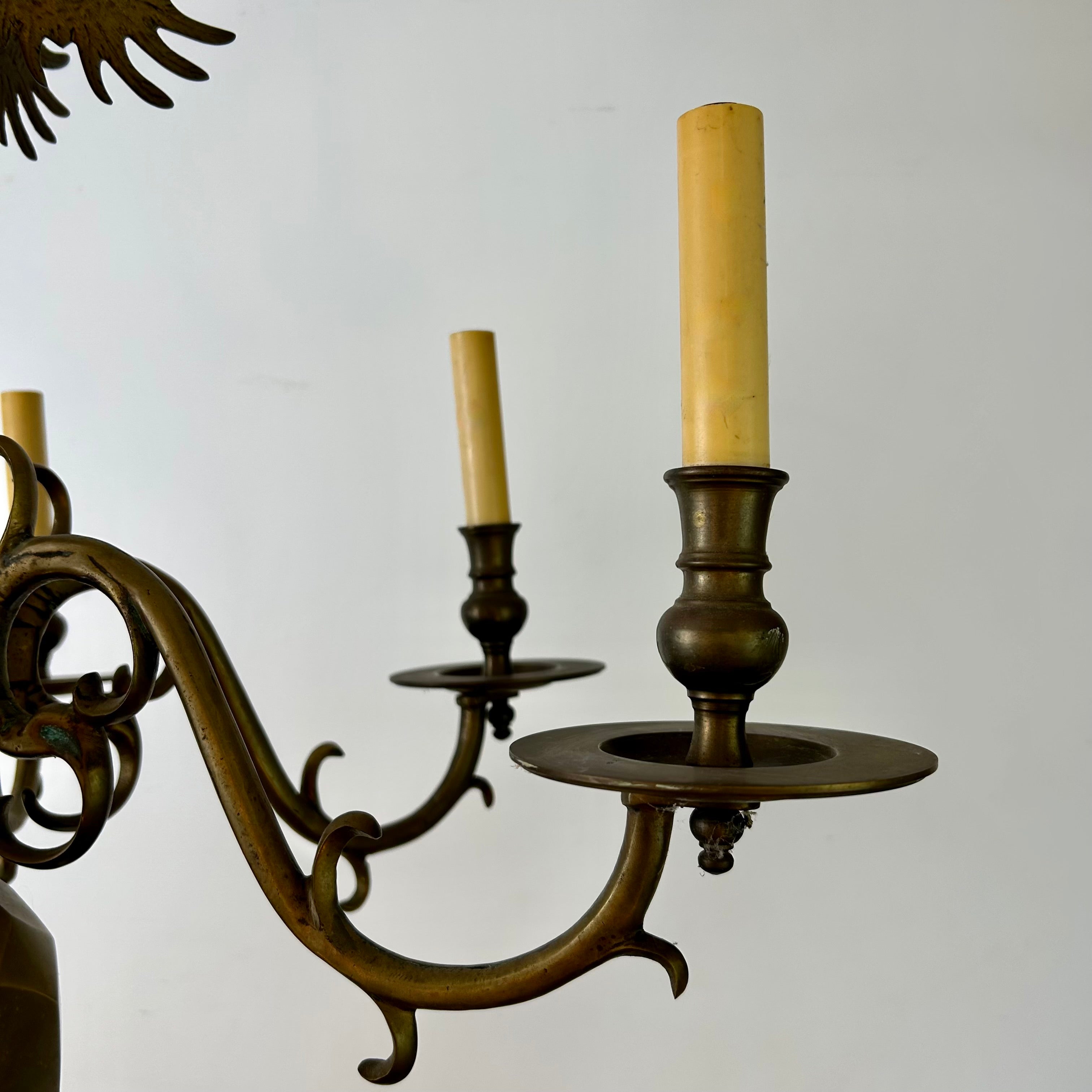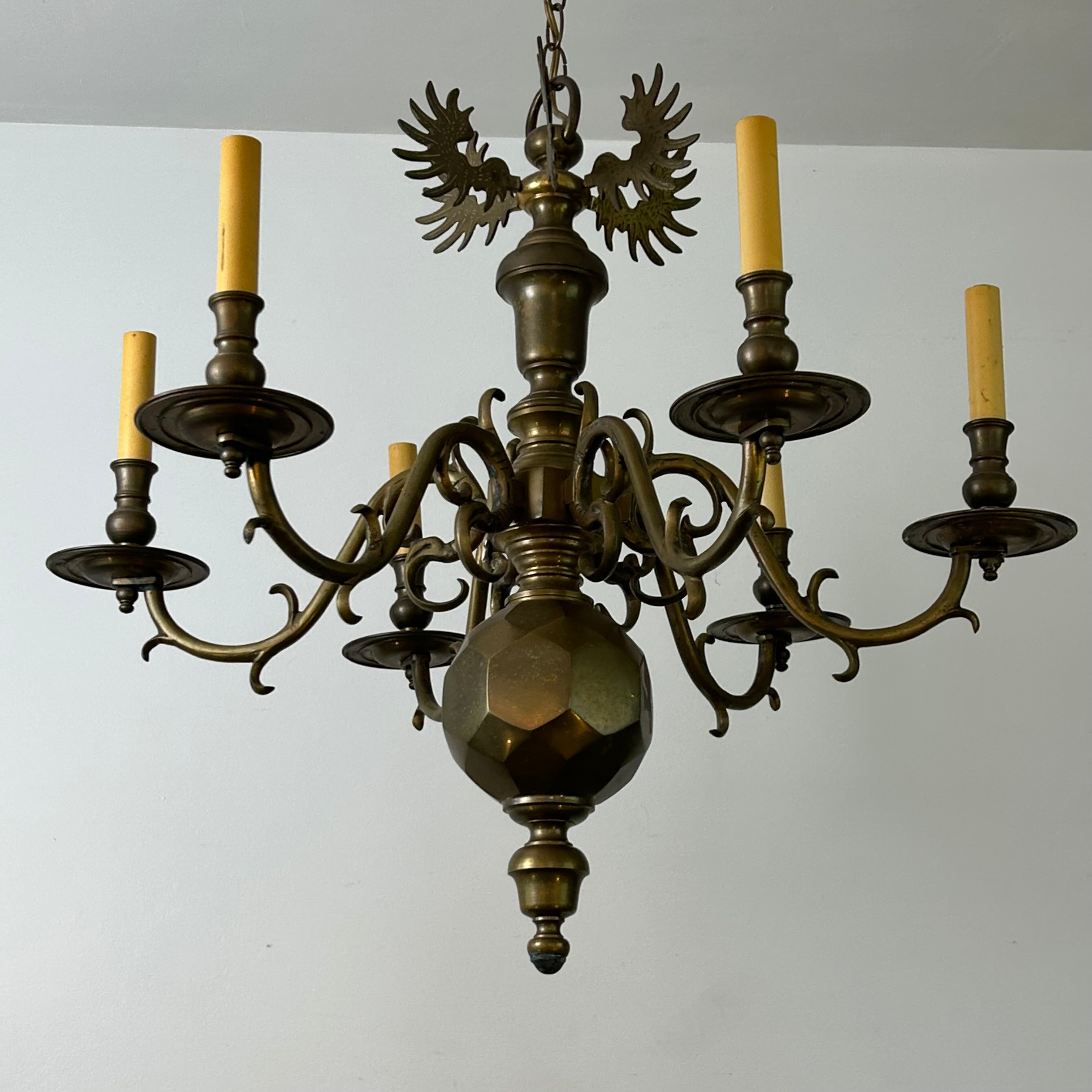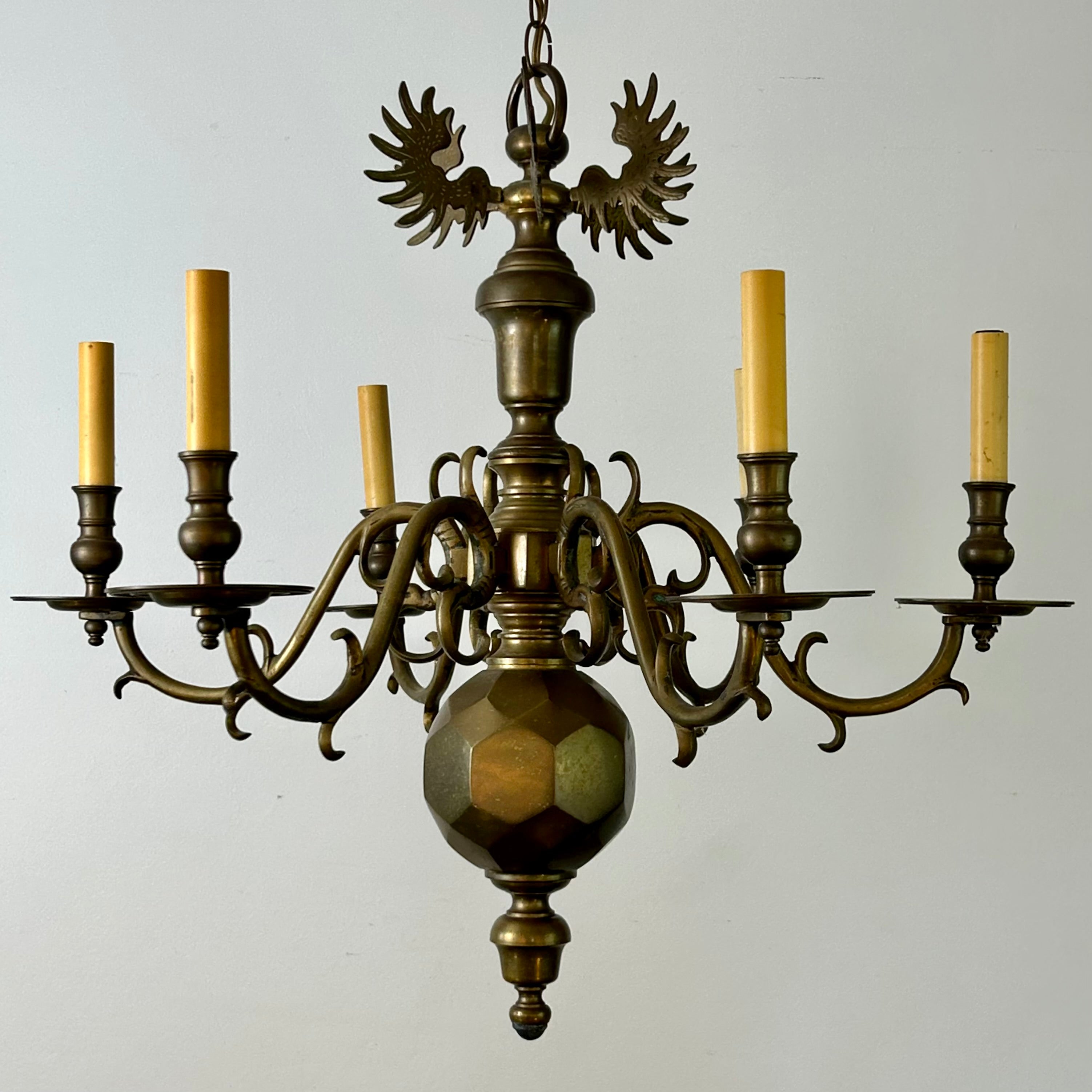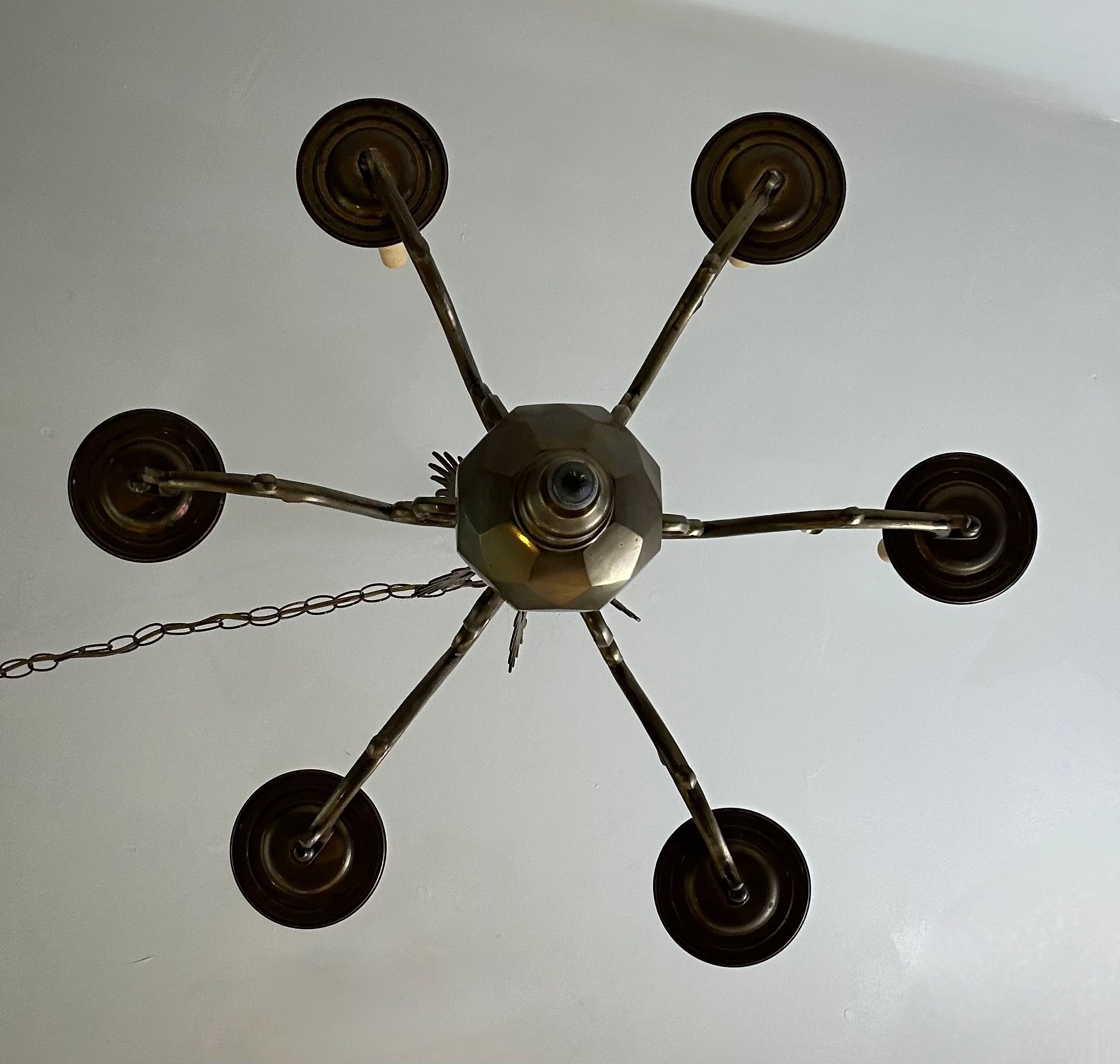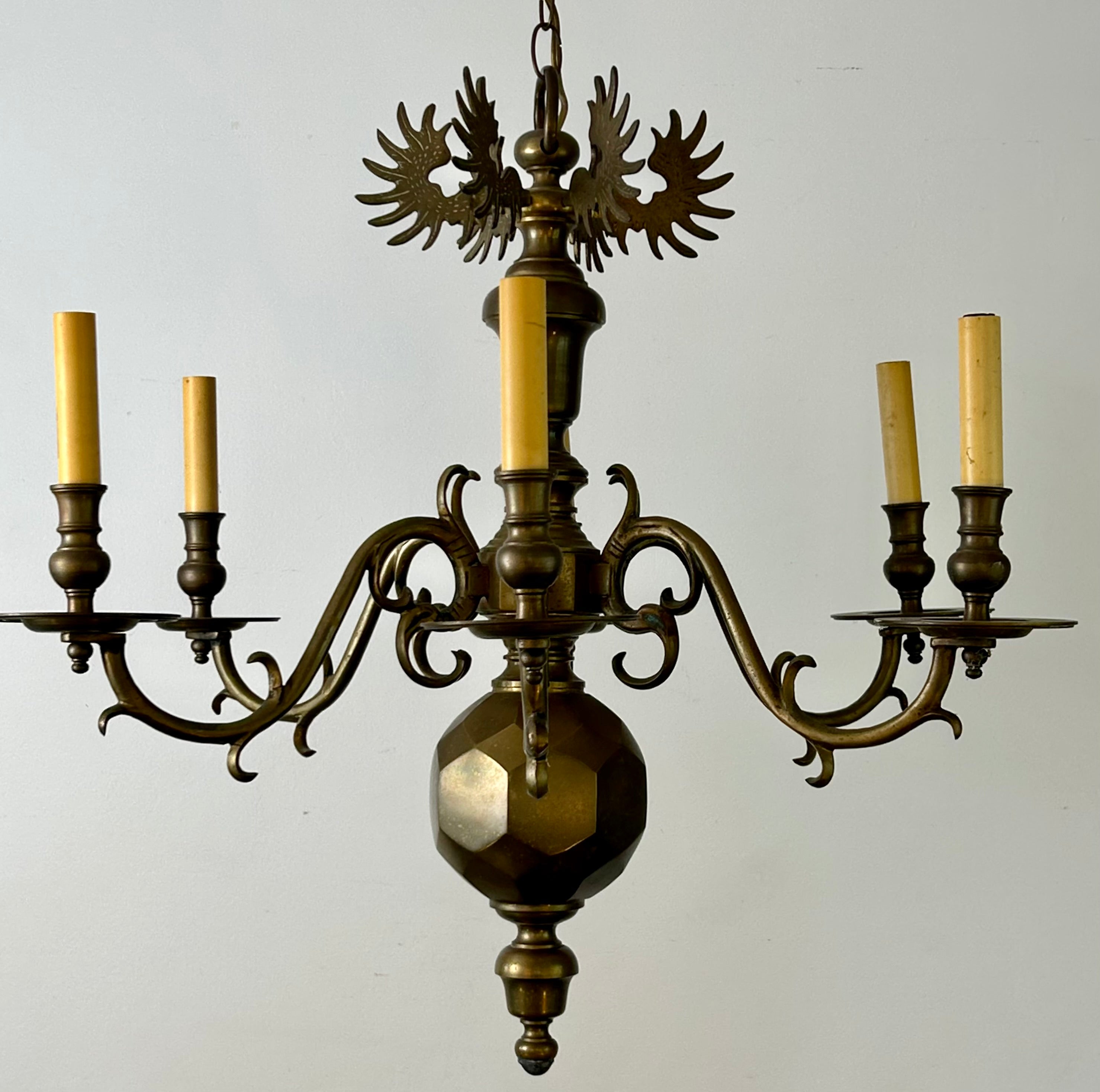 1972 Chapman Brass Chandelier, Wing Motif and Faceted Globe Detail, Six Arm.