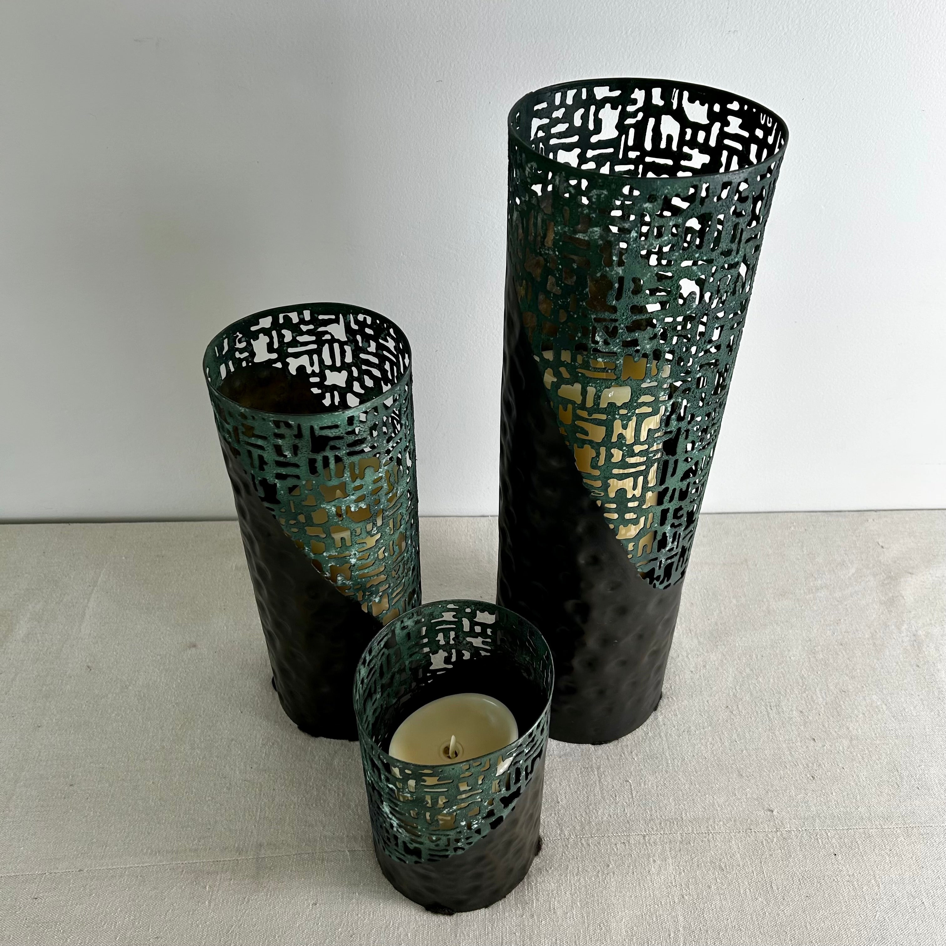 Set of three faux candle holders in darl green with black pounded metal base. They stand at different heights.