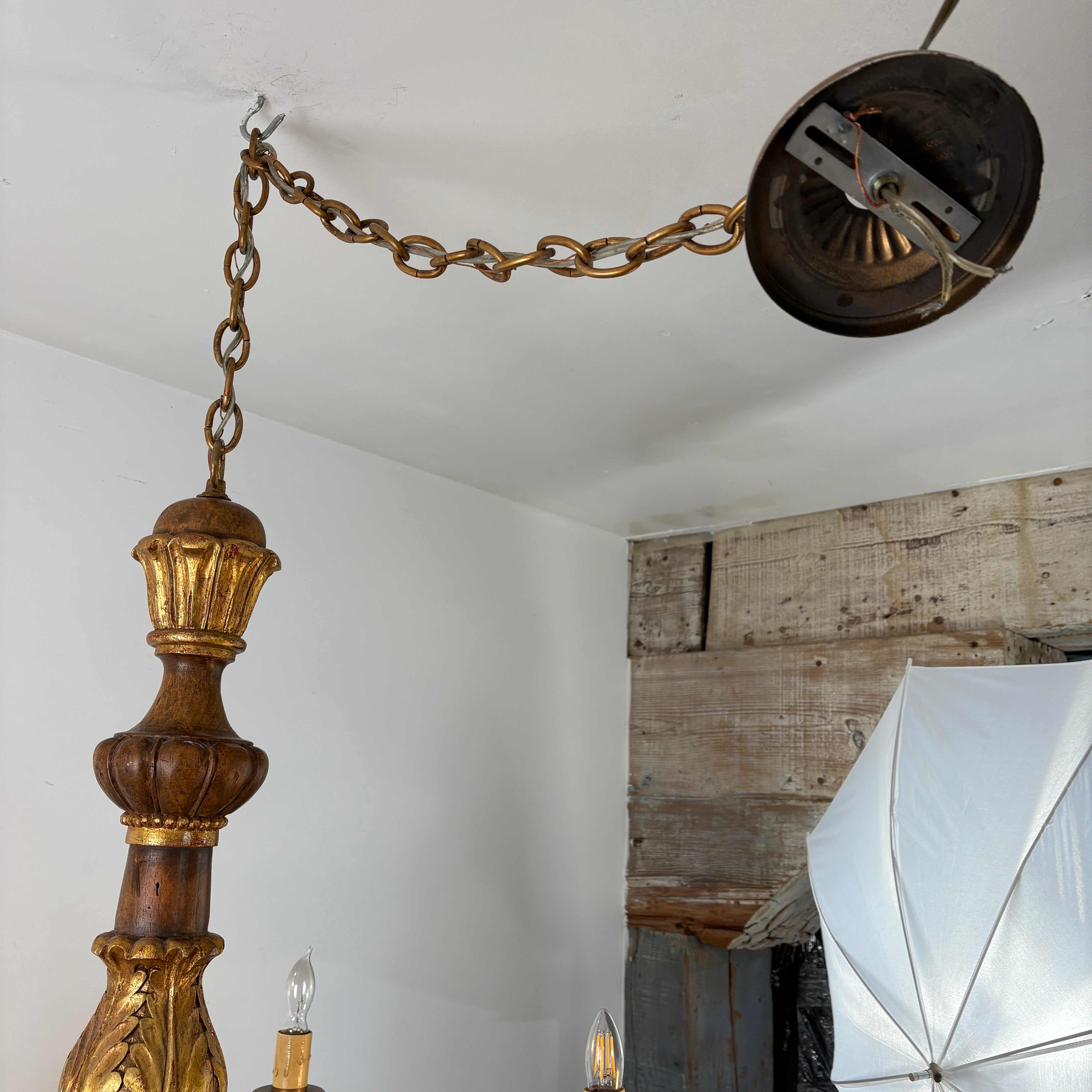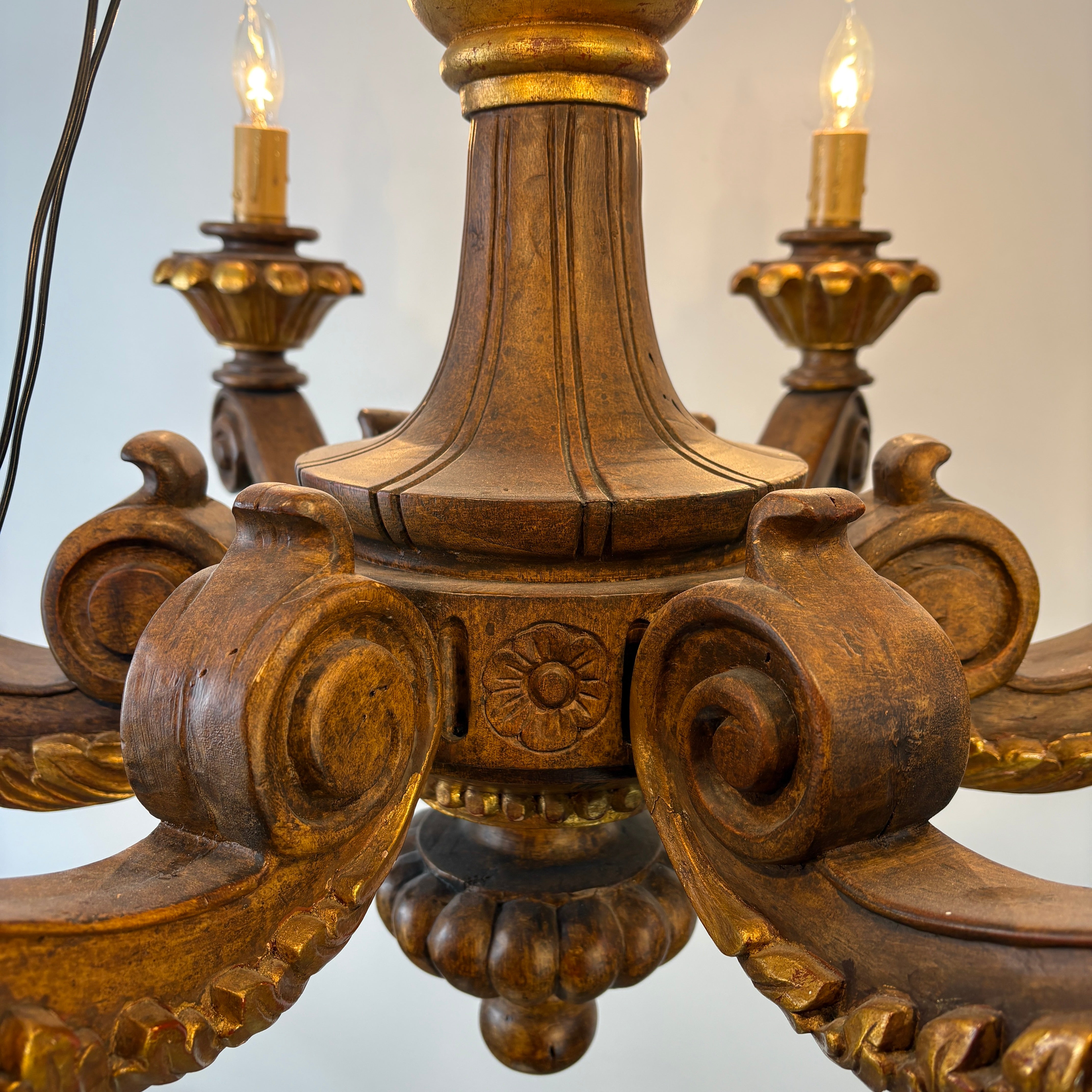 6 Arm Chandelier in Wood with Golden Accents, Hand Carved Wood.