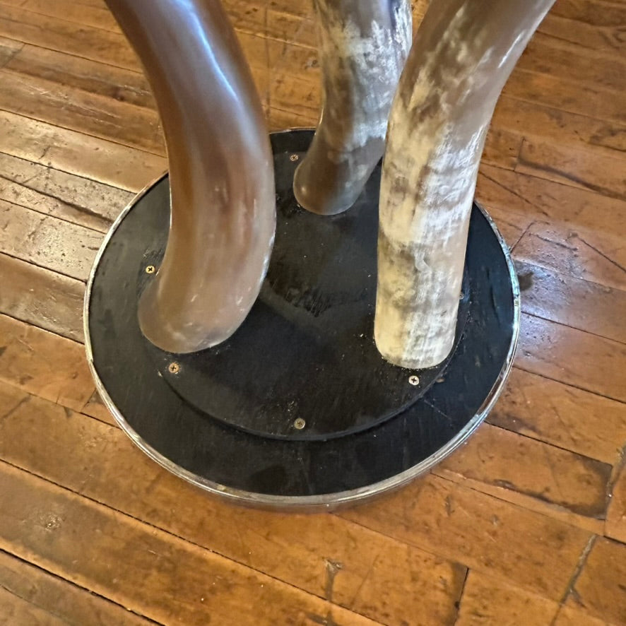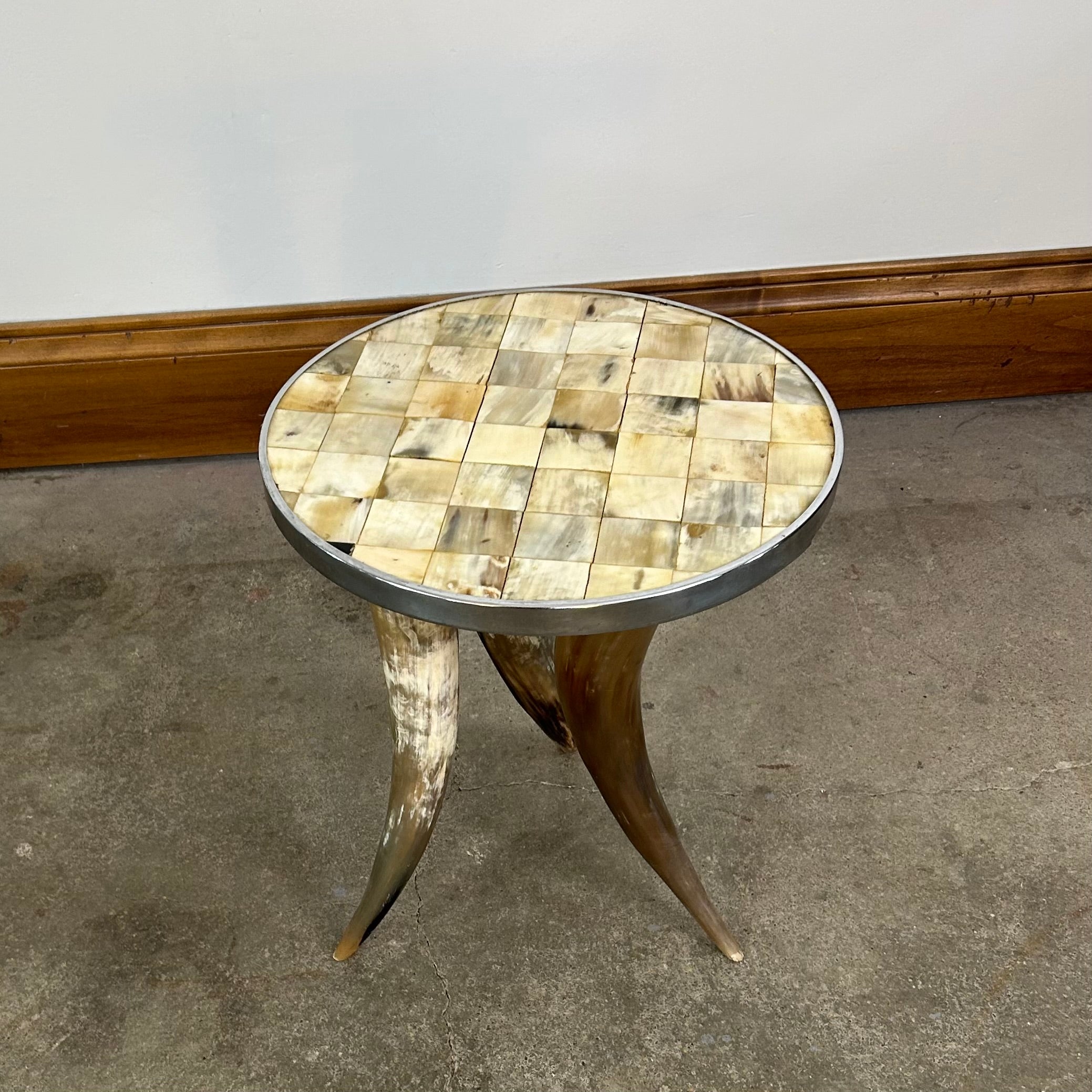 Handcrafted steer-horn three legged round accent table with horn mosaic top that has a metal edge.