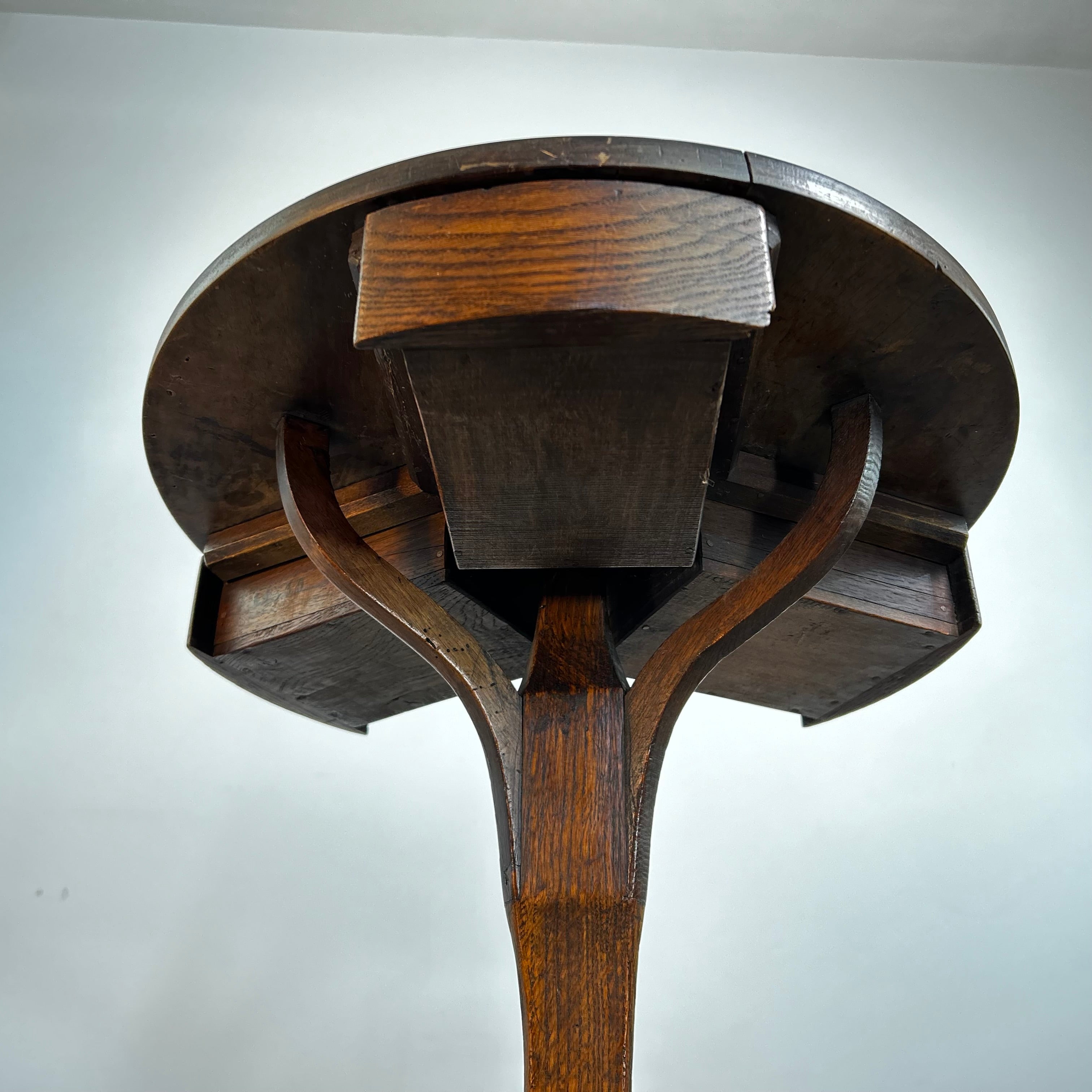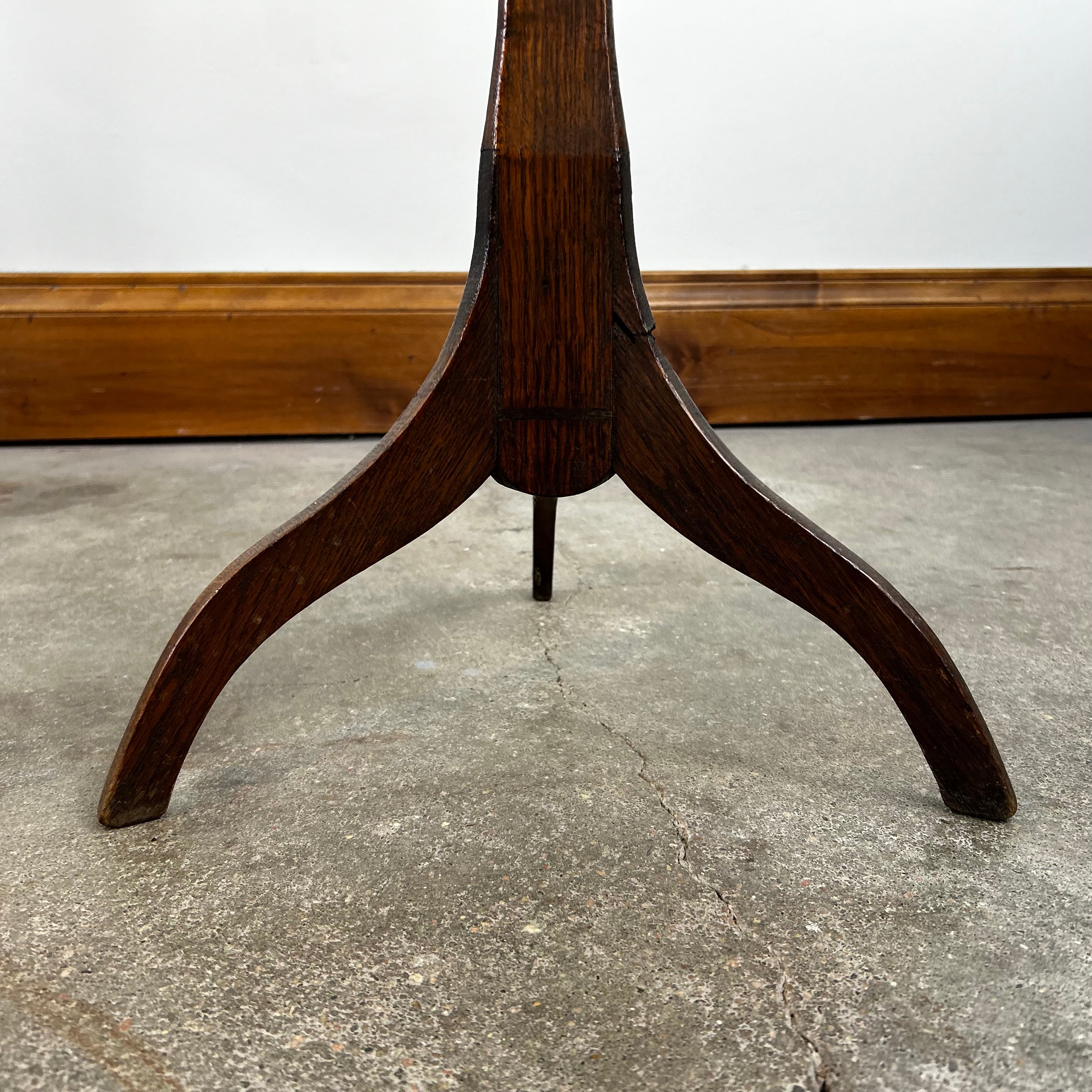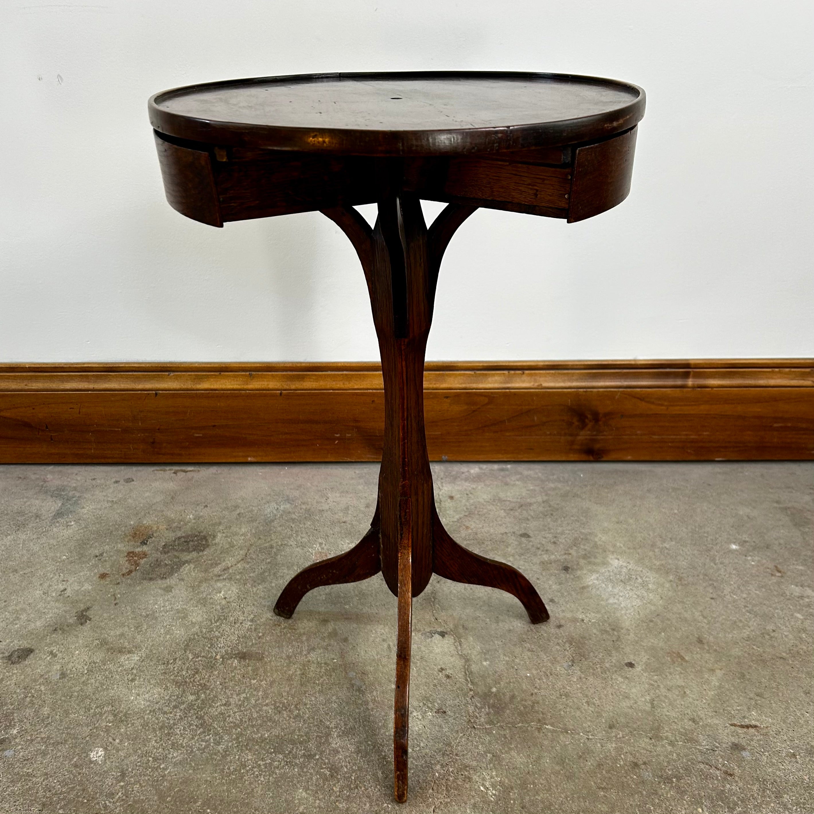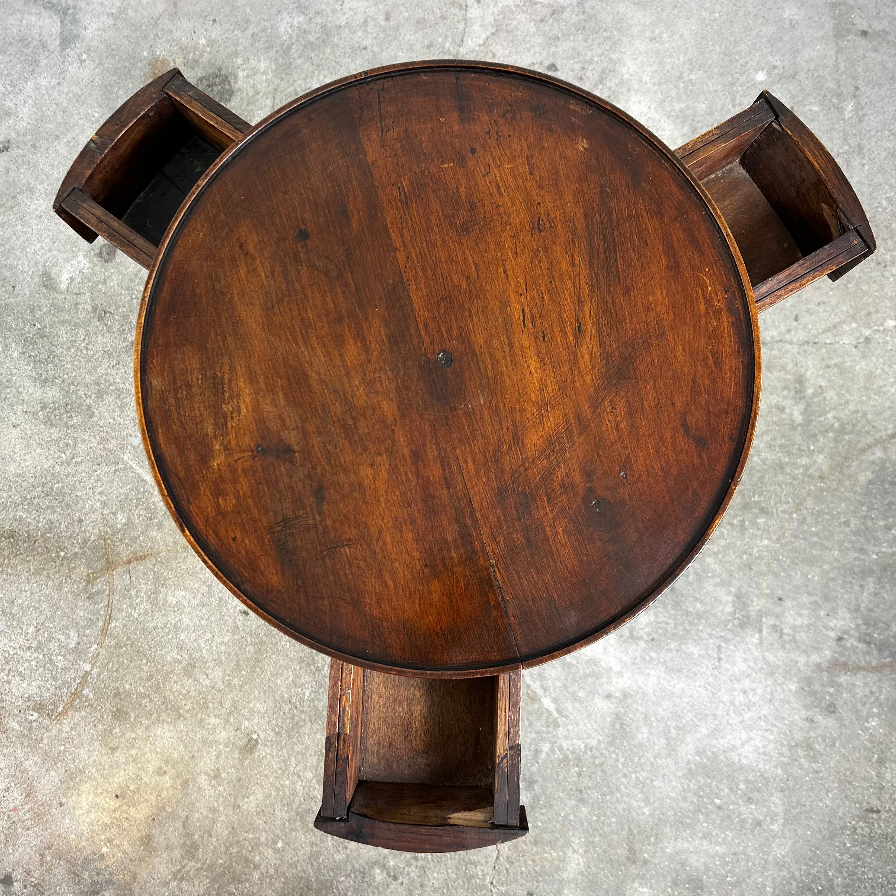 Featuring a vintage design and solid wood construction, this accent pedestal table is perfect for smaller spaces. Equipped with three drawers, it offers both style and functionality. Darkly stained.