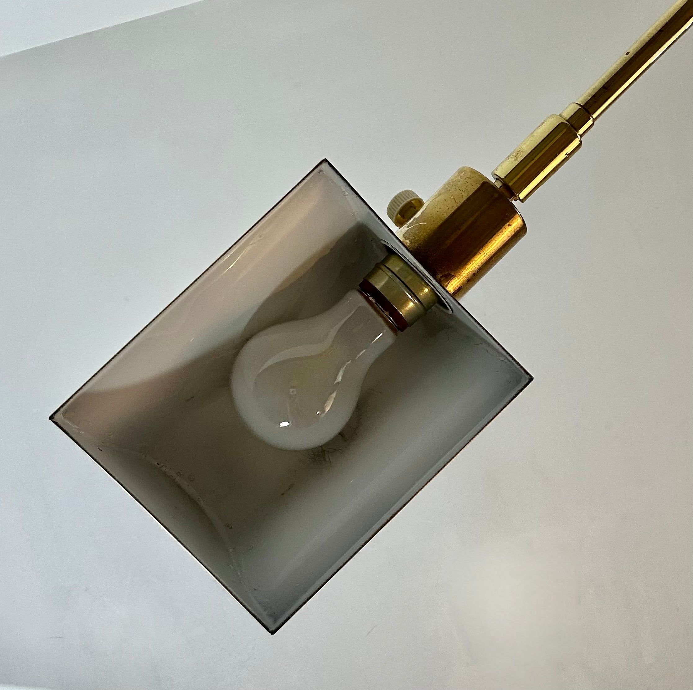 Brass floor lamp, adjustable height and swivel top in brass & Lucite, pharmacy style.