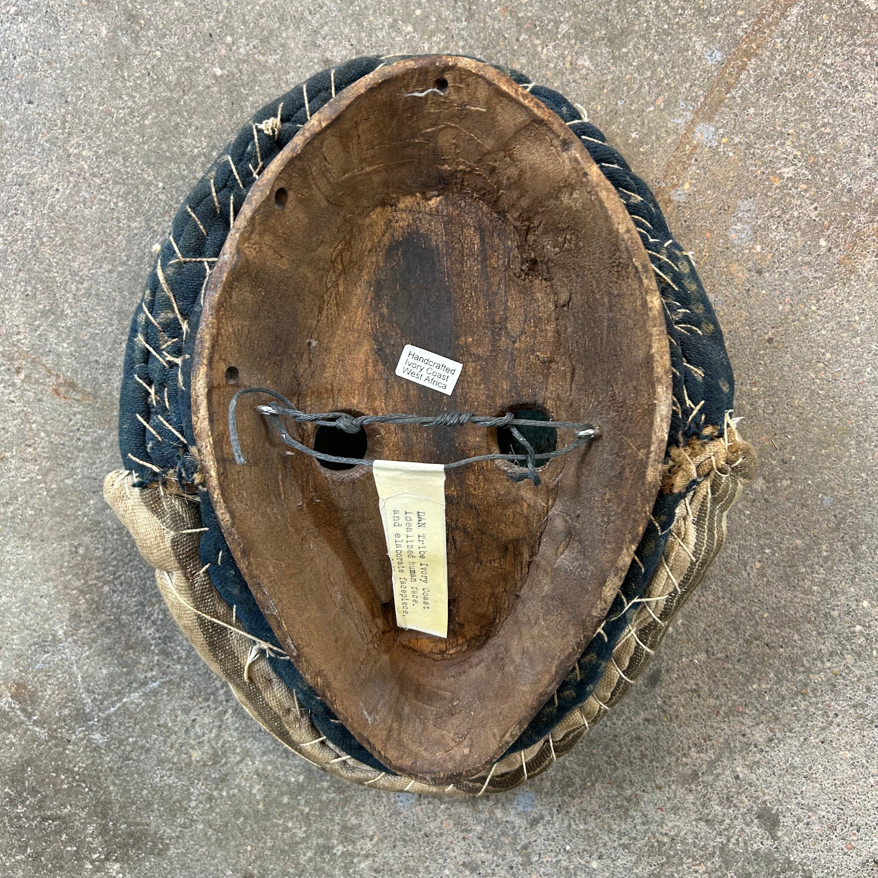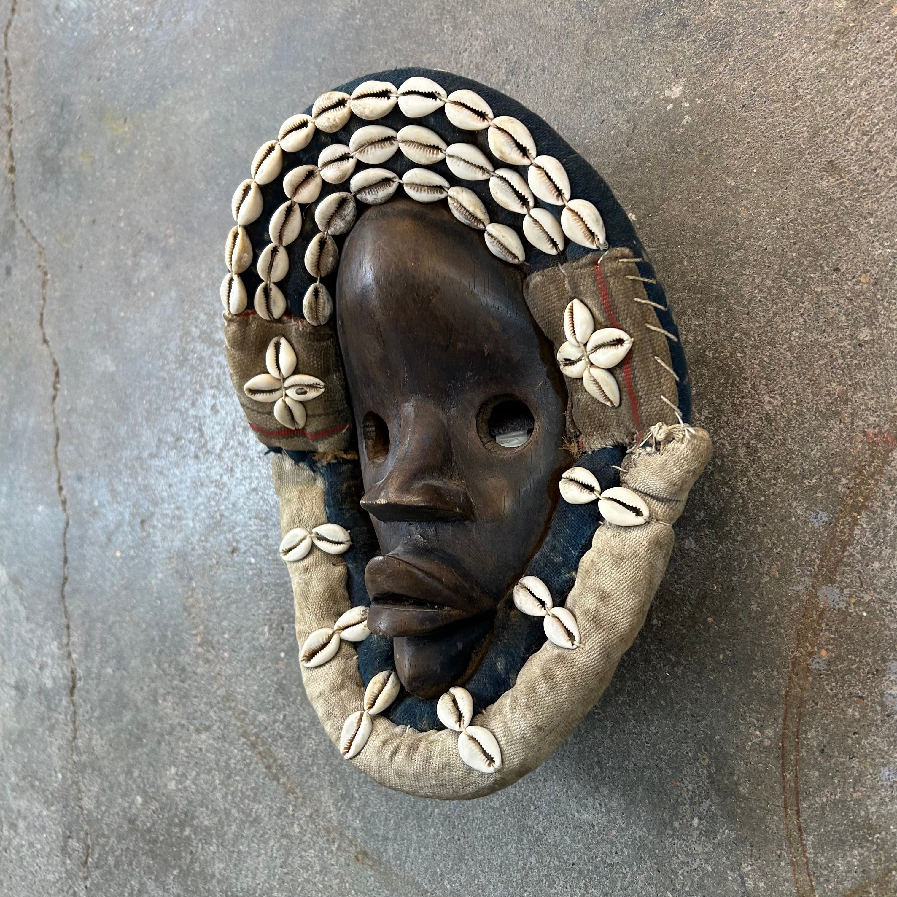 African Mask from the Ivory Coast, hand carved in wood with linen fabric, and ornamental small shells. It has a wire on the back for hanging.