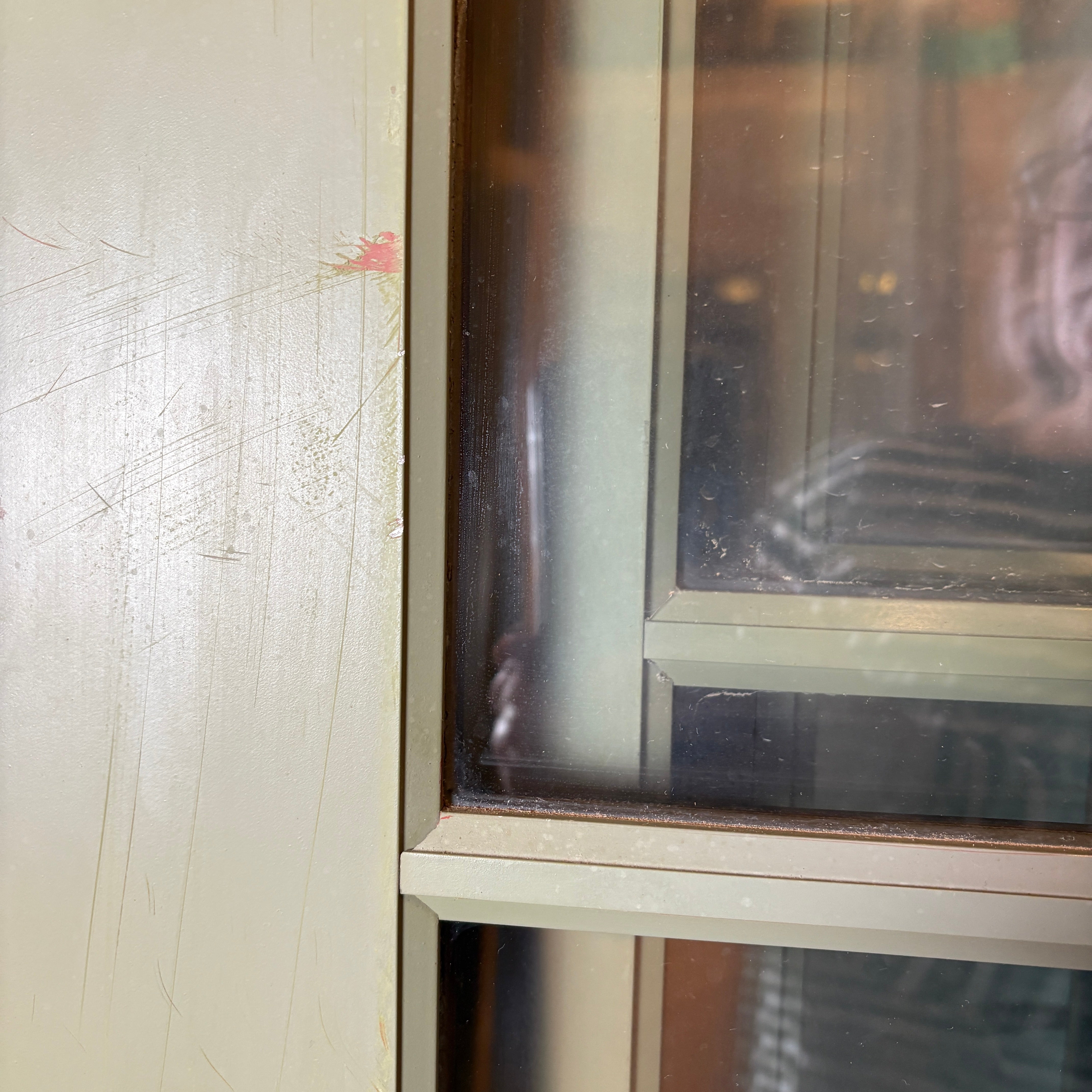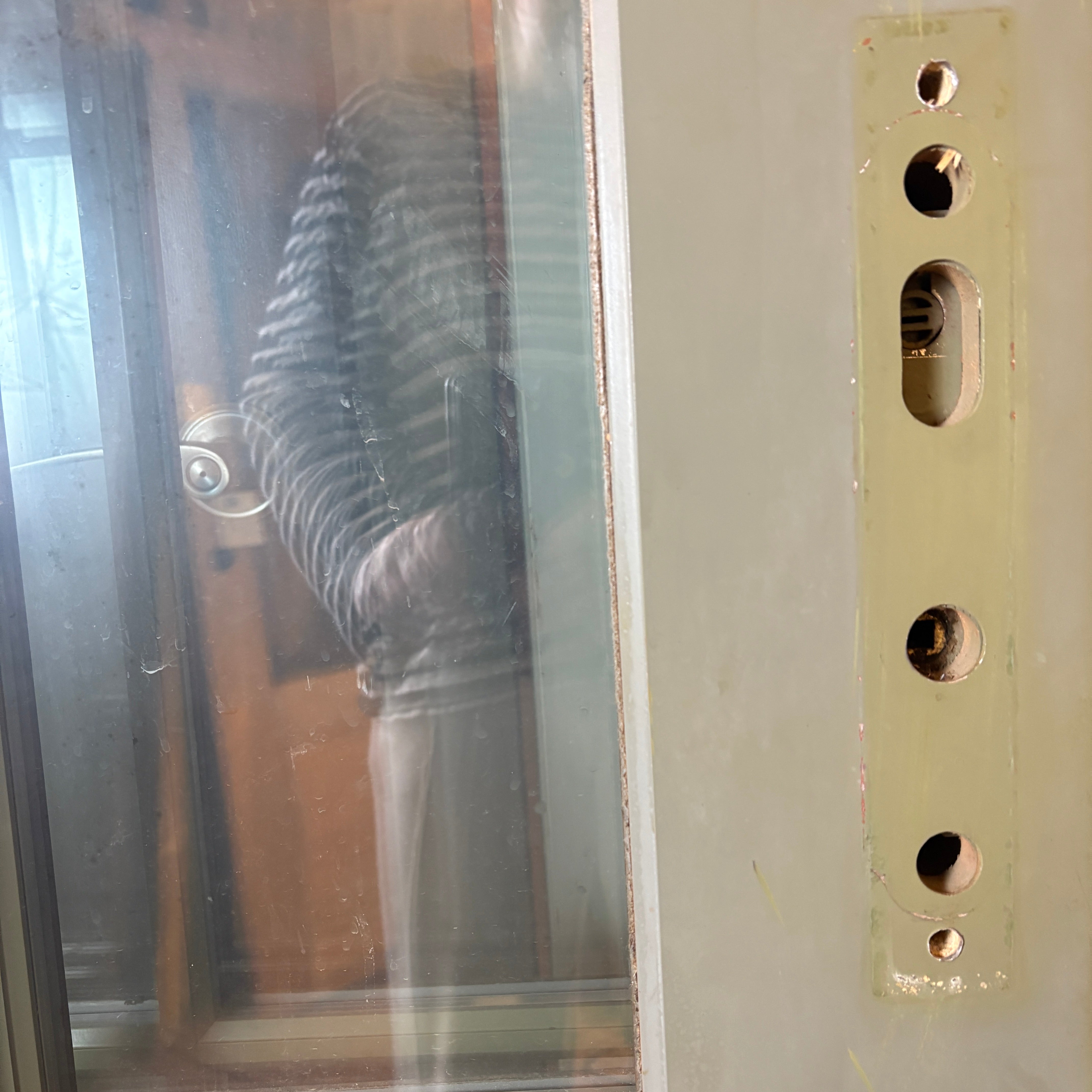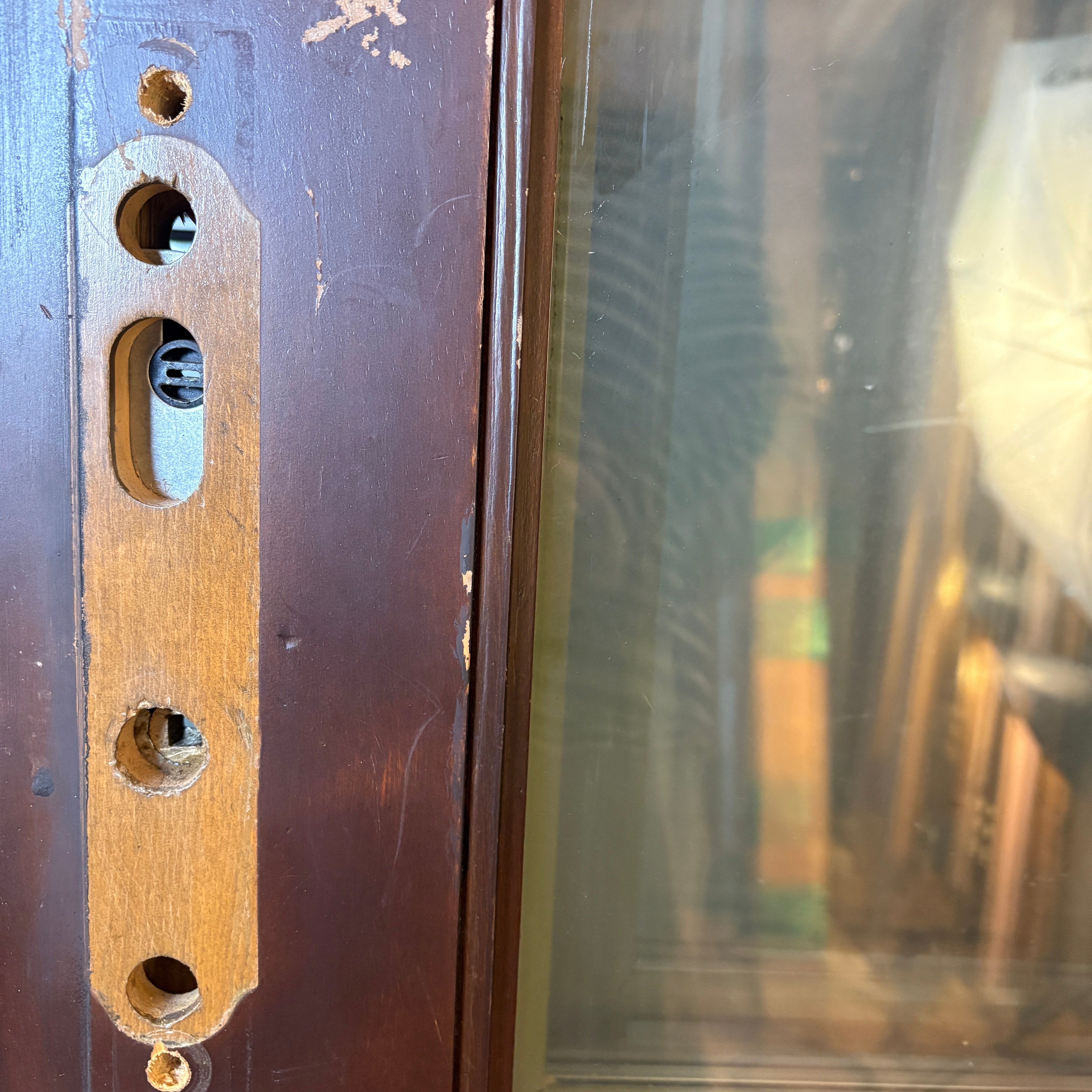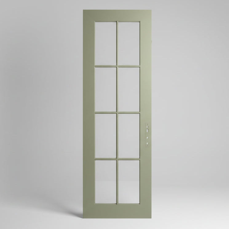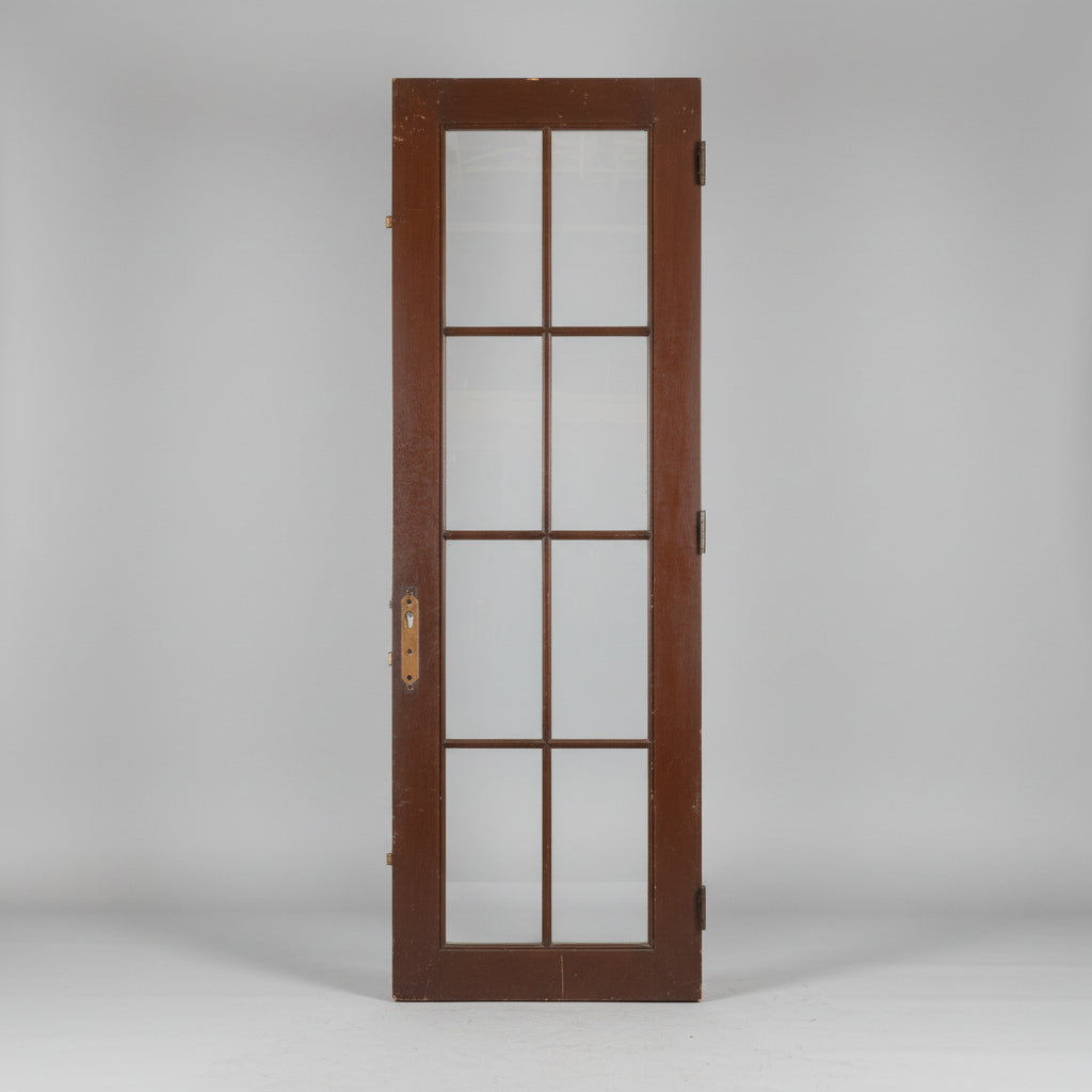 Aluminum Clad Exterior Door, Painted Light Green. Brown Stained on Interior Side. Eight Panels. No Jamb. Note: this has a partner plus an extra although we are selling them individually.