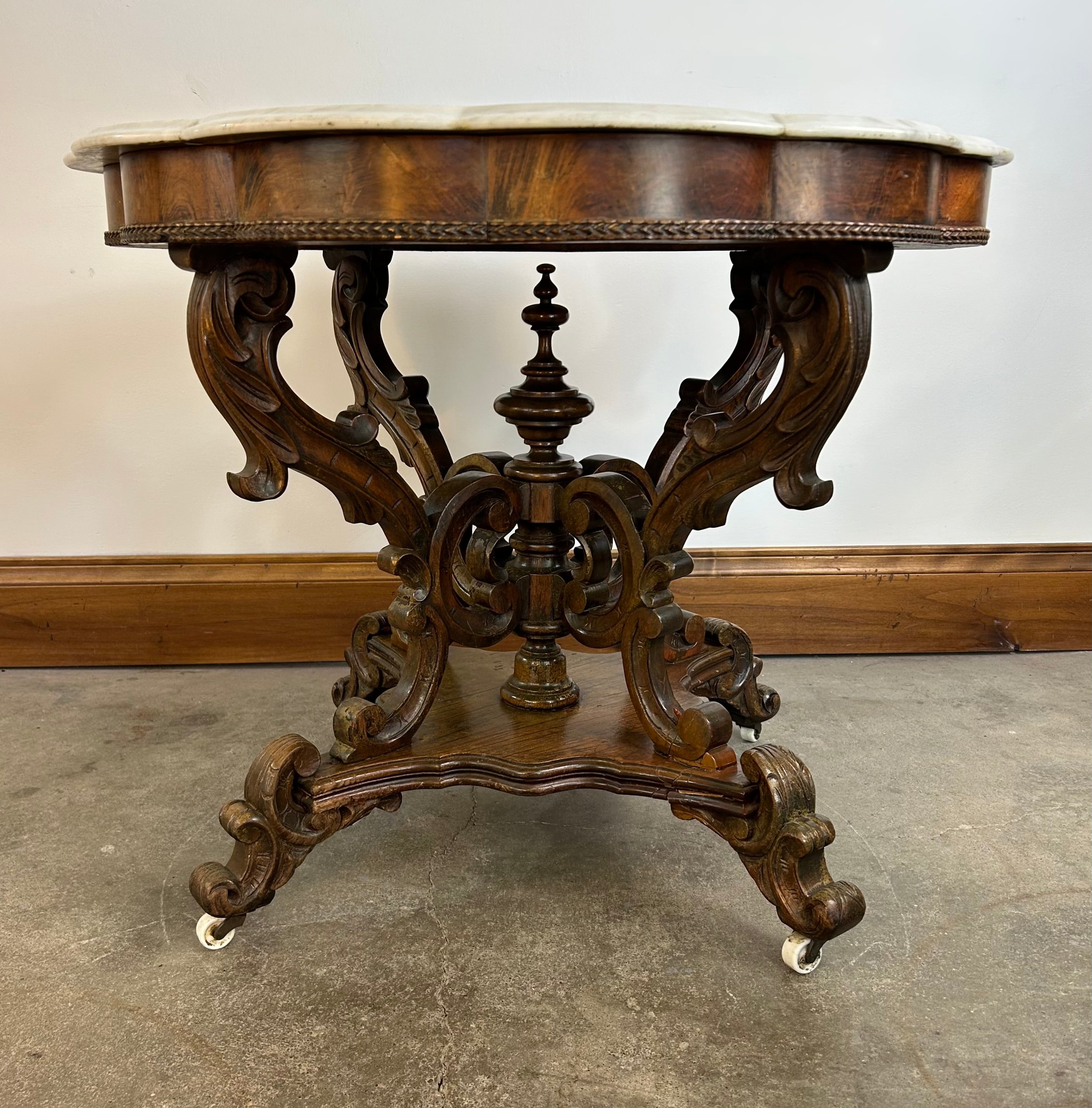 Antique scalloped white marble top parlor table or occasional table, eastlake style.