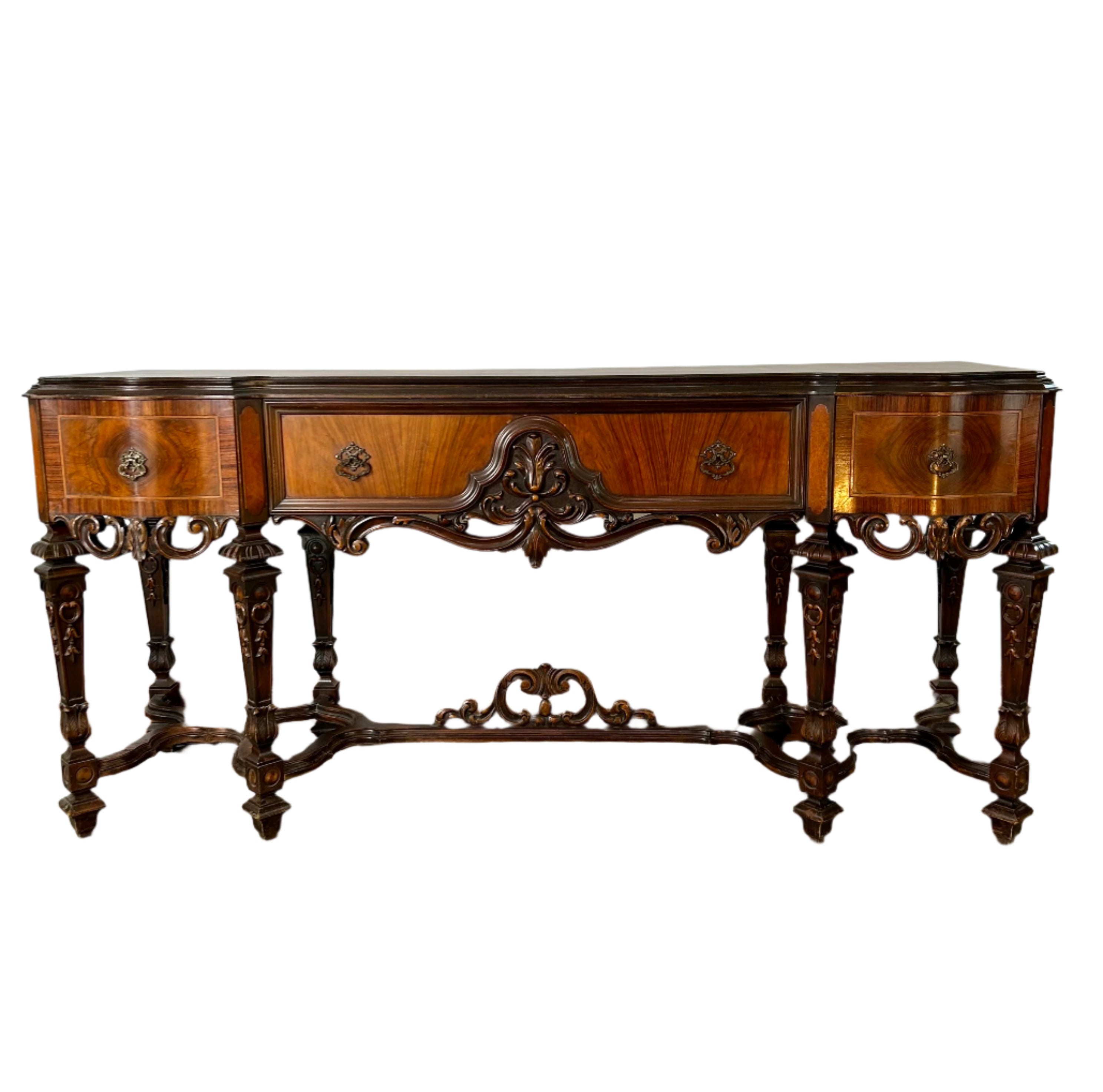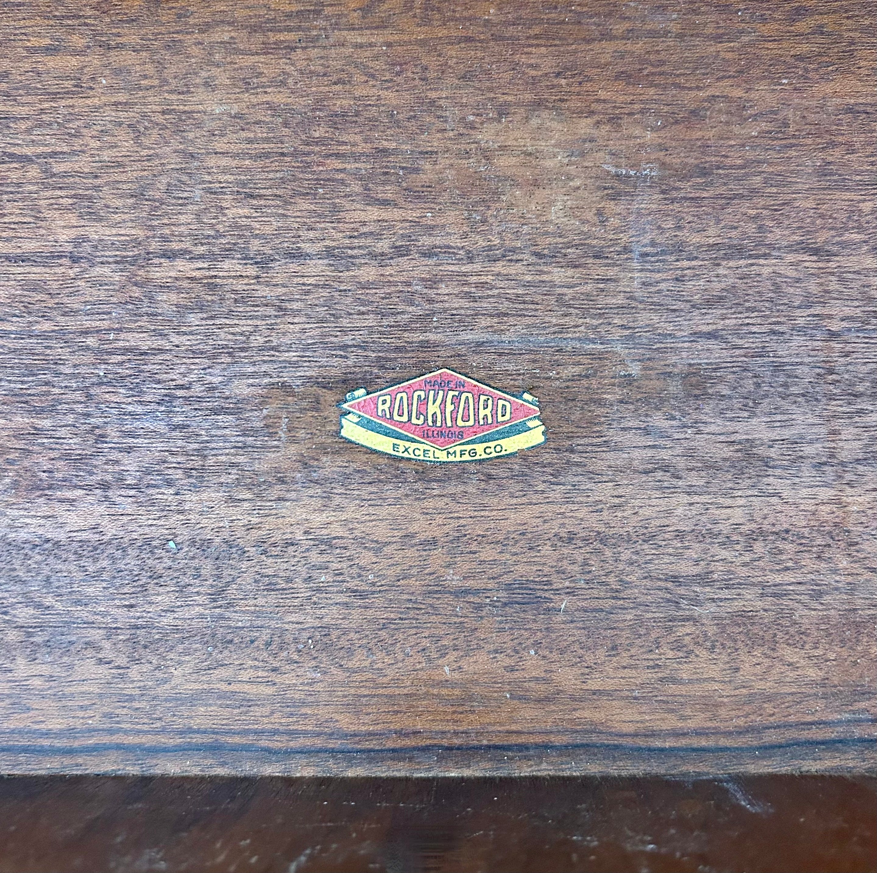 Excel Mfg. Co. of Rockford, Ill. An antique sideboard or buffet with 3 drawers, muliti-tone wood, elaborate detail.