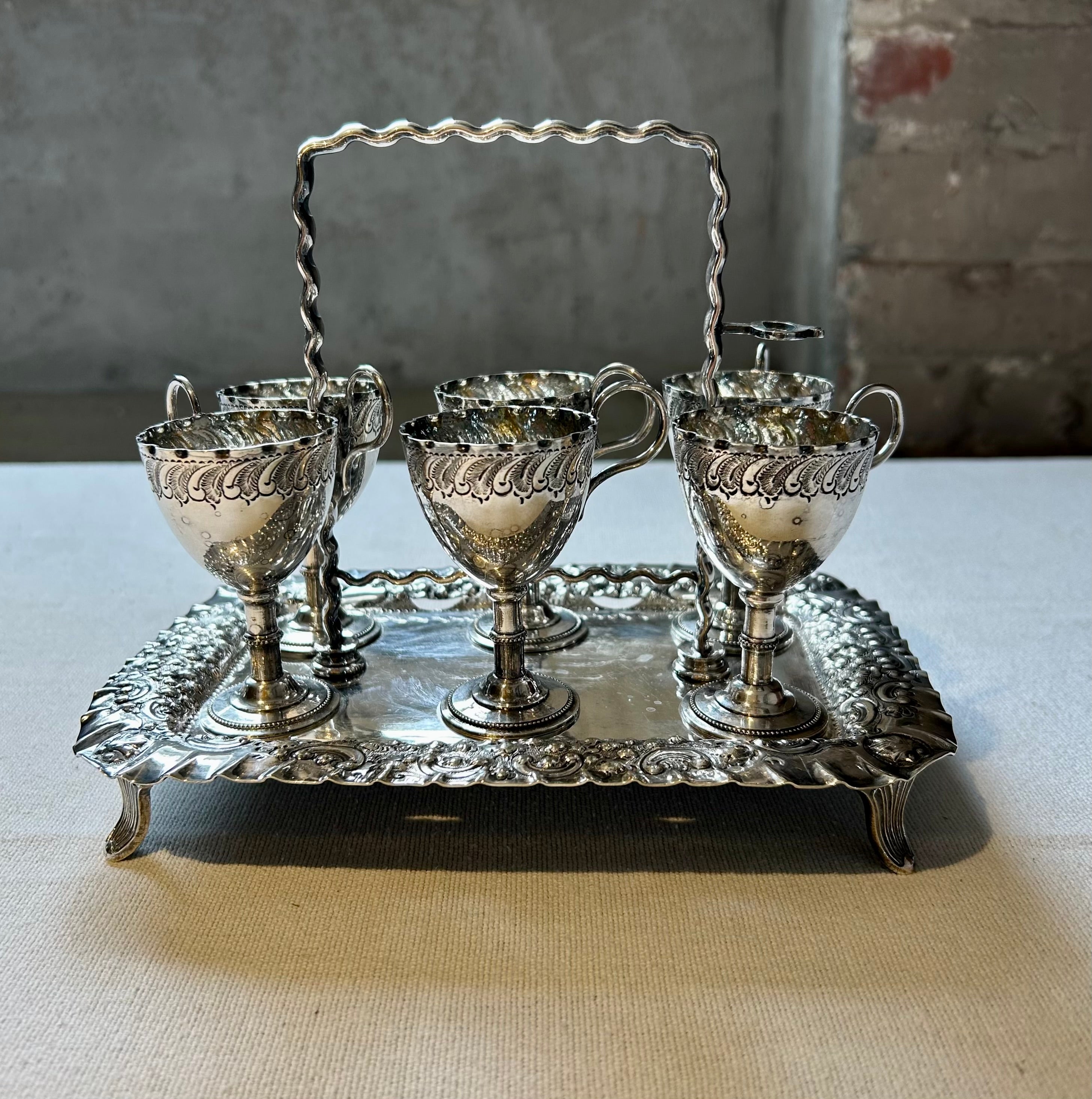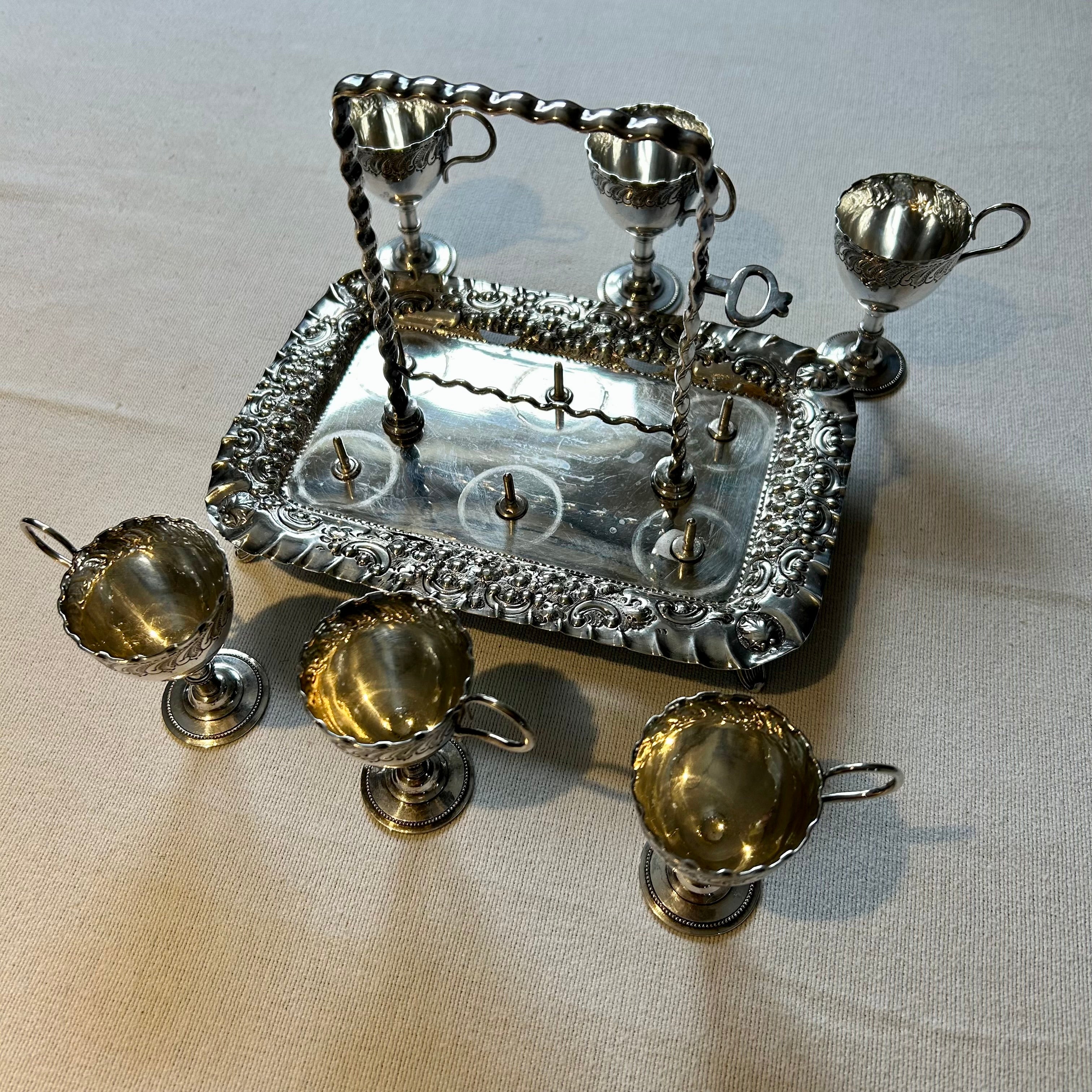 Antique victorian silver plate egg cup stand for six eggs. This heavy for its size.