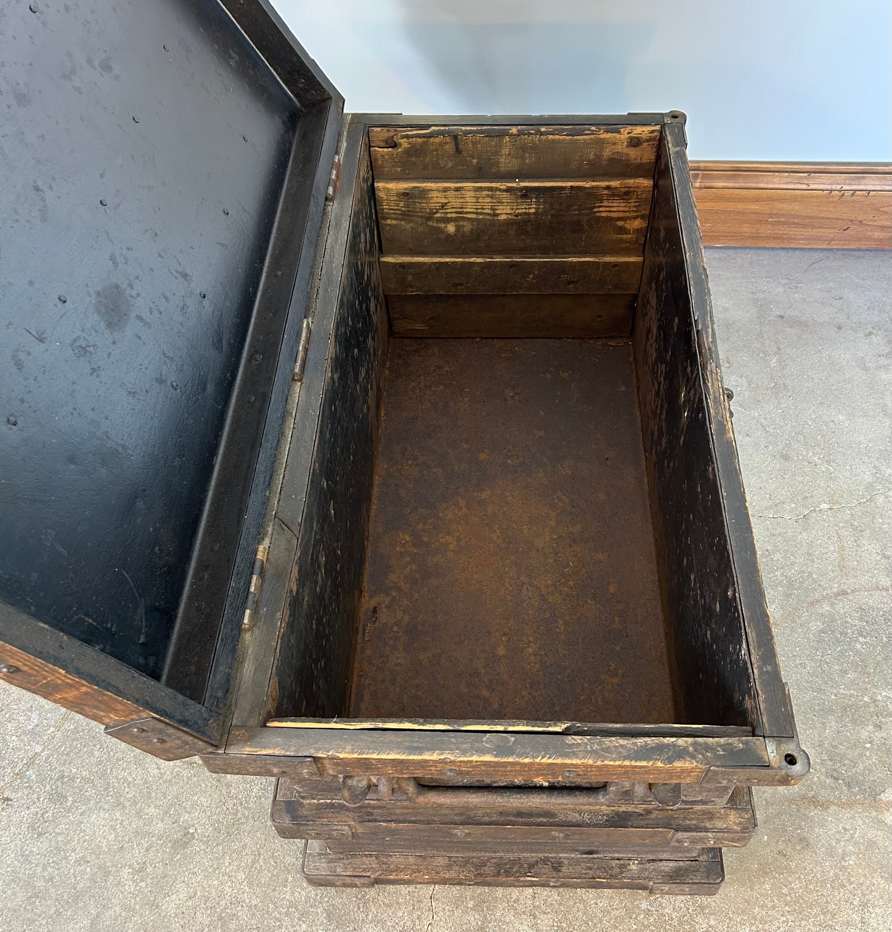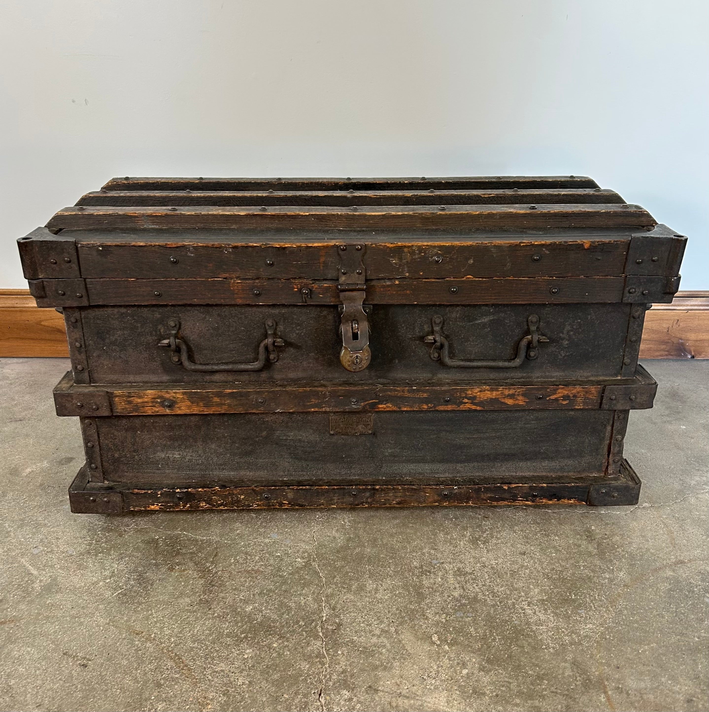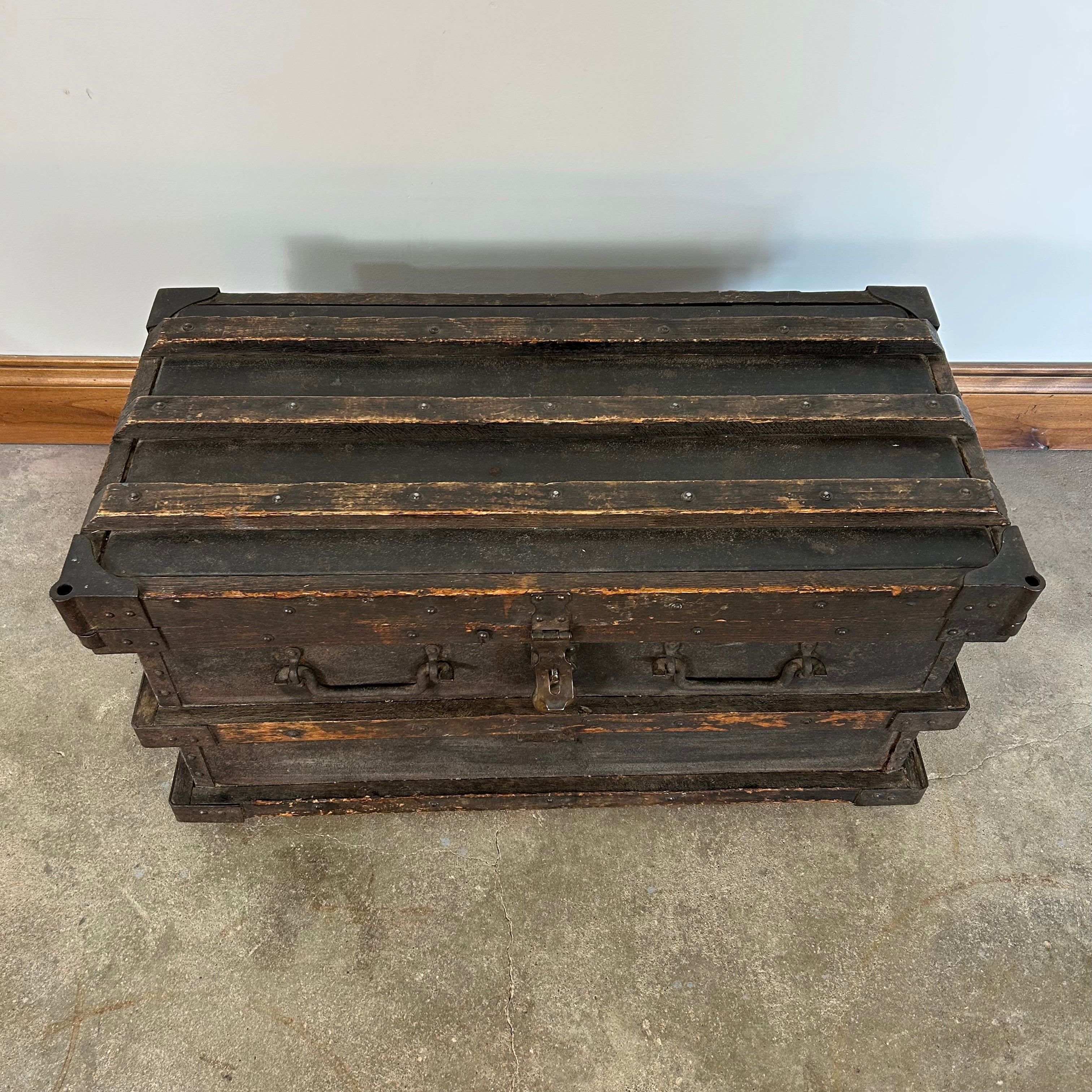 Antique trunk, wood with iron supports and inside removable shelf. Note: it is very heavy. Note: in one gallery picture, there is a thick glass top. It is a suggestion for a coffee table, sold separately. Inquire if interested.