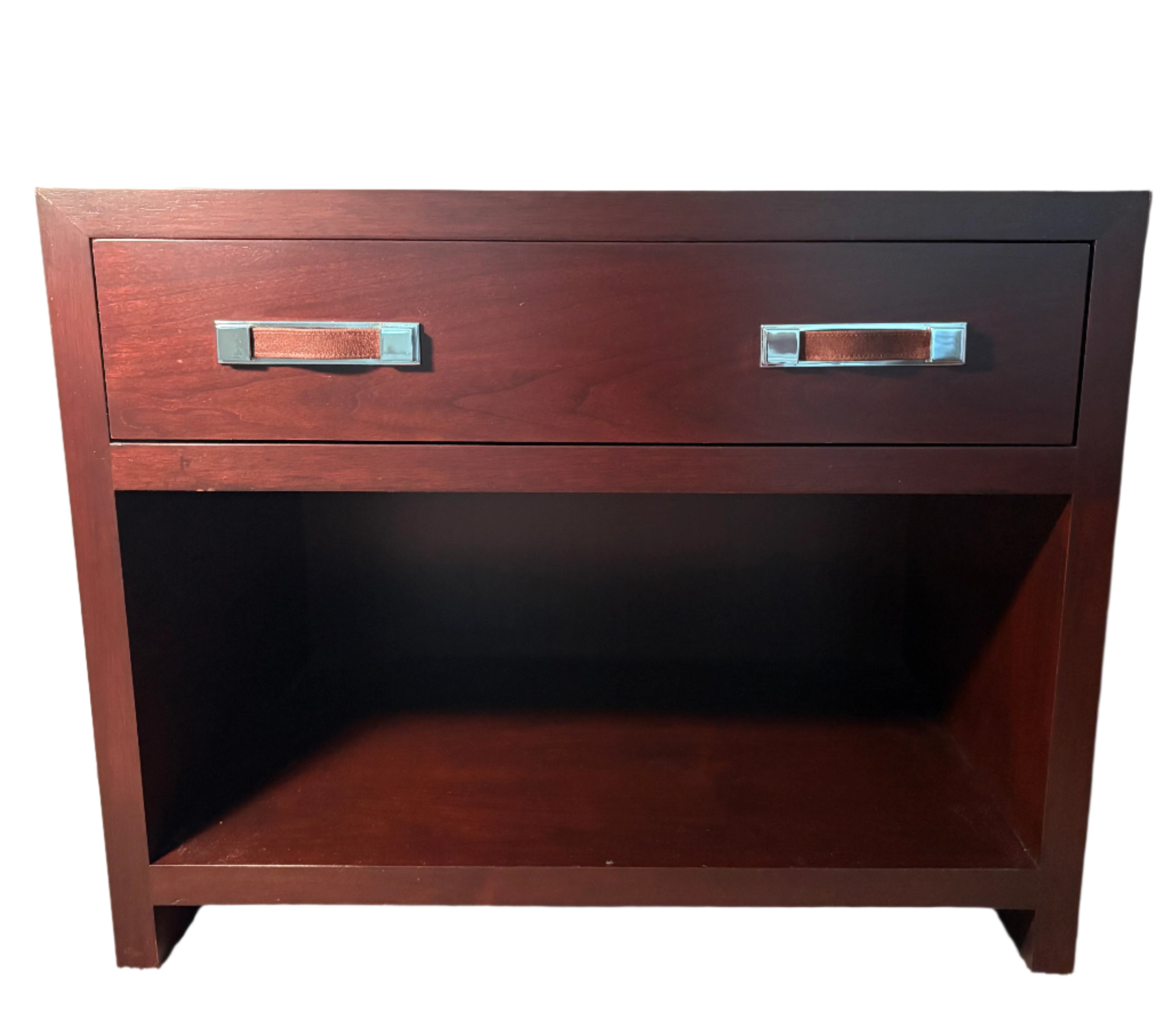 Pair Antoine Prulx night stand with two pull top drawer and lower storage. Dark mahogany stained wood. Sold as a pair.