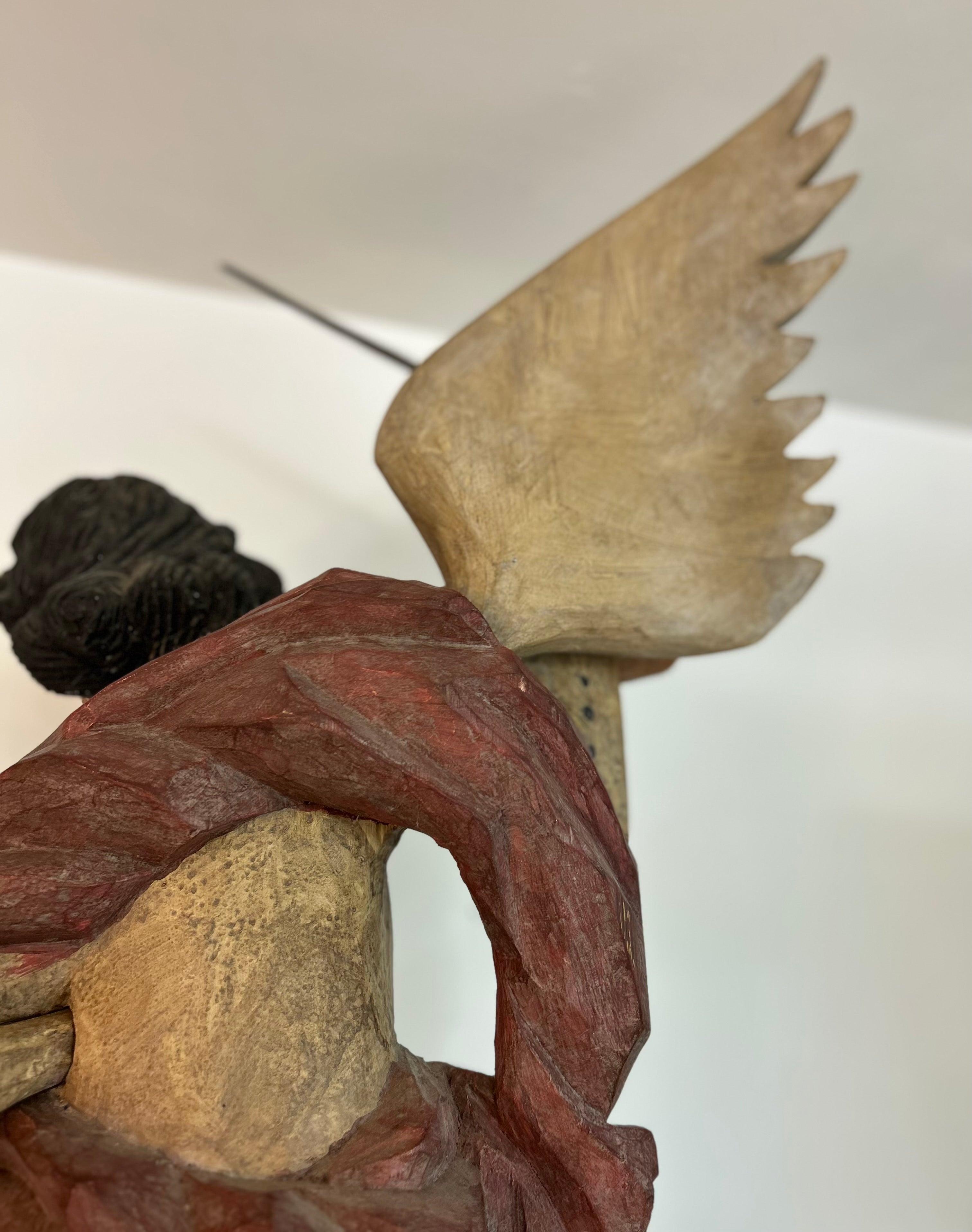Statue of winged archangel Michael battling Satan while holding a spear and scale. Hand carved wood and metal, hand painted.
