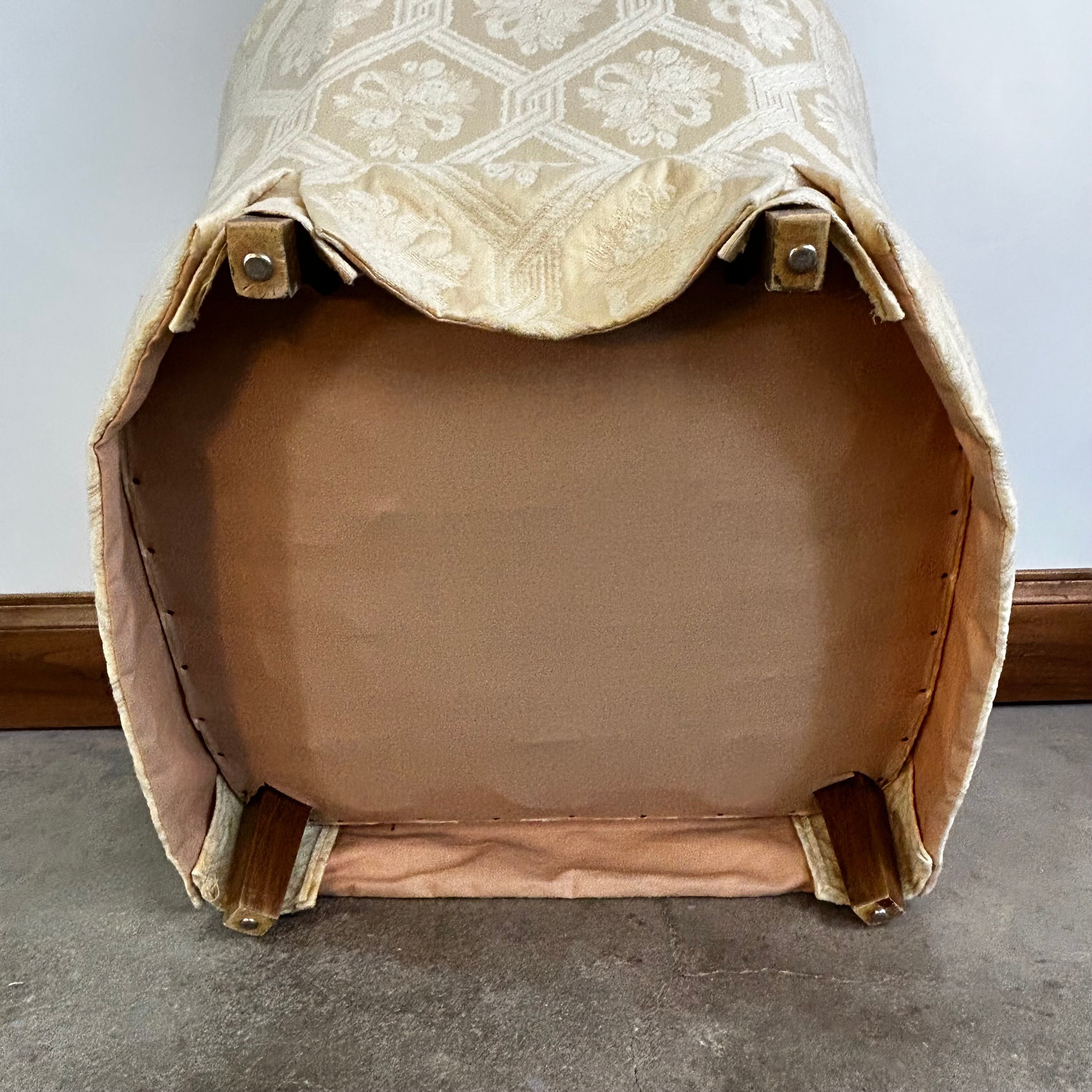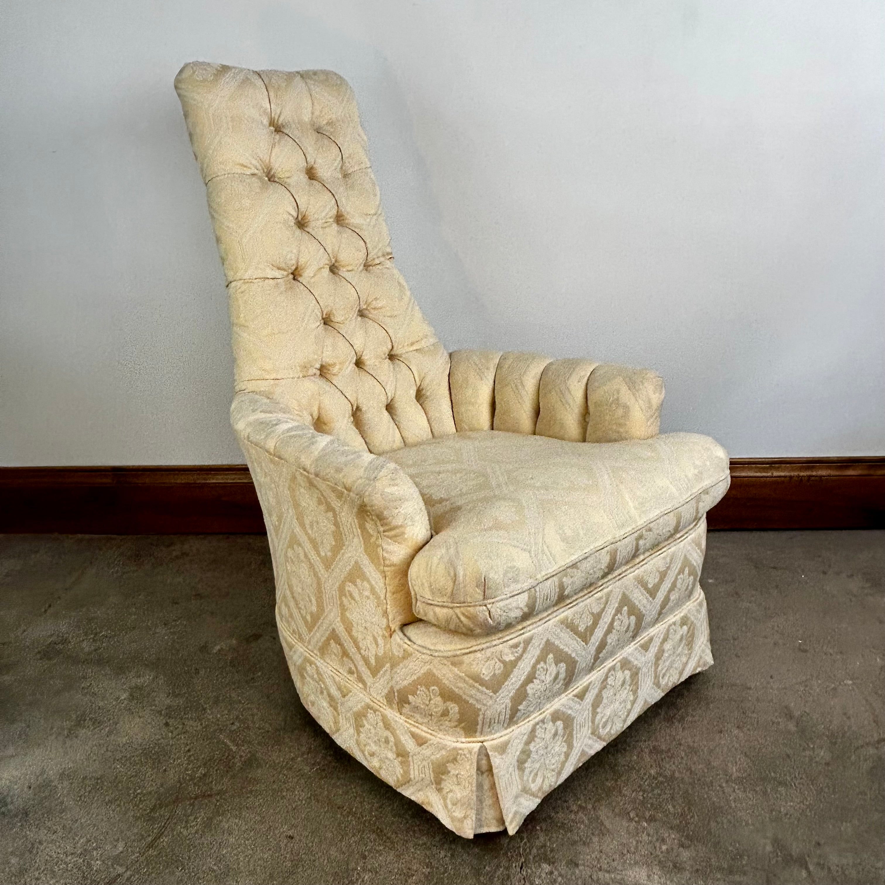 Narrow back tufted arm chair with skirt, ivory brocade upholstery. We do not know the maker name.