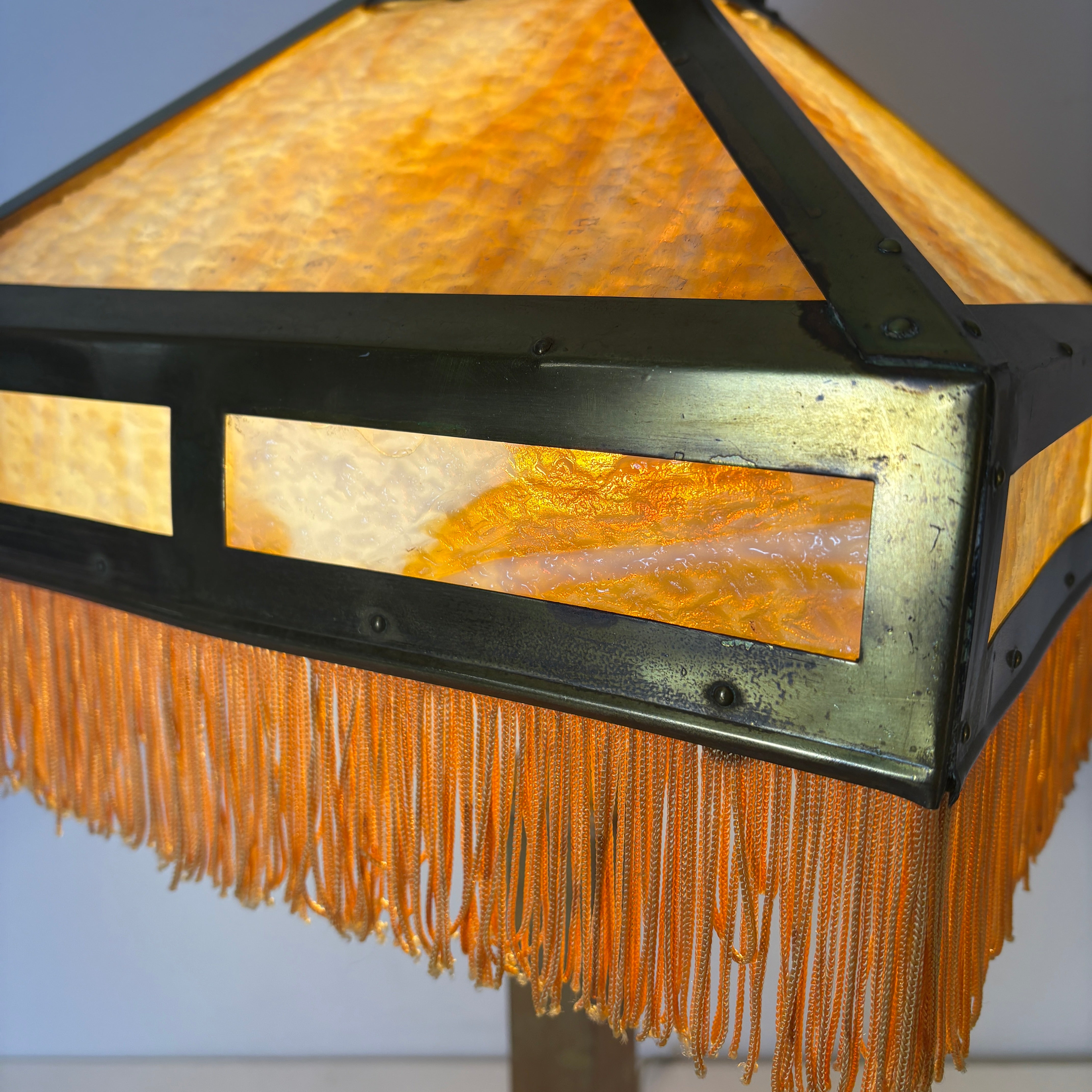 Art Deco Stained Glass and Brass Table Lamp, Square Shade, Gold Tassel Fringe