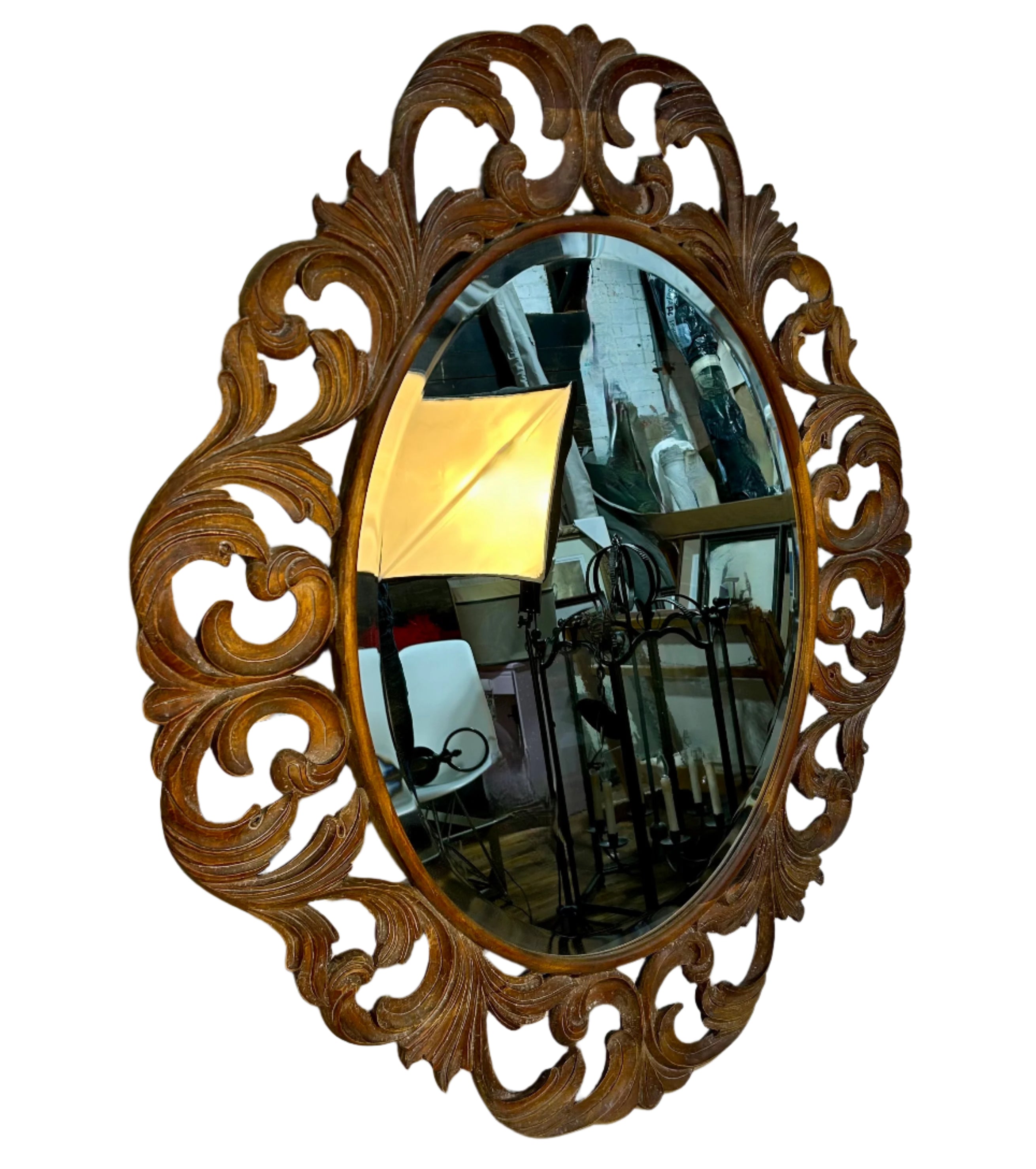 Harrison Gil carved wood oval mirror. Hanging brackets on back designed to hang vertically or horizontally. Note: pictures don't do it justice (issues with photographing the reflective glass) - these are beautiful mirrors.