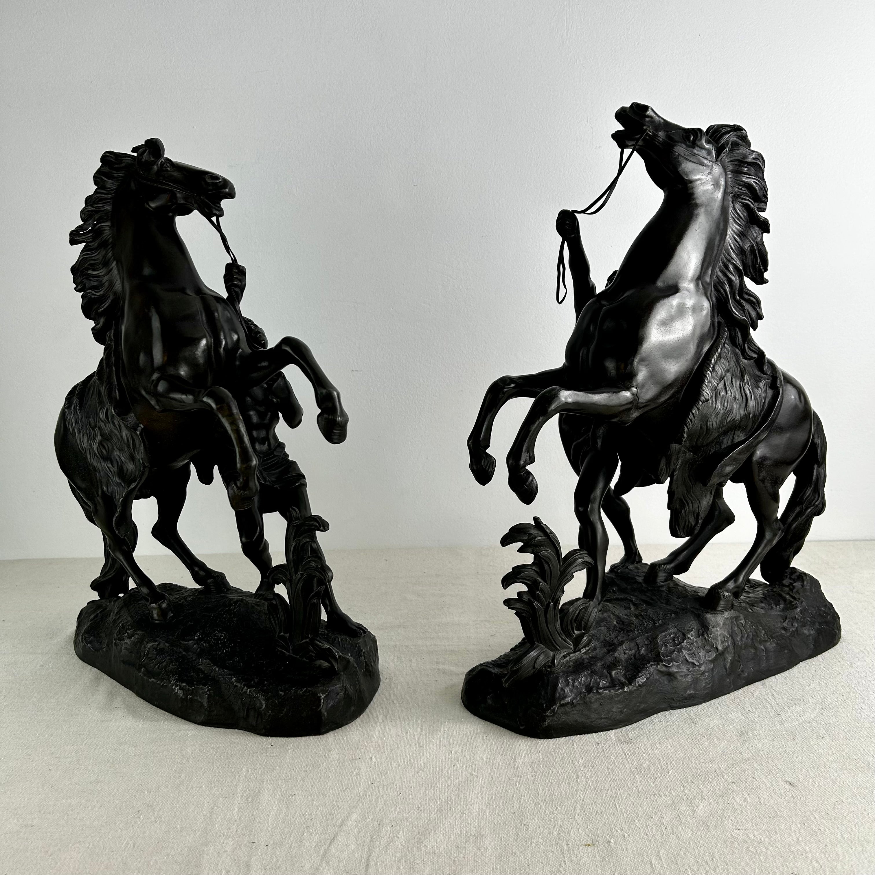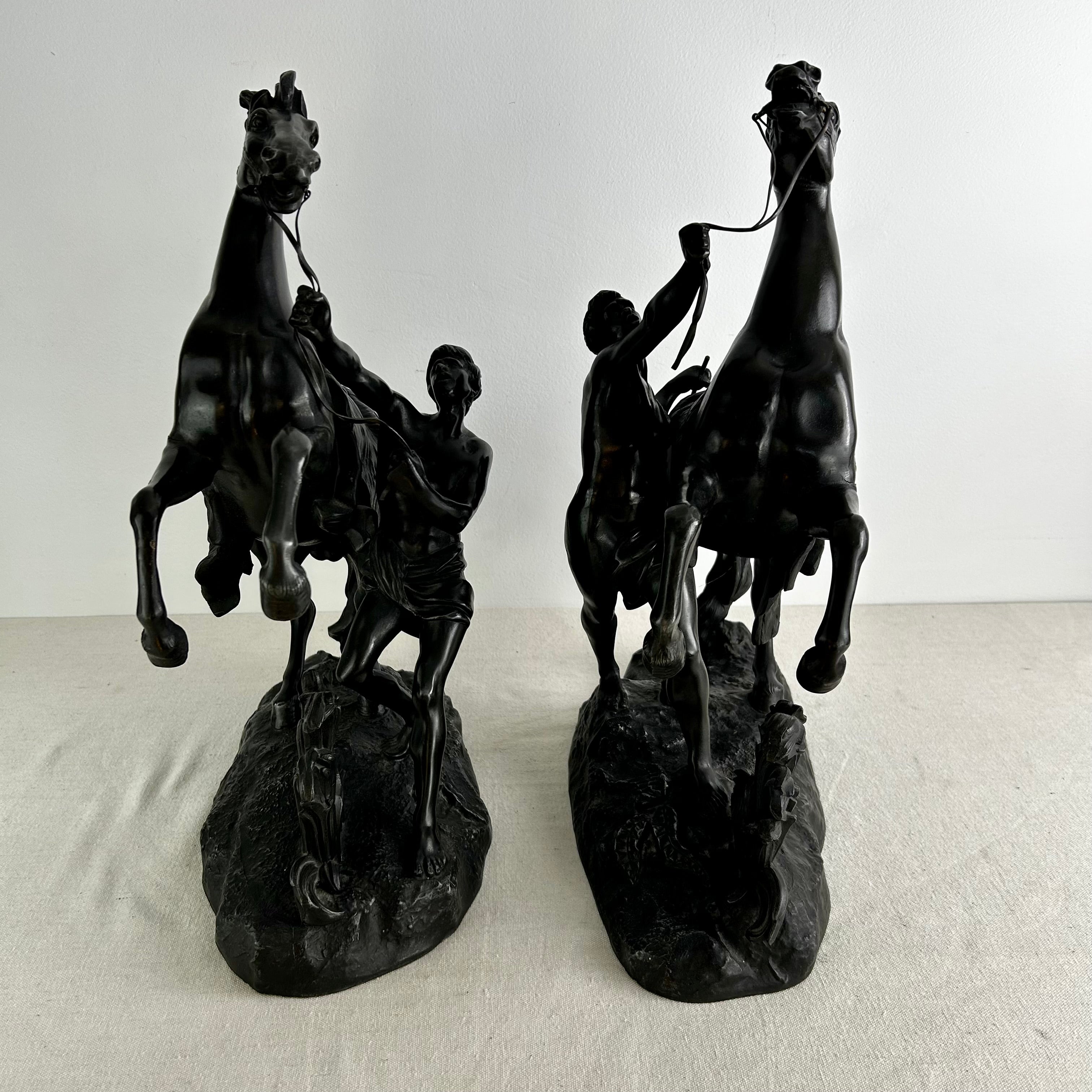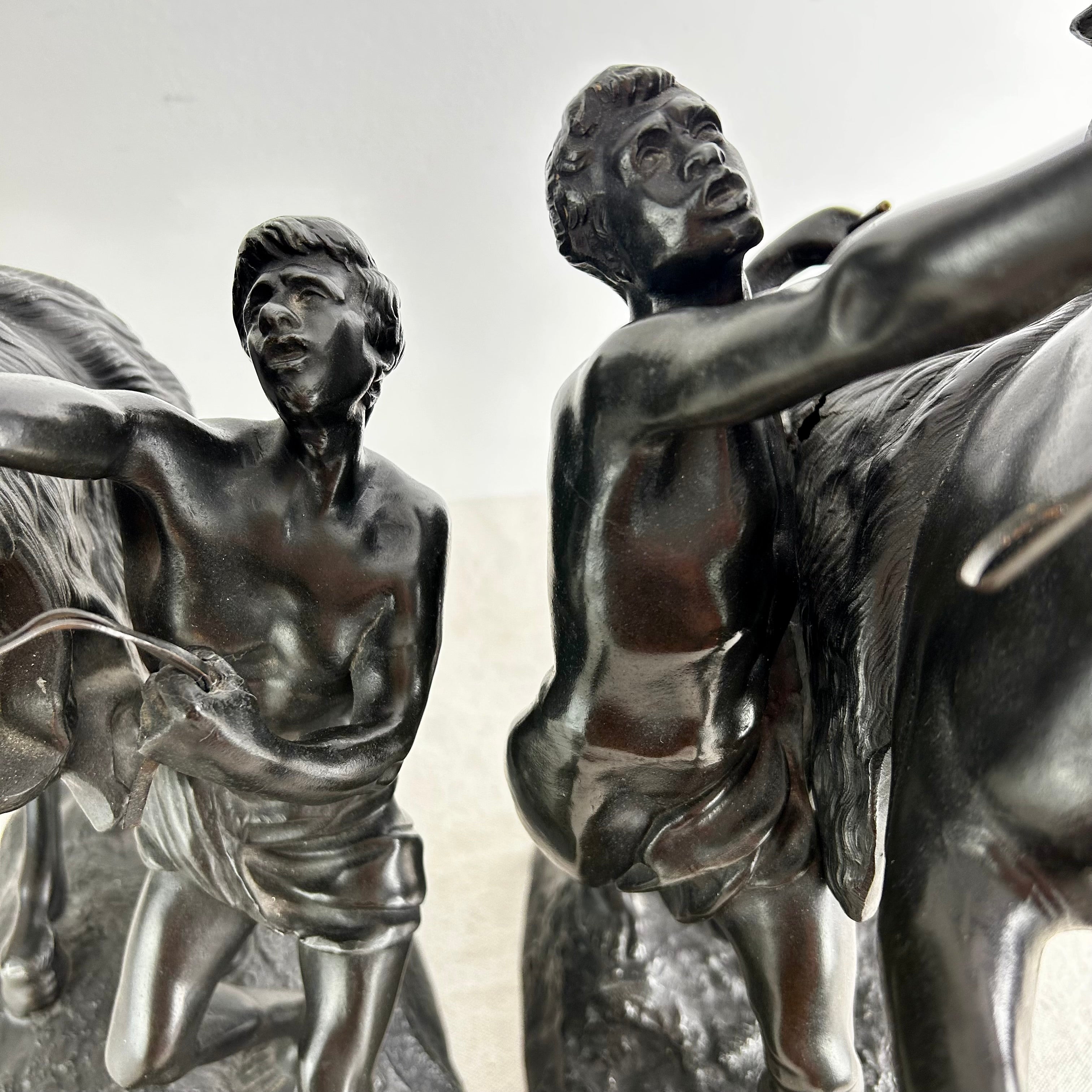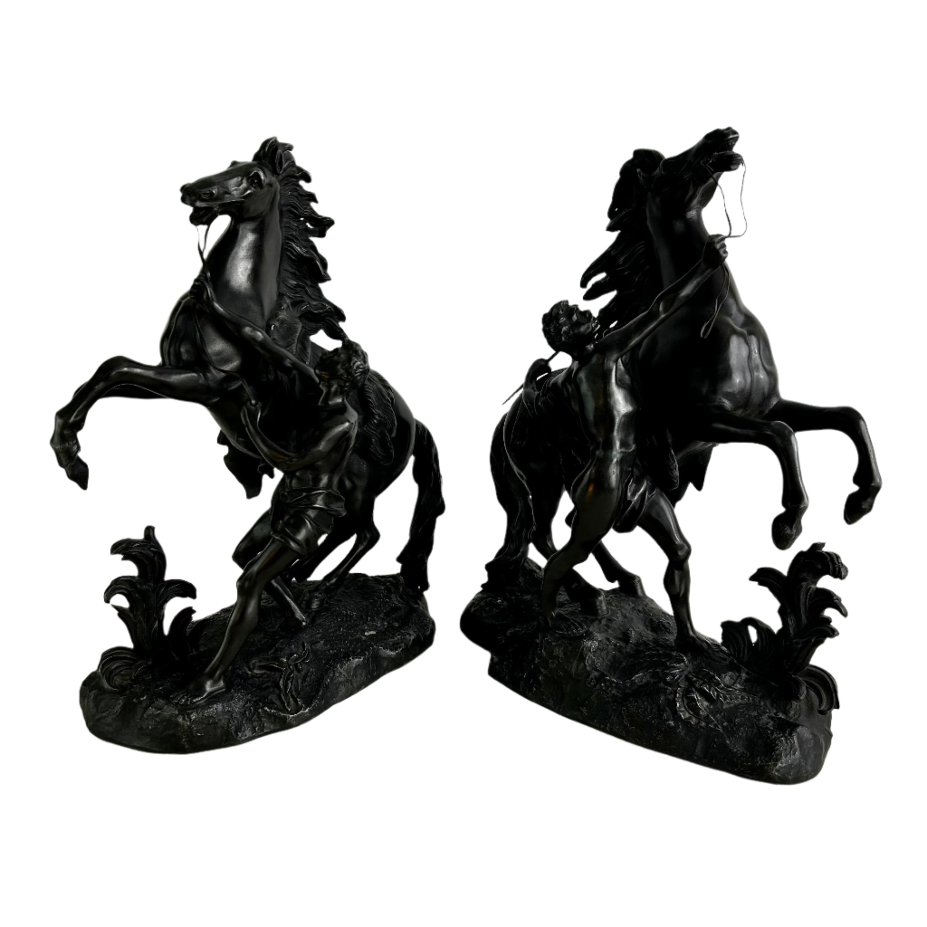 Table sculpture, pair of men with rearing horses, most likely bronze. Sold as a pair.