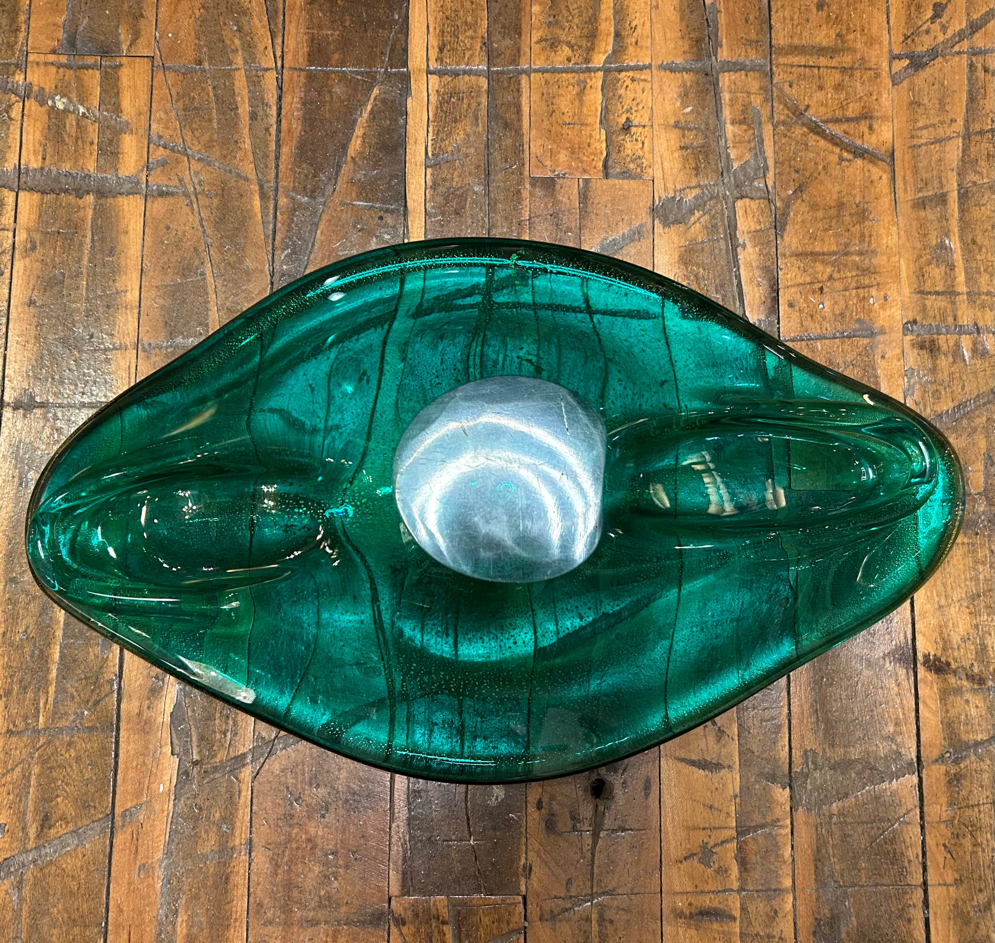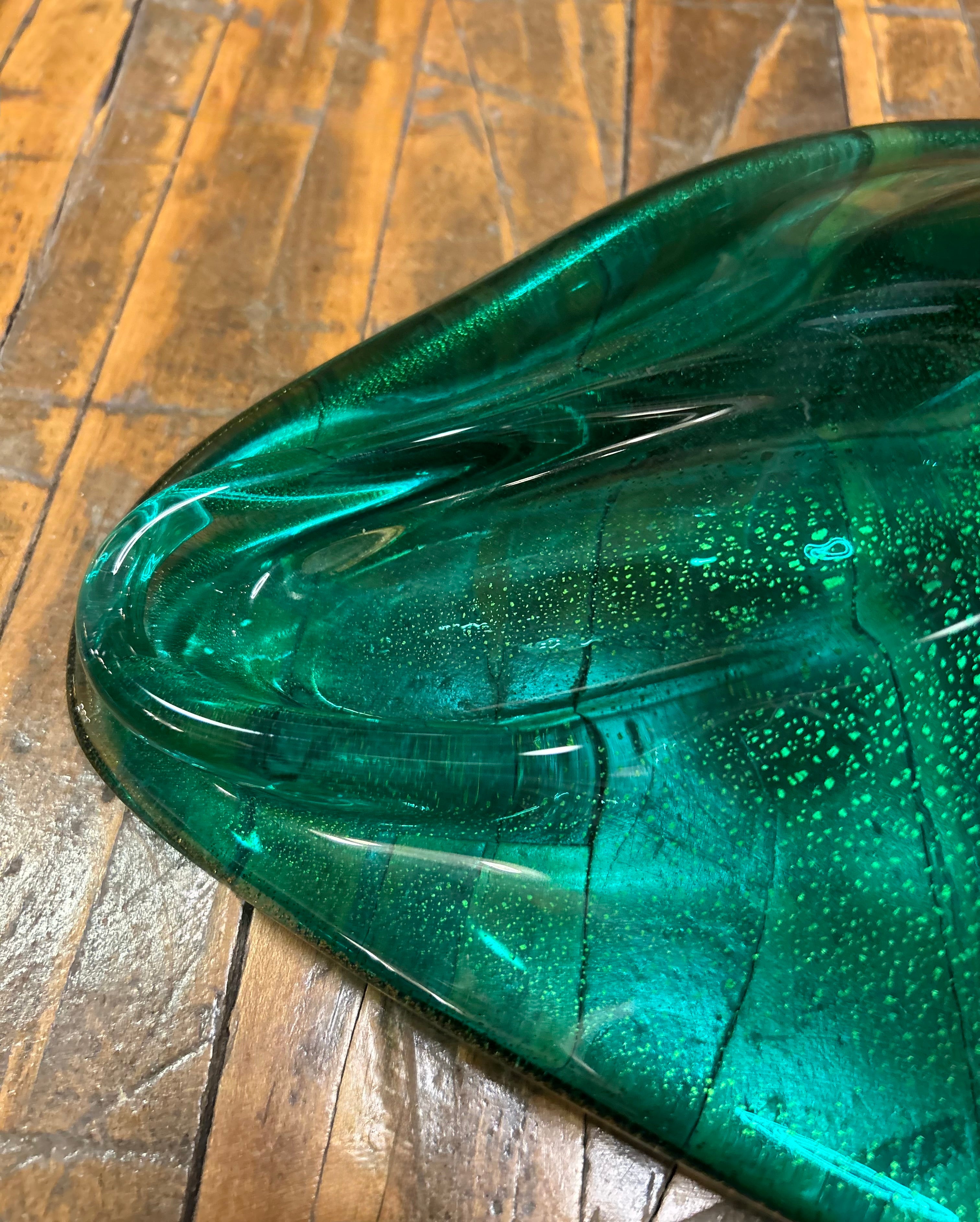 Art glass bowl, decorative object, oval, aqua color with gold specks. Unsigned. Appears to be handblown.