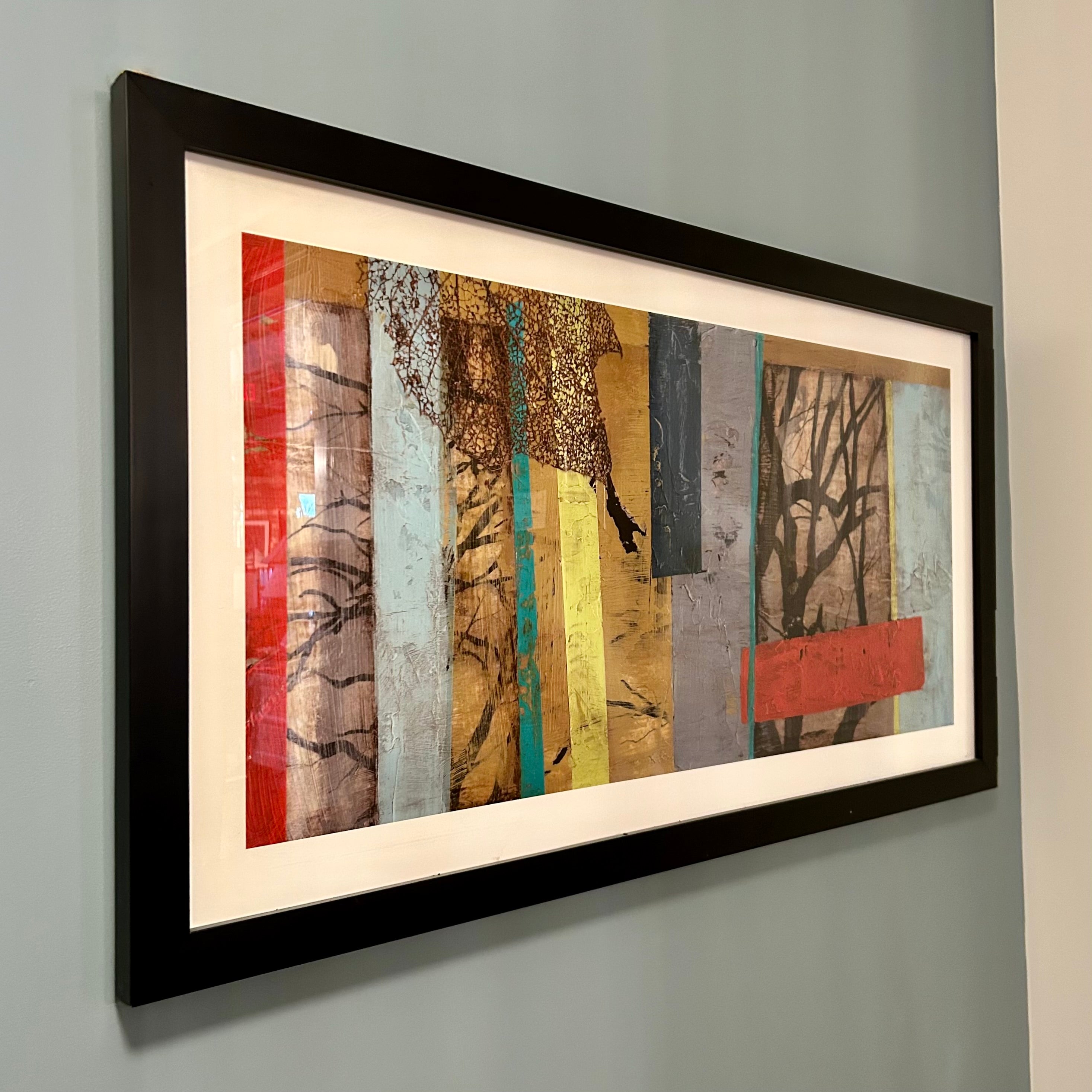 "Woven Landscape II, framed color print, abstract, rectangle. Colors of red, yellow, green, light blue and black.