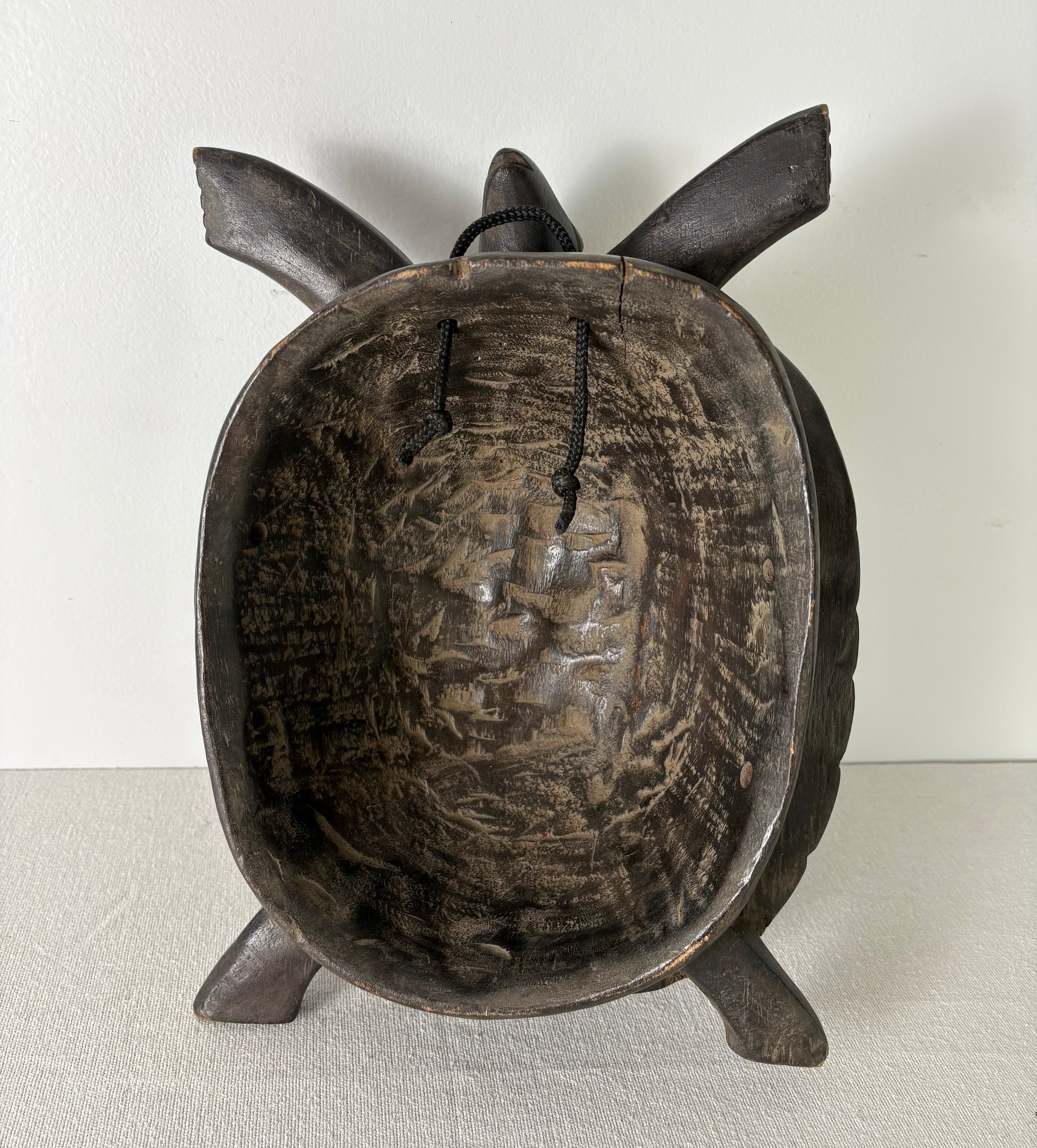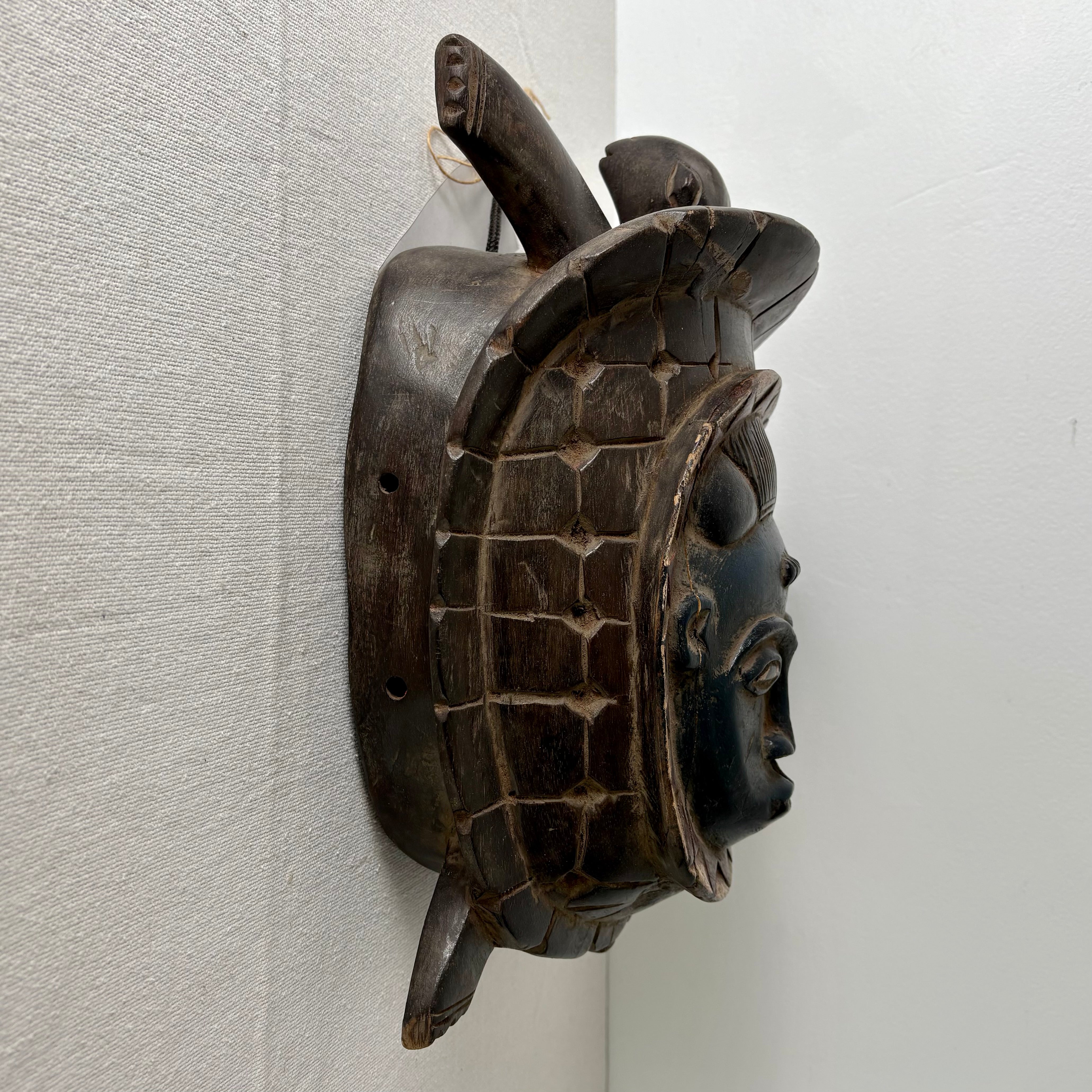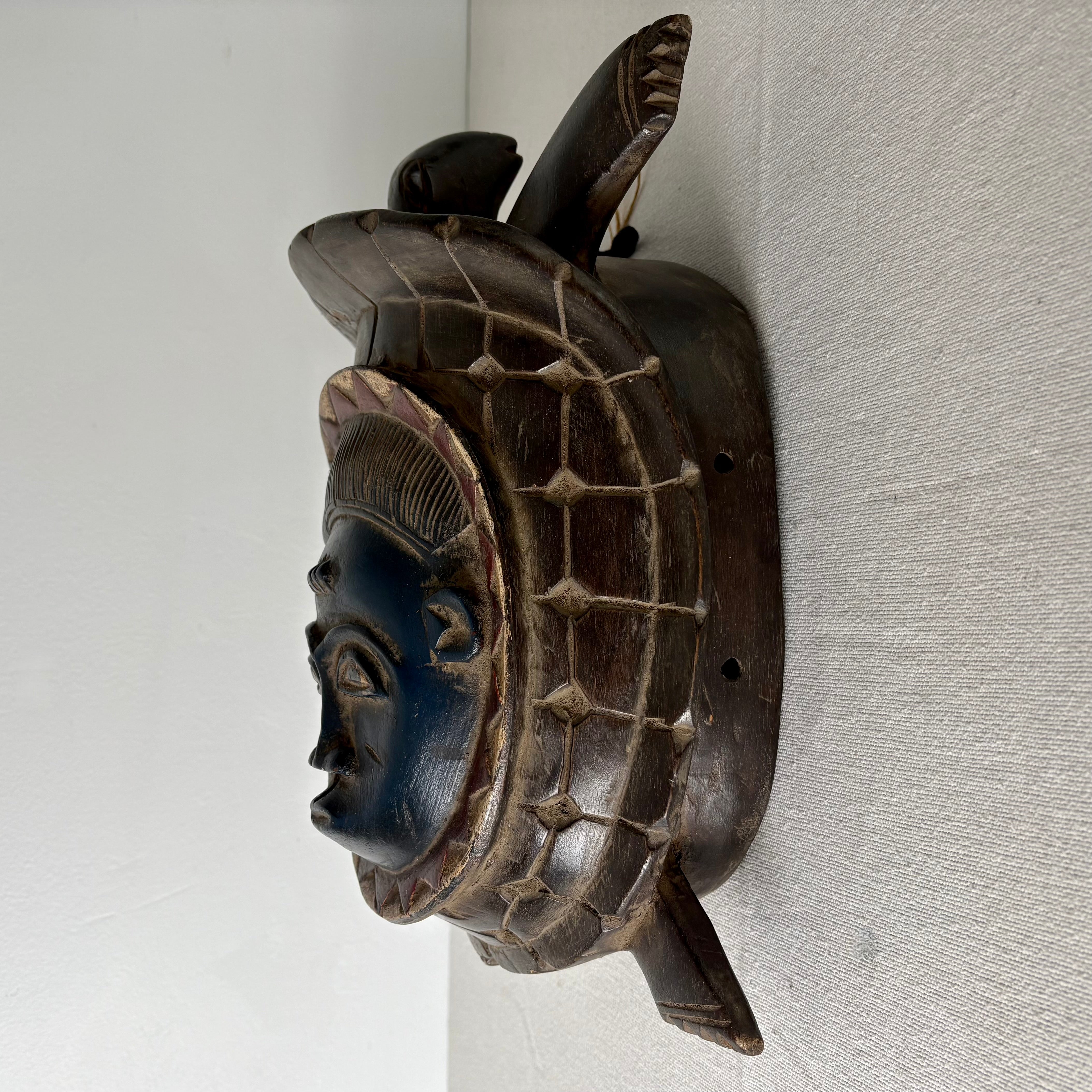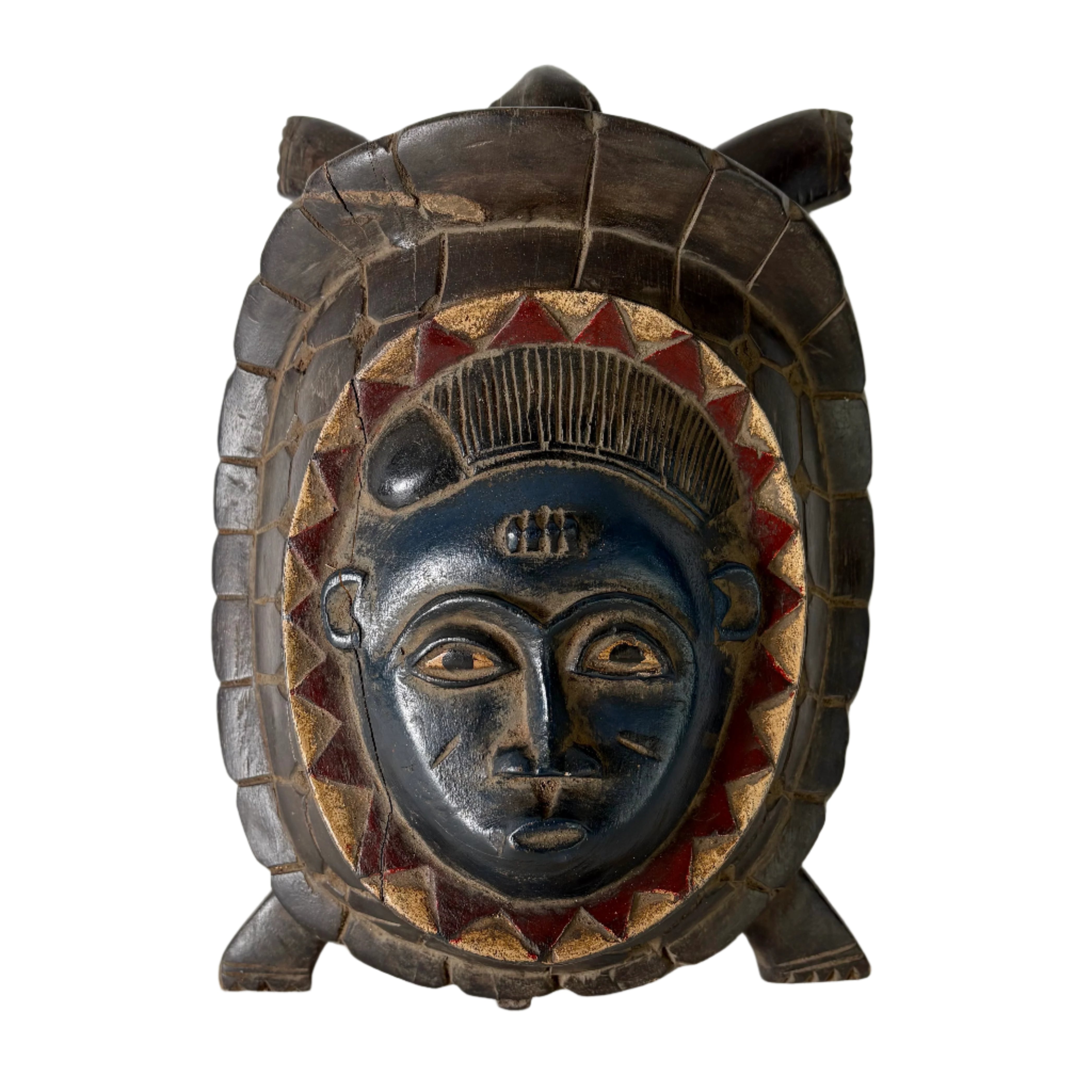 Baoule tribal mask, in the shape of a turtle, with a human face on its back, with red sun rays emanating from his head, hand carved wood.