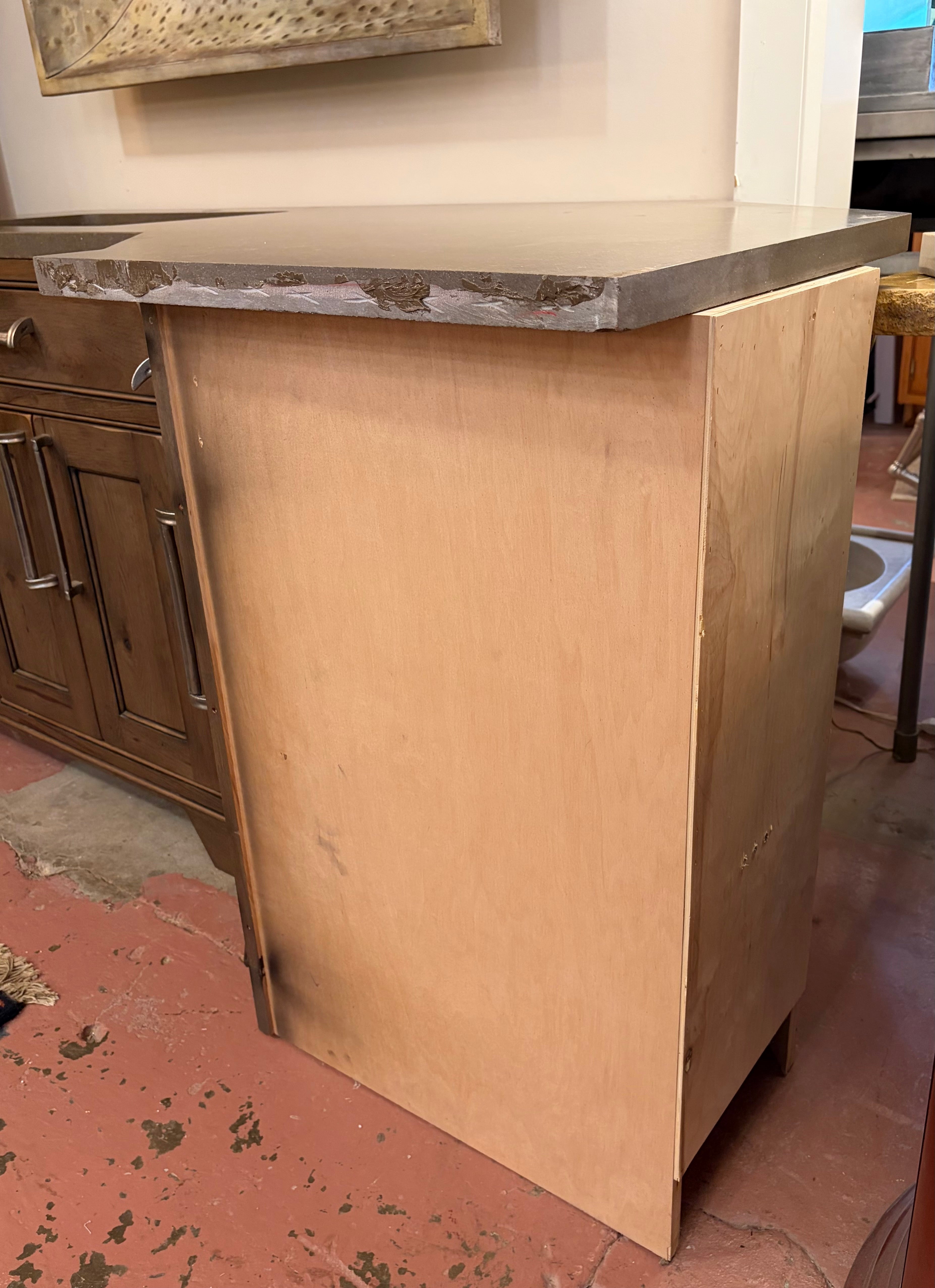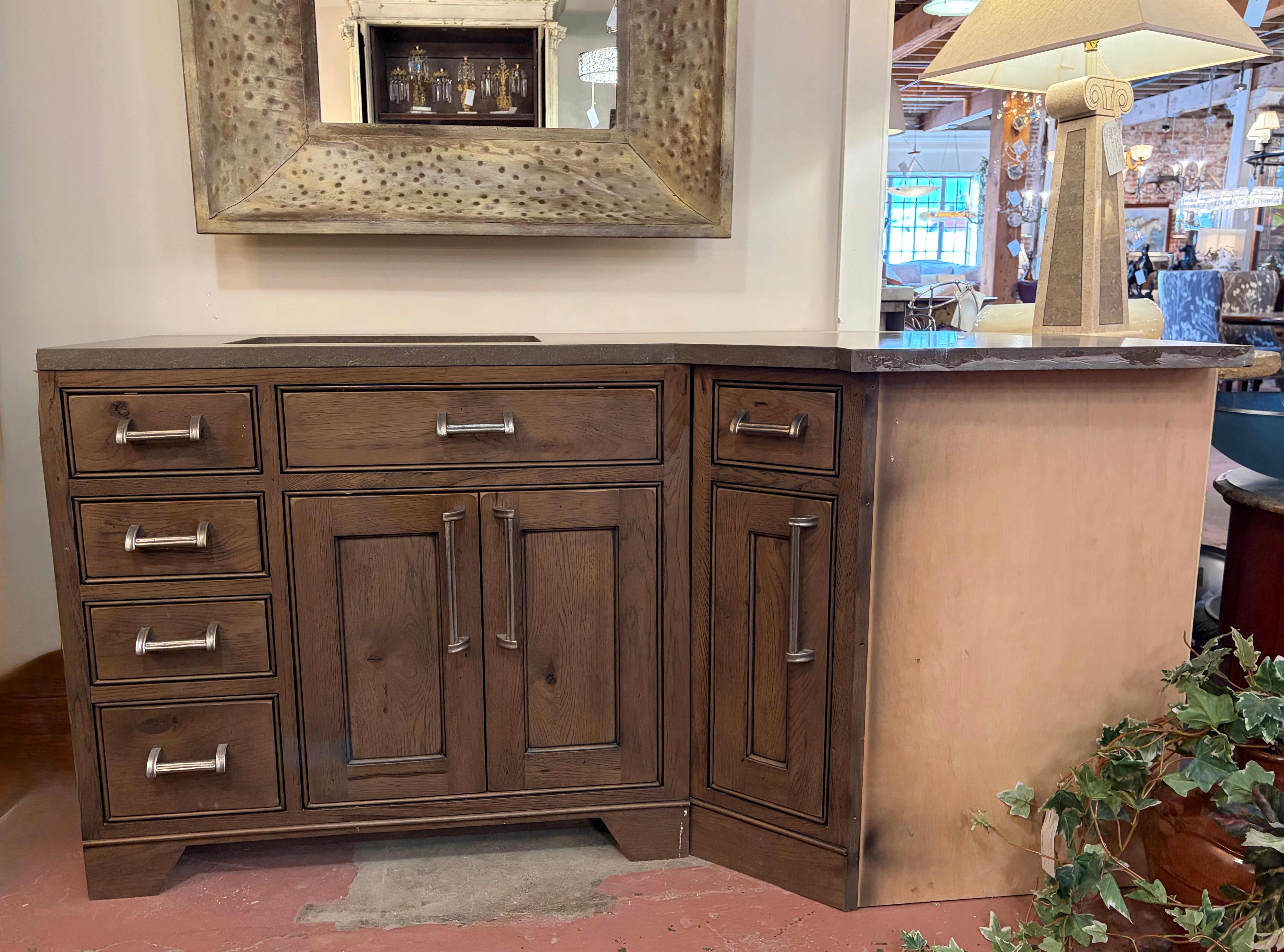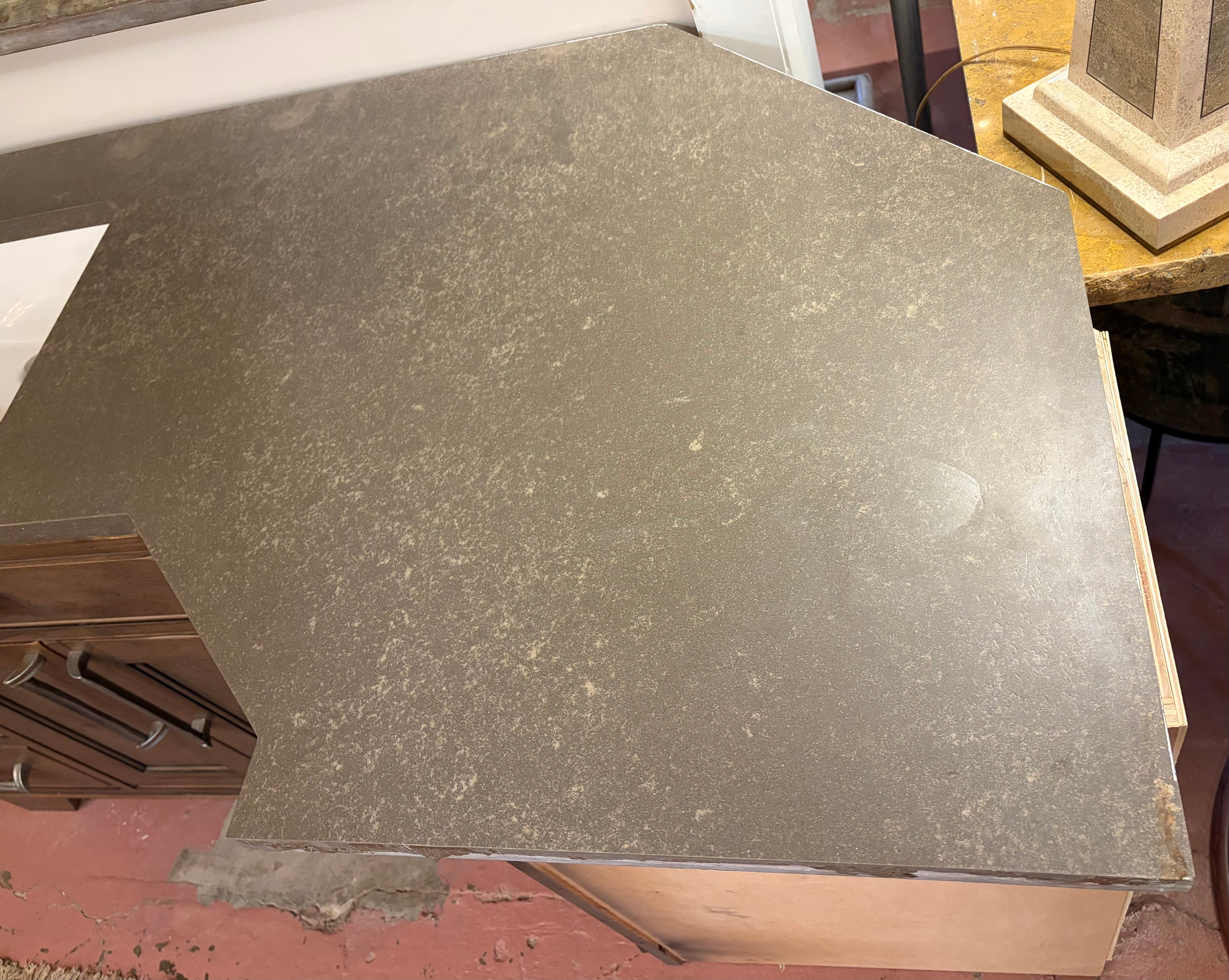 Corner Bathroom Vanity with Rectangle Kohler Sink, Soft Brown Wood Cabinets, Stone Top in Gray Green, Silver hardware. Five Functioning Drawers (one decorative, one semi-decorative).