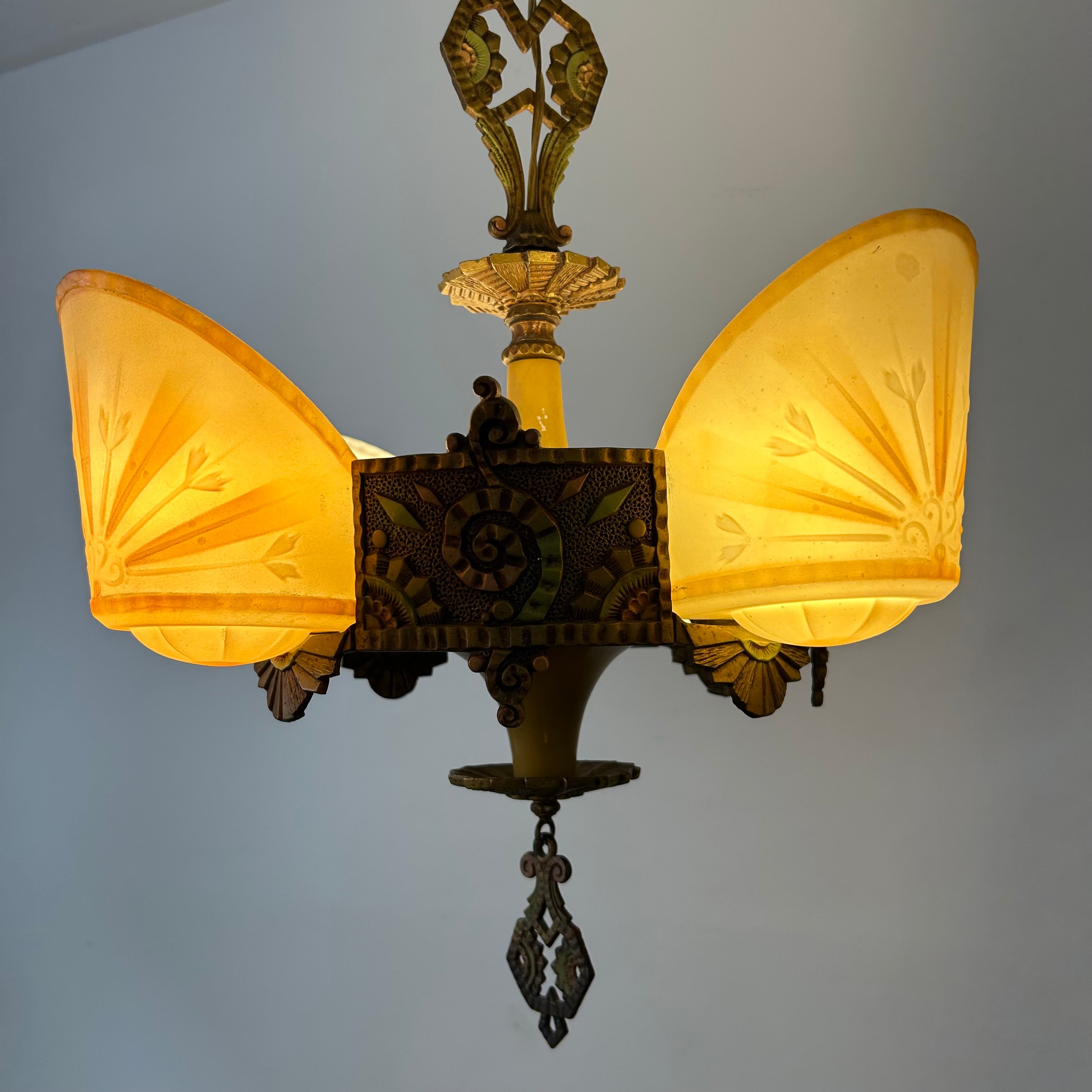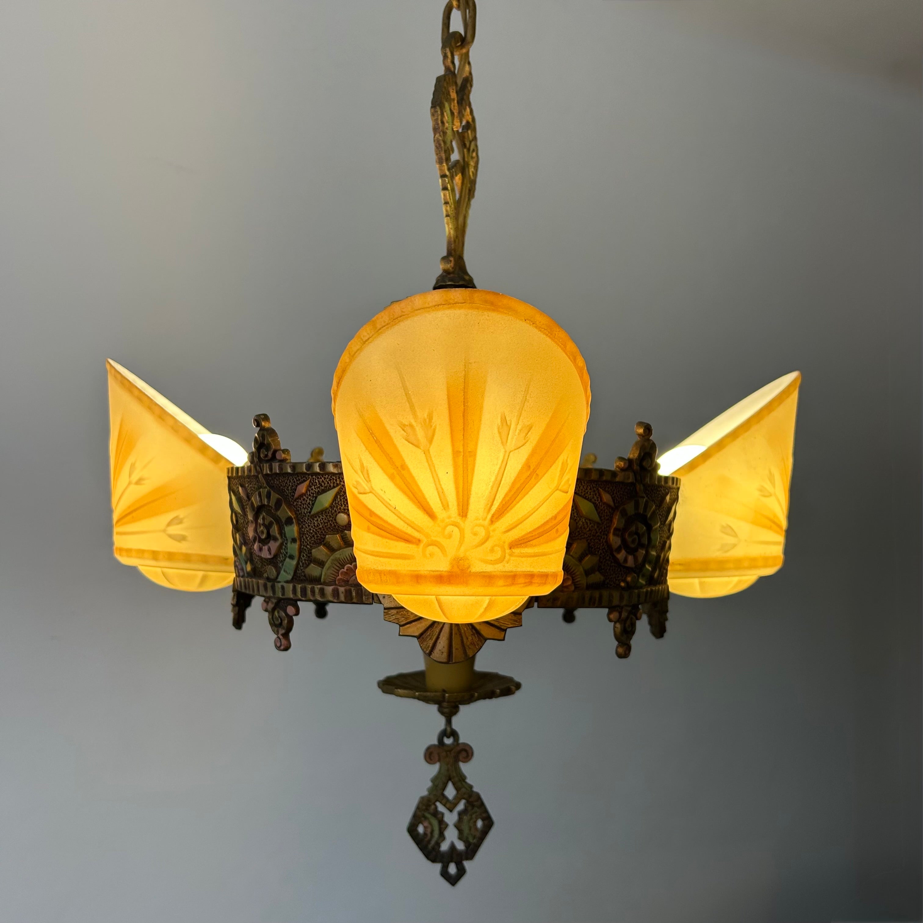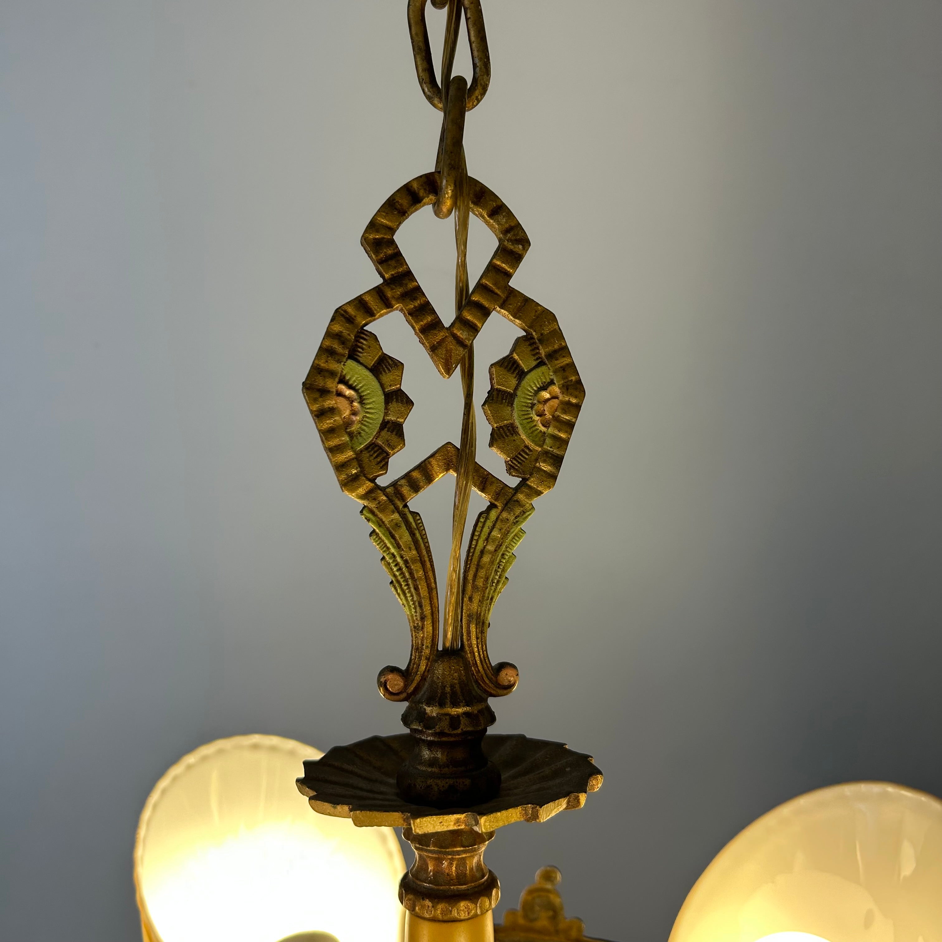 Beardslee Williamson Polychrome Art Deco Slip Shade Chandelier with Four Milk Glass Shades.