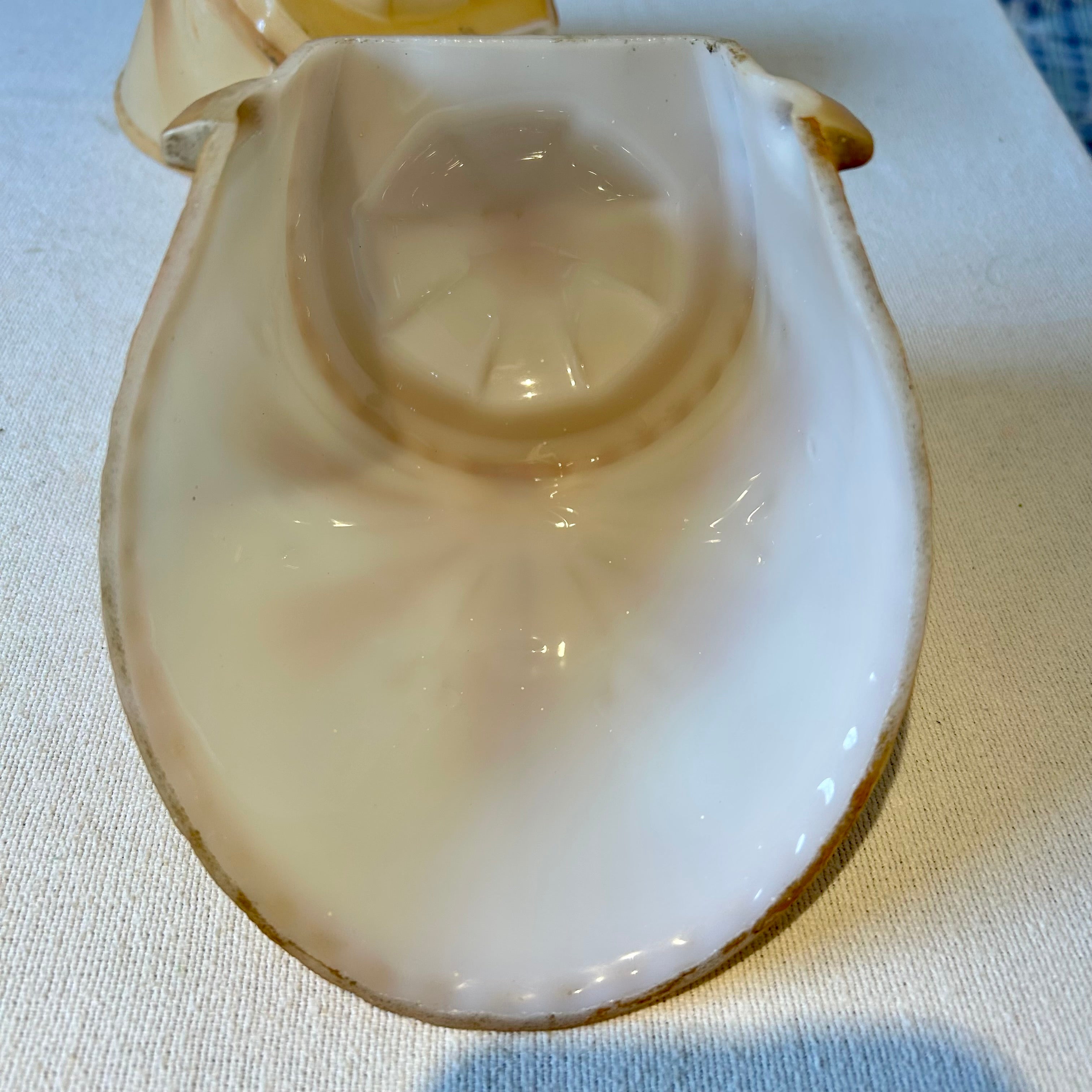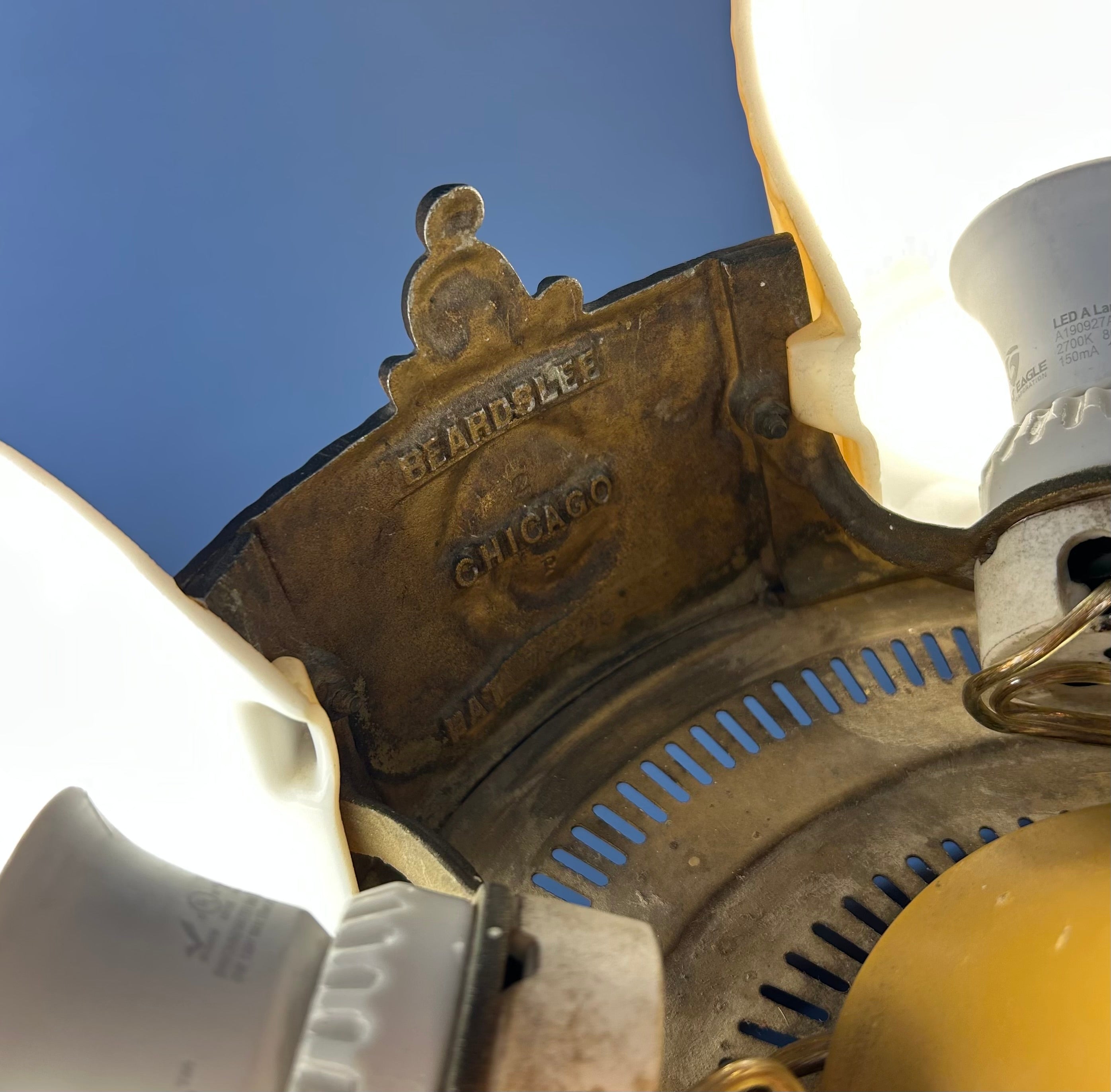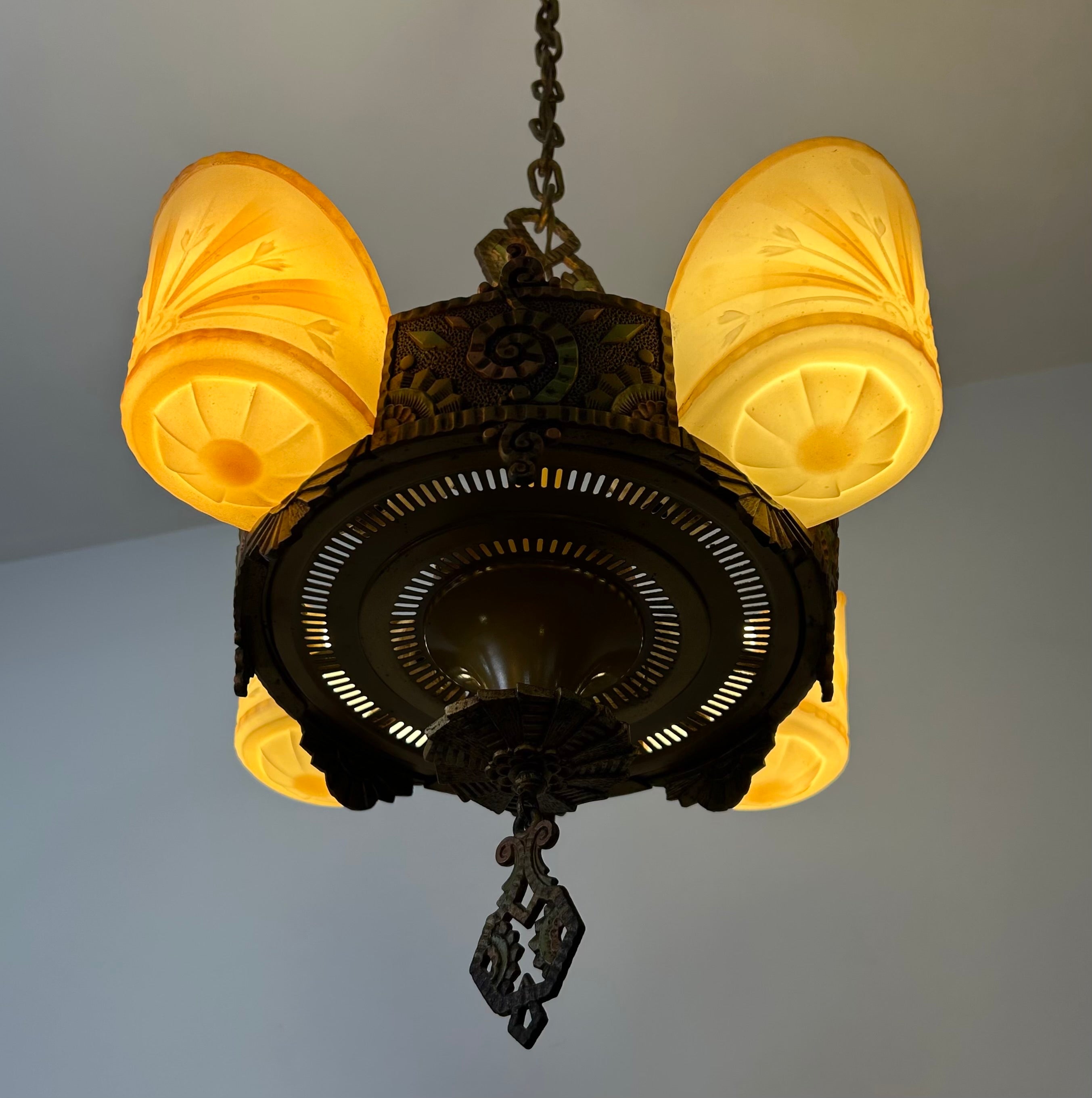 Beardslee Williamson Polychrome Art Deco Slip Shade Chandelier with Four Milk Glass Shades.