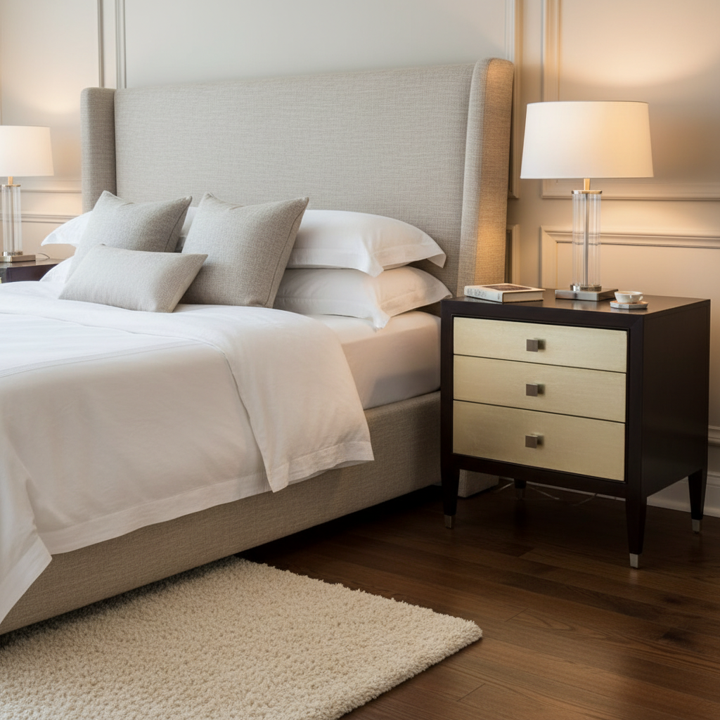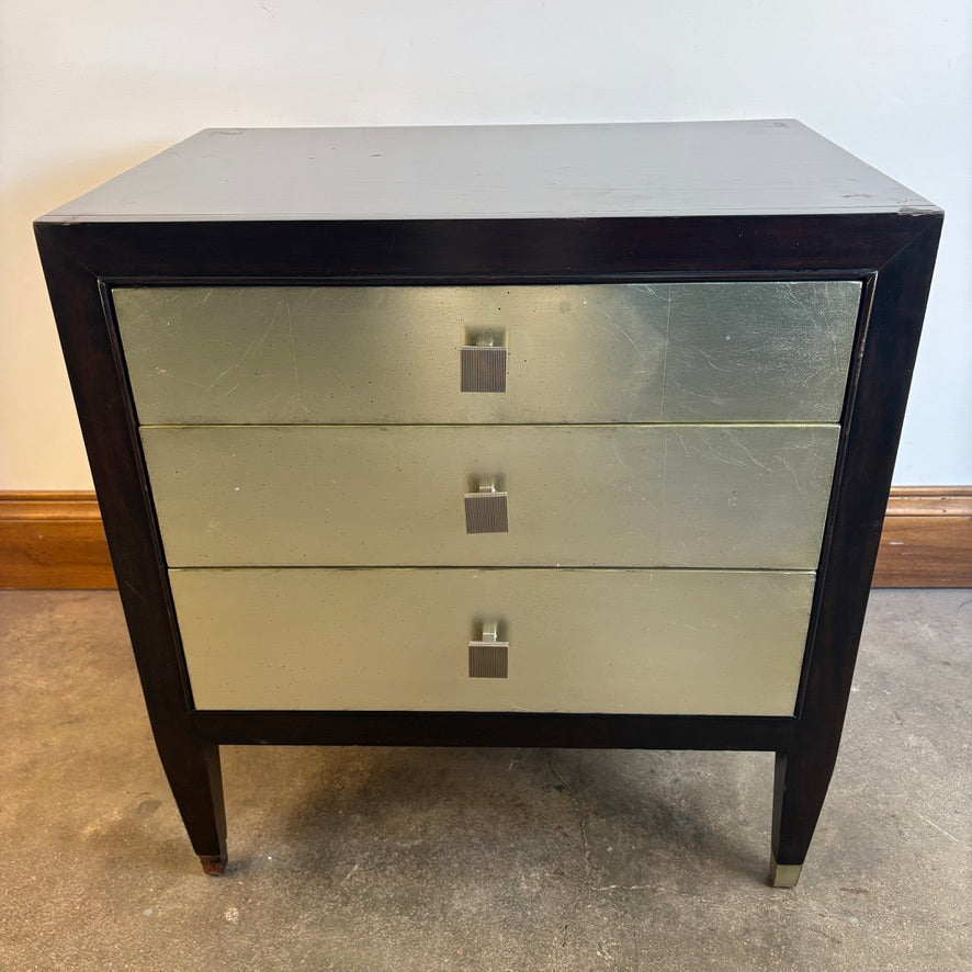Bernhardt Aurelia 3 Drawer Nightstand w/ Champagne Silver Leaf Drawer Fronts & Ebonized Finish