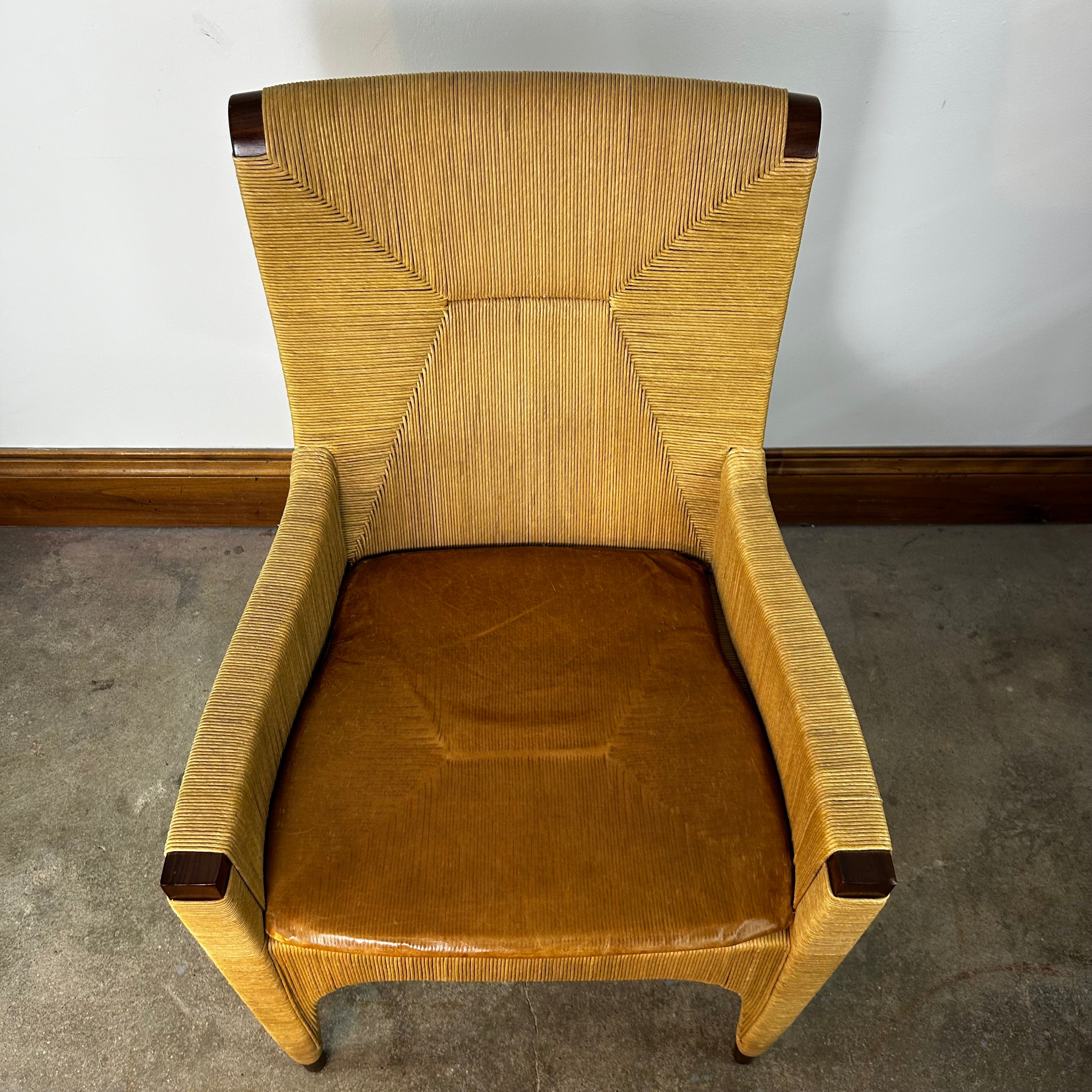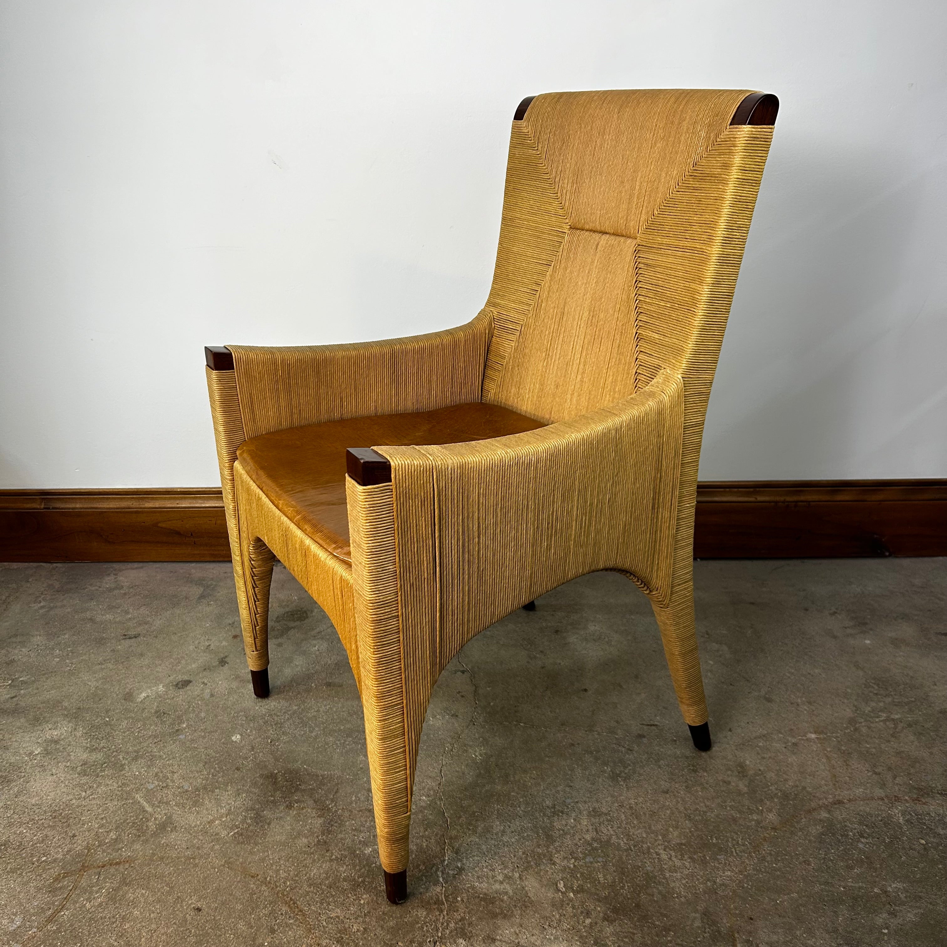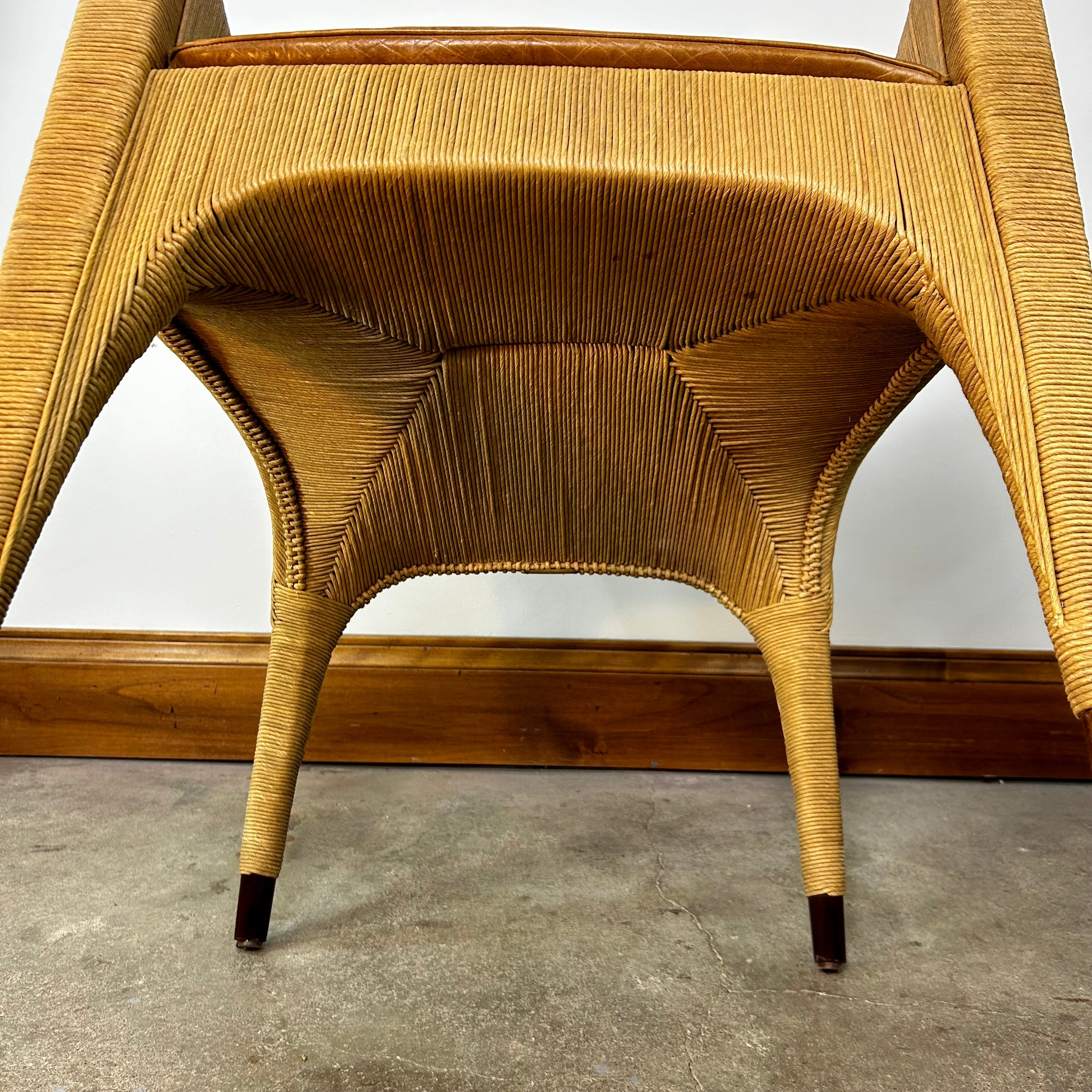 This cocoon chair, designed by Bill Sofield, combines mid-century and coastal elements, with a chic and sophisticated touch. The leather seat cushion adds a luxurious and comfortable feature.