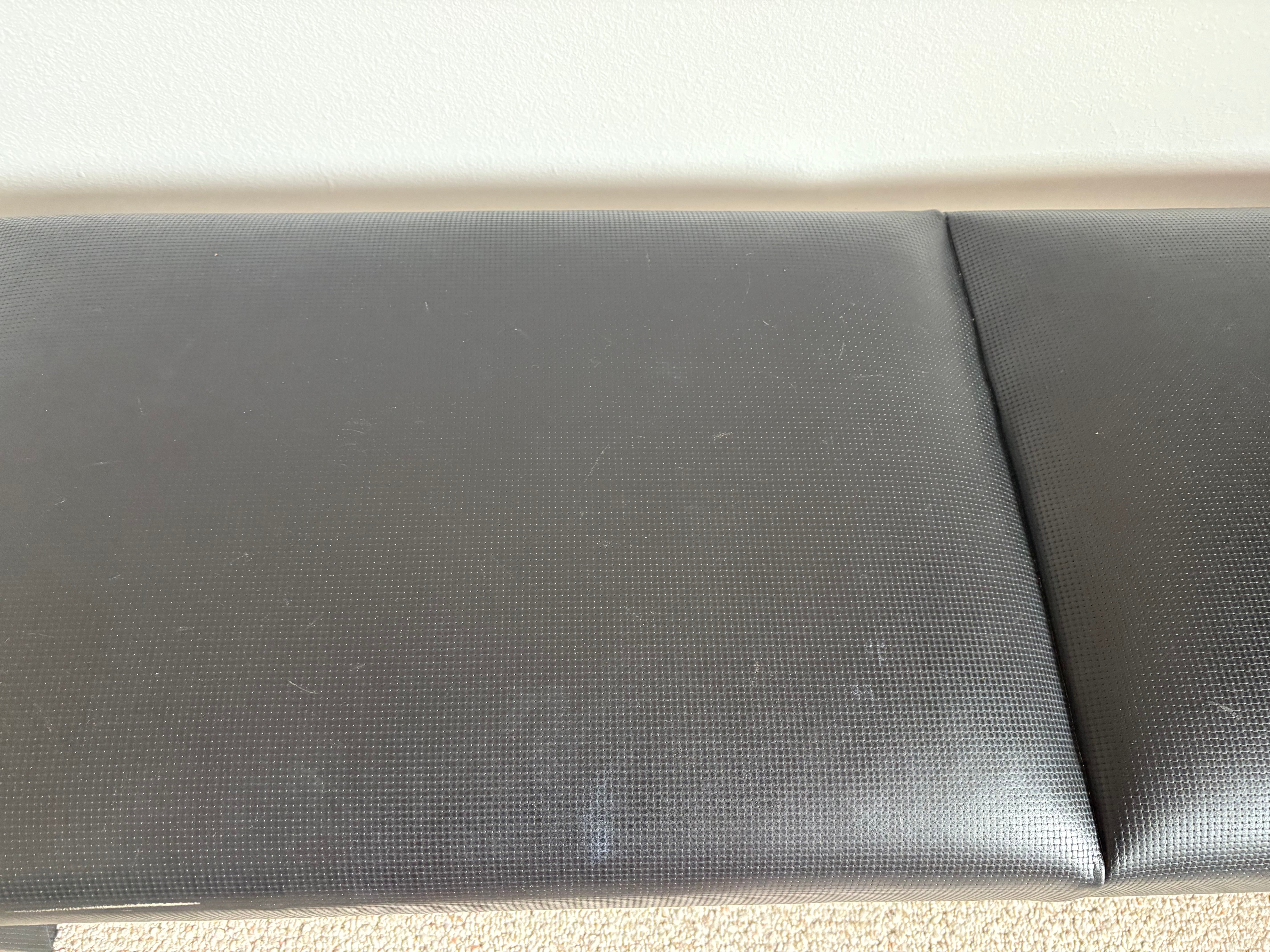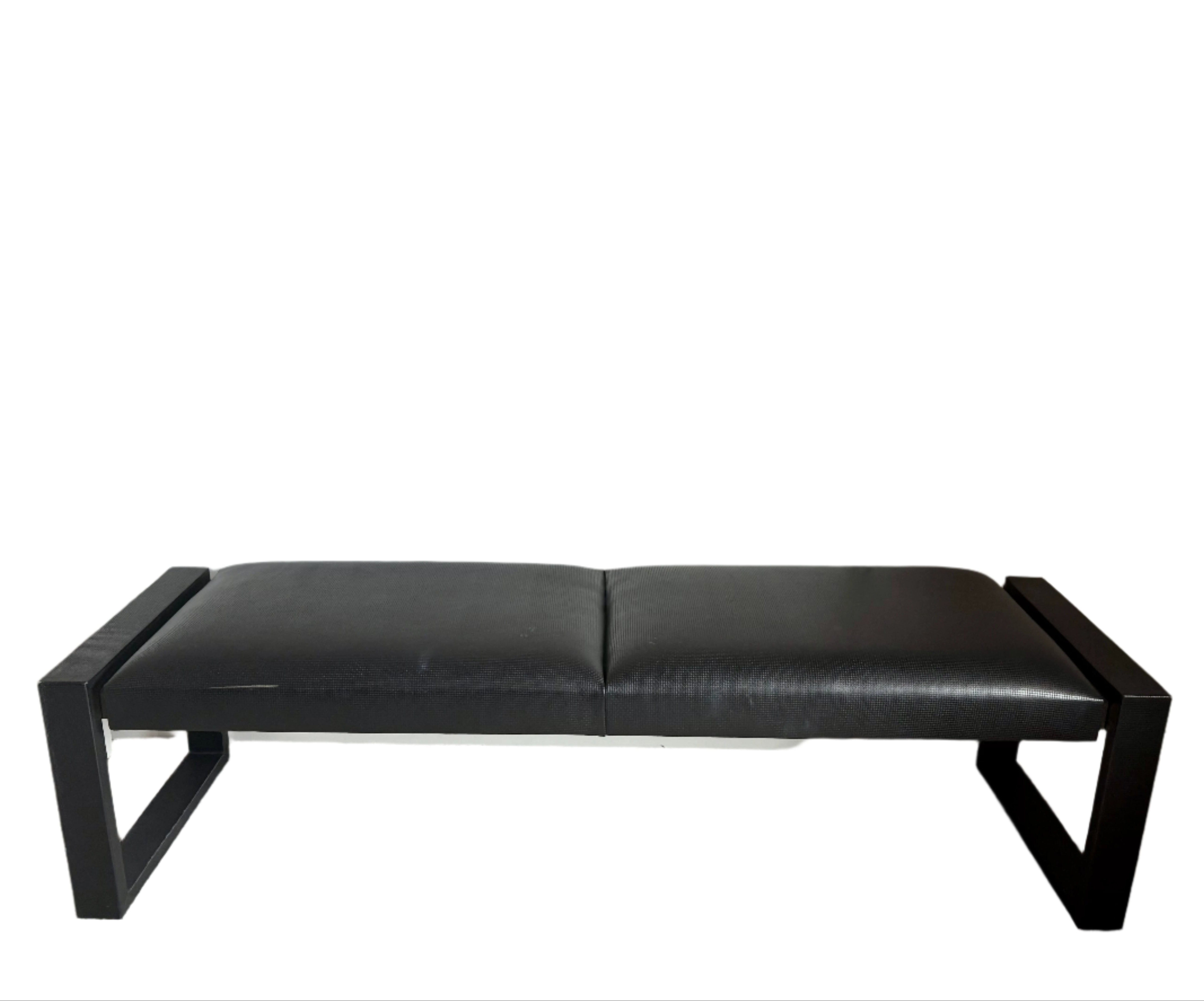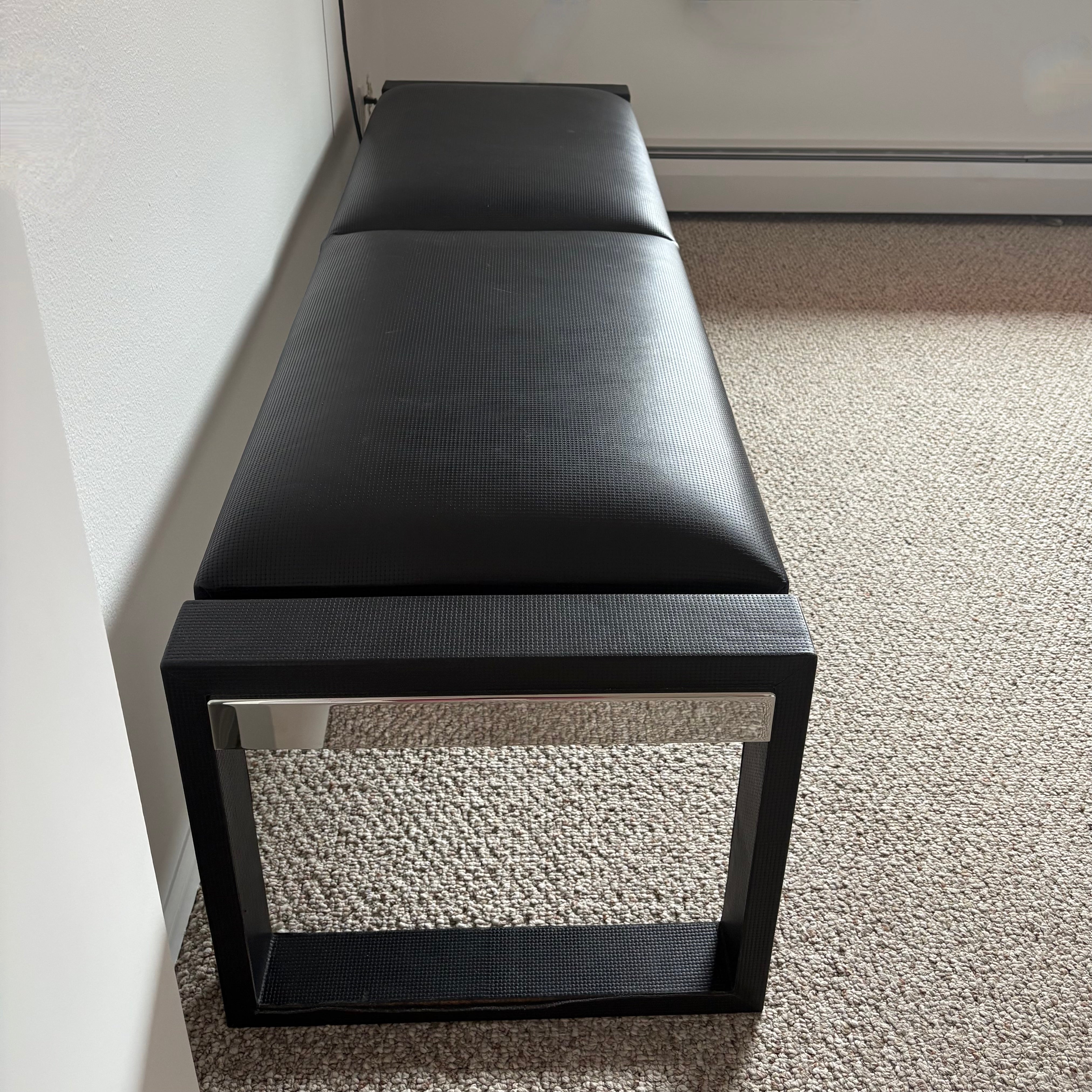 Black leather bench stamped weave texture detail and with chrome detail in the frame.