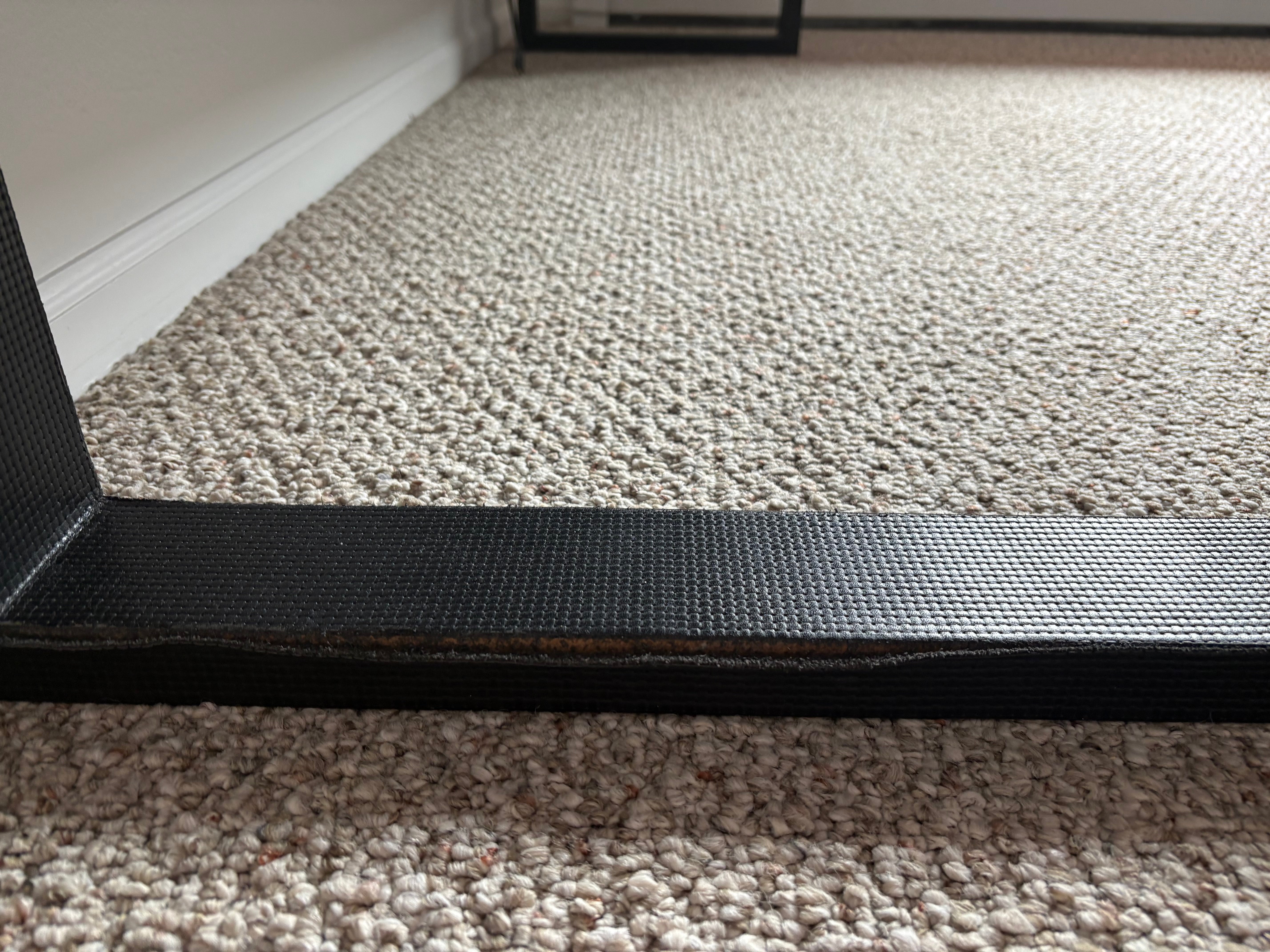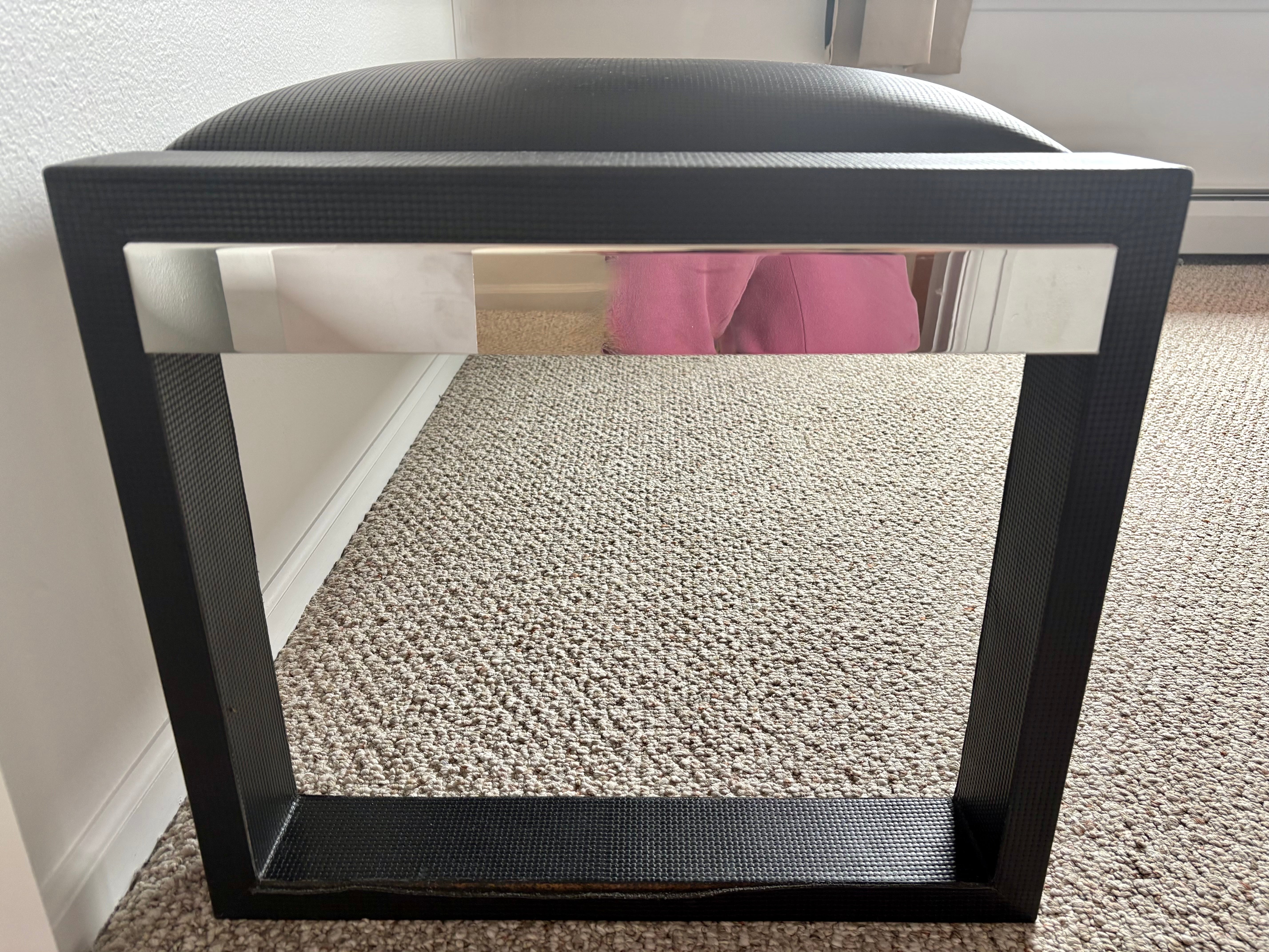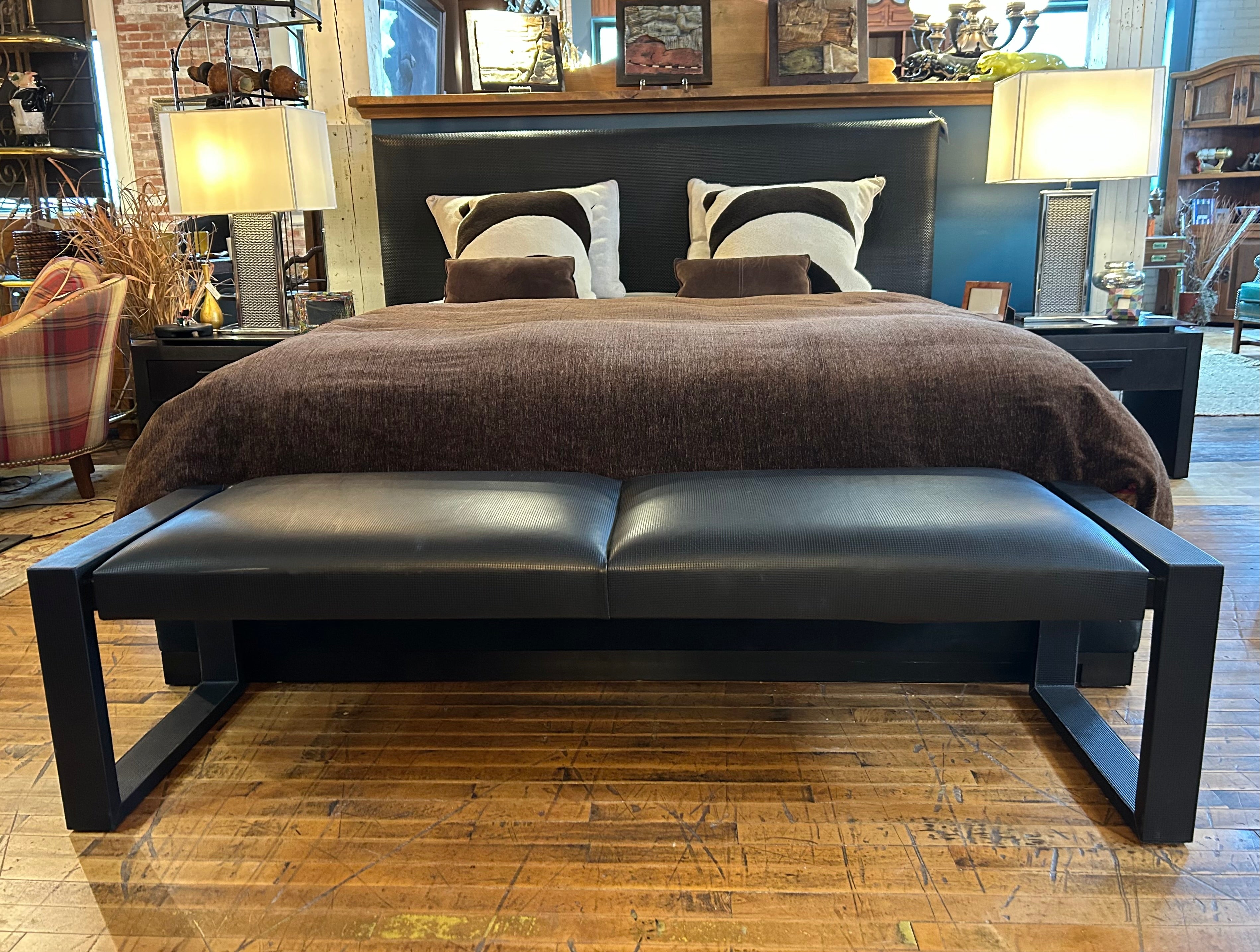 Black leather bench stamped weave texture detail and with chrome detail in the frame.
