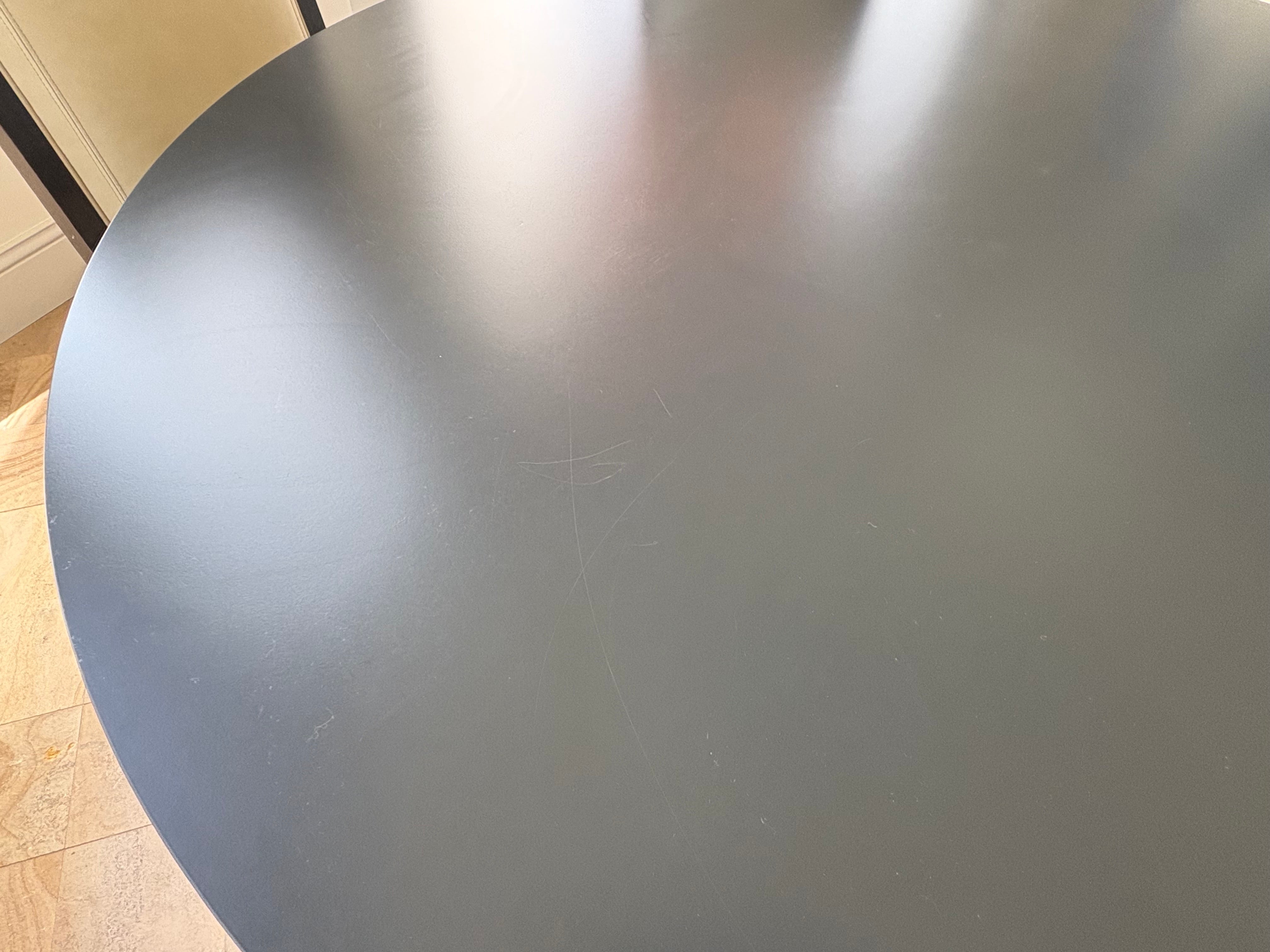 Vesuvius matte black steel round pedestal table. Seats four easily. Perfect for a breakfast nook or smaller dining room. We believe this to be a Vesuvius maker table. We do not see a maker name on it.