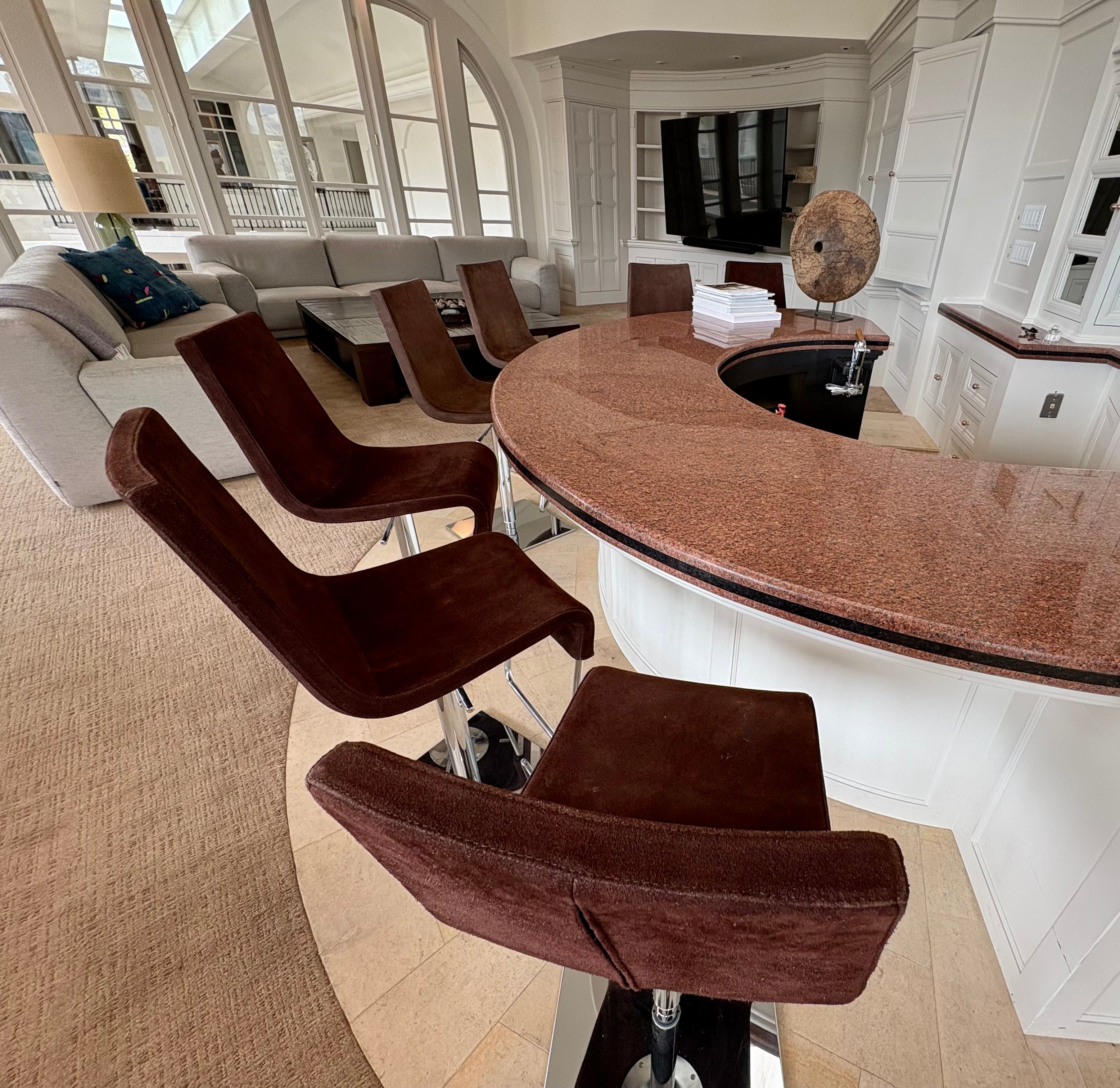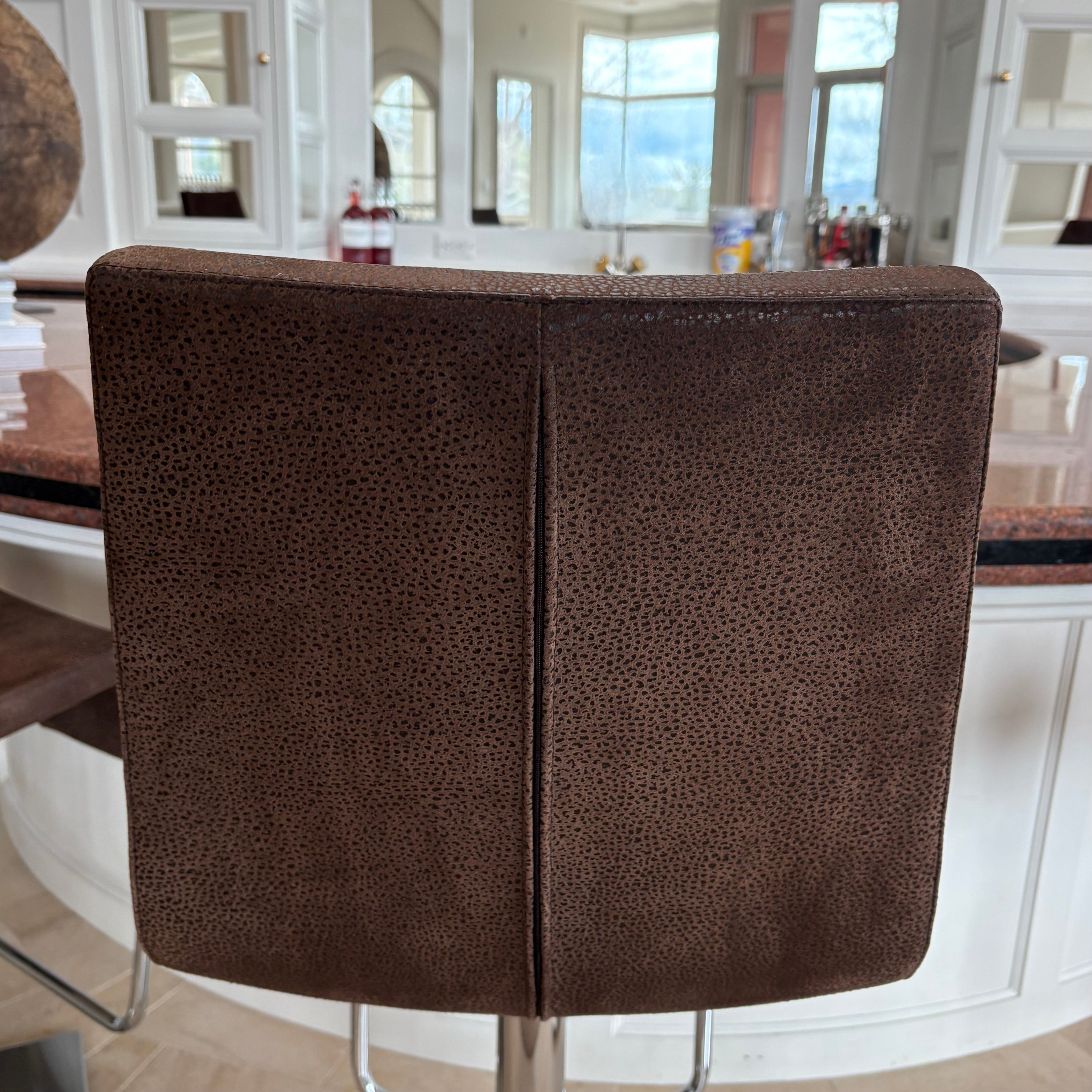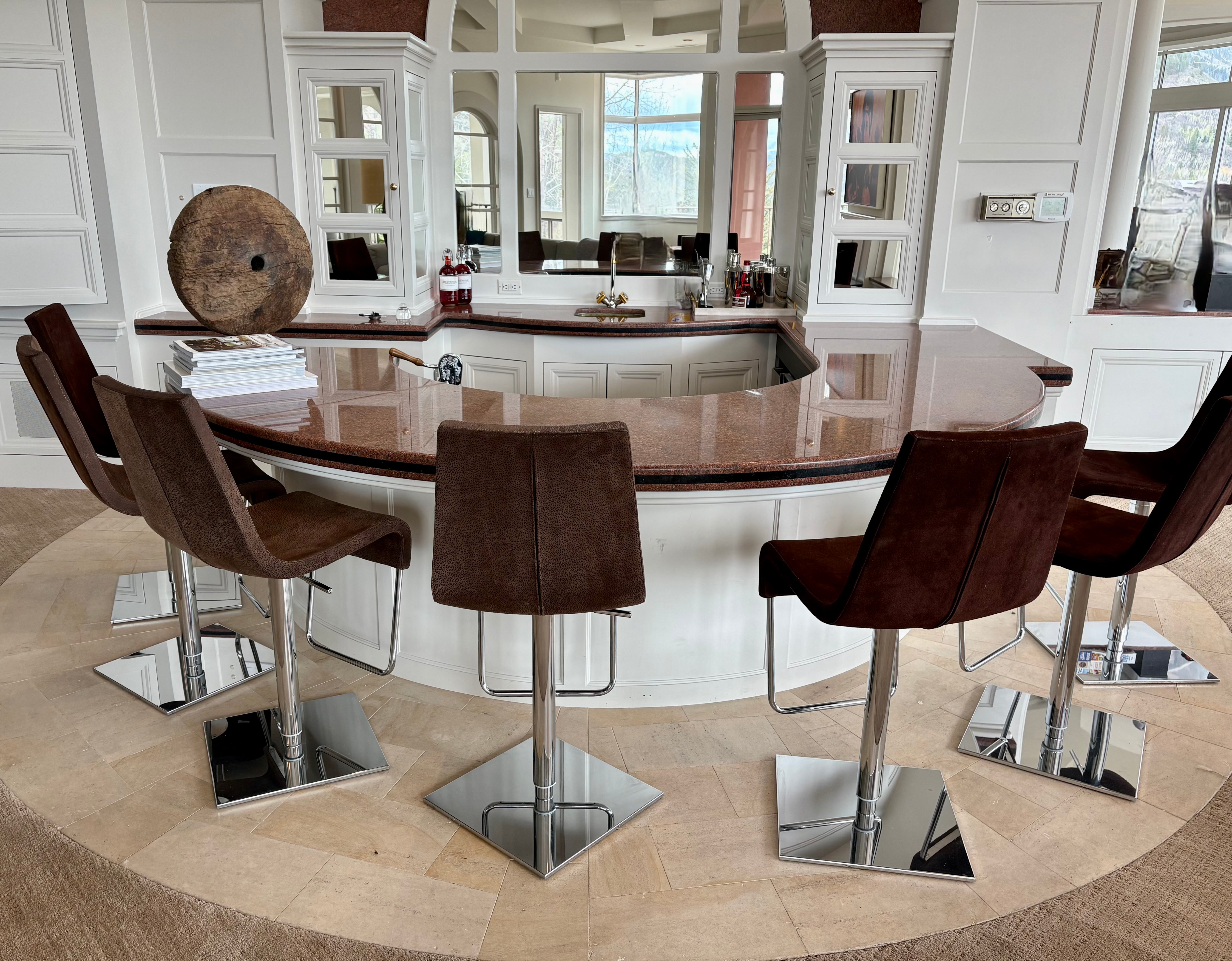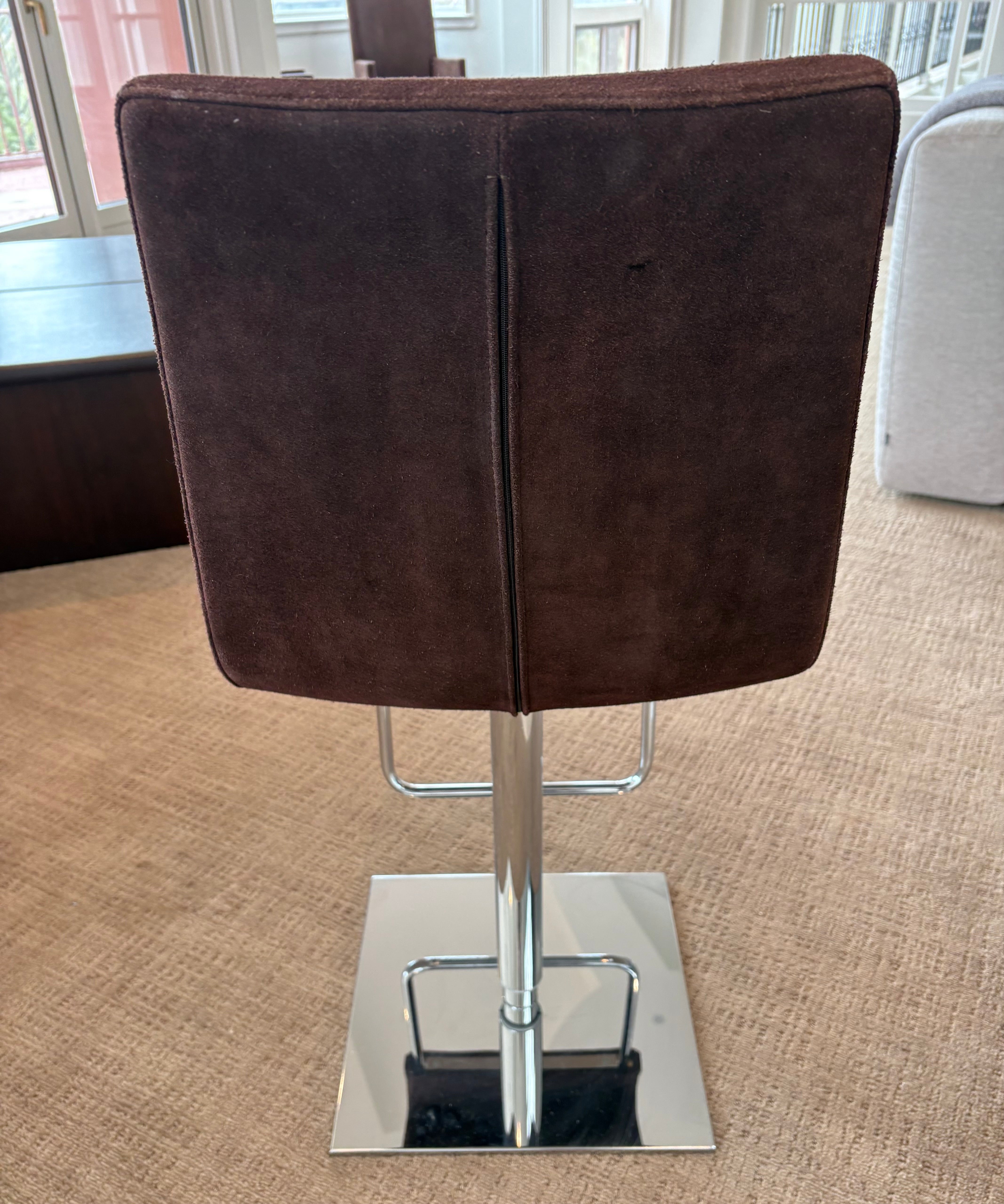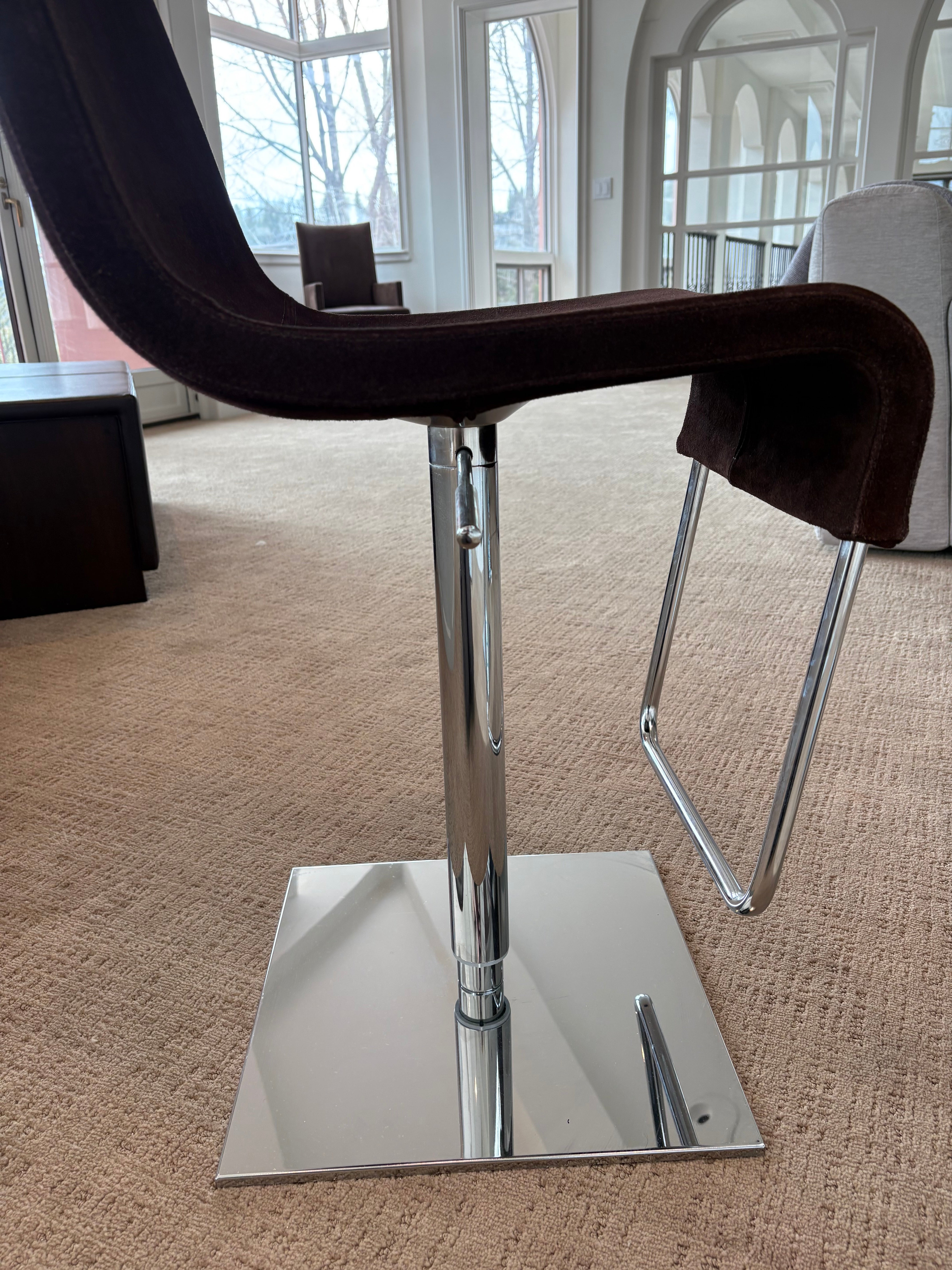 Bonaldo "Skipping" swivel barstool in brown upholstery, chrome base. Adjustable height.