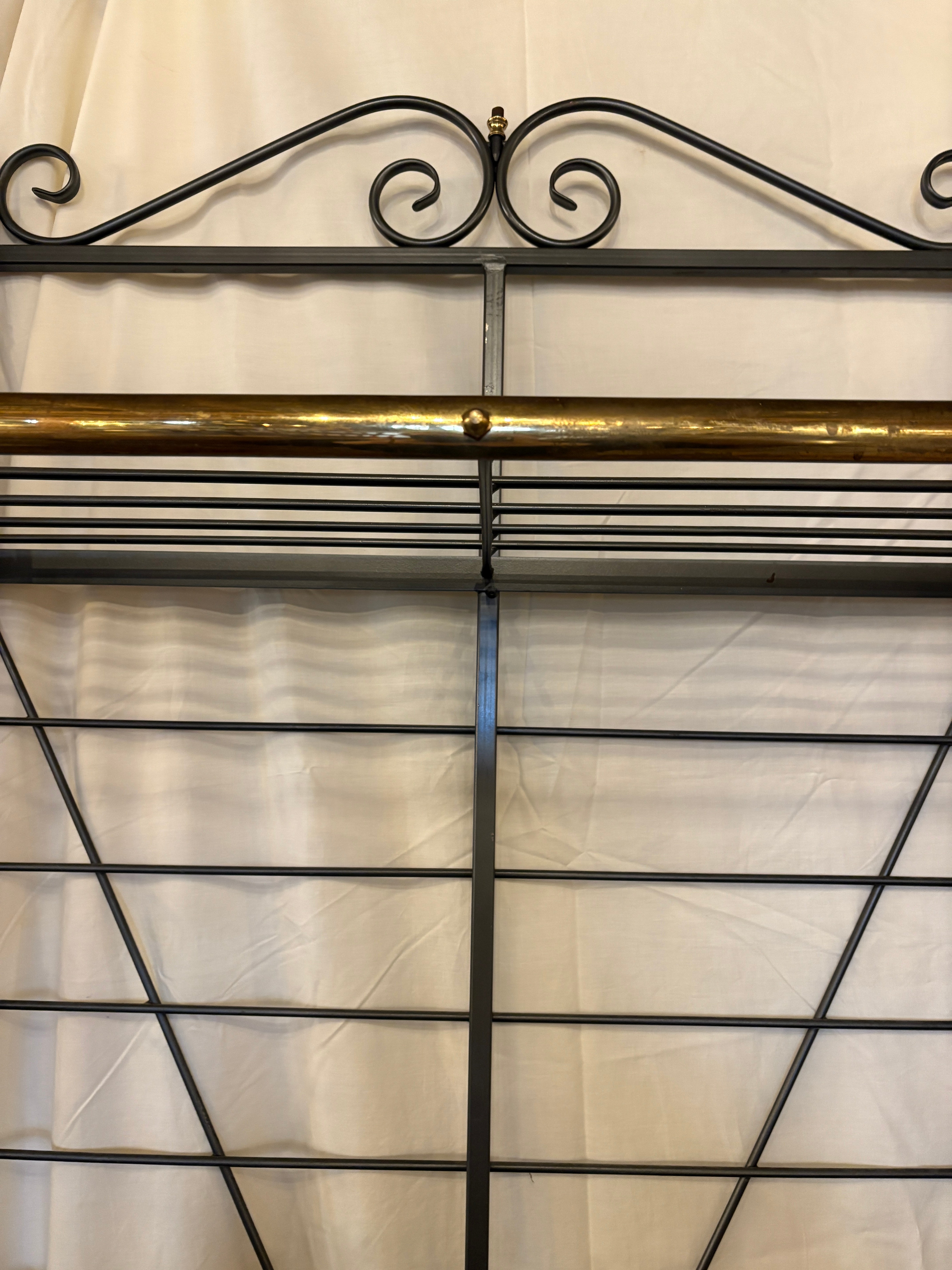 Brass and Iron Baker's Rack with four shelves, cross bar in back for added stability and decorative scroll work on top and sides.