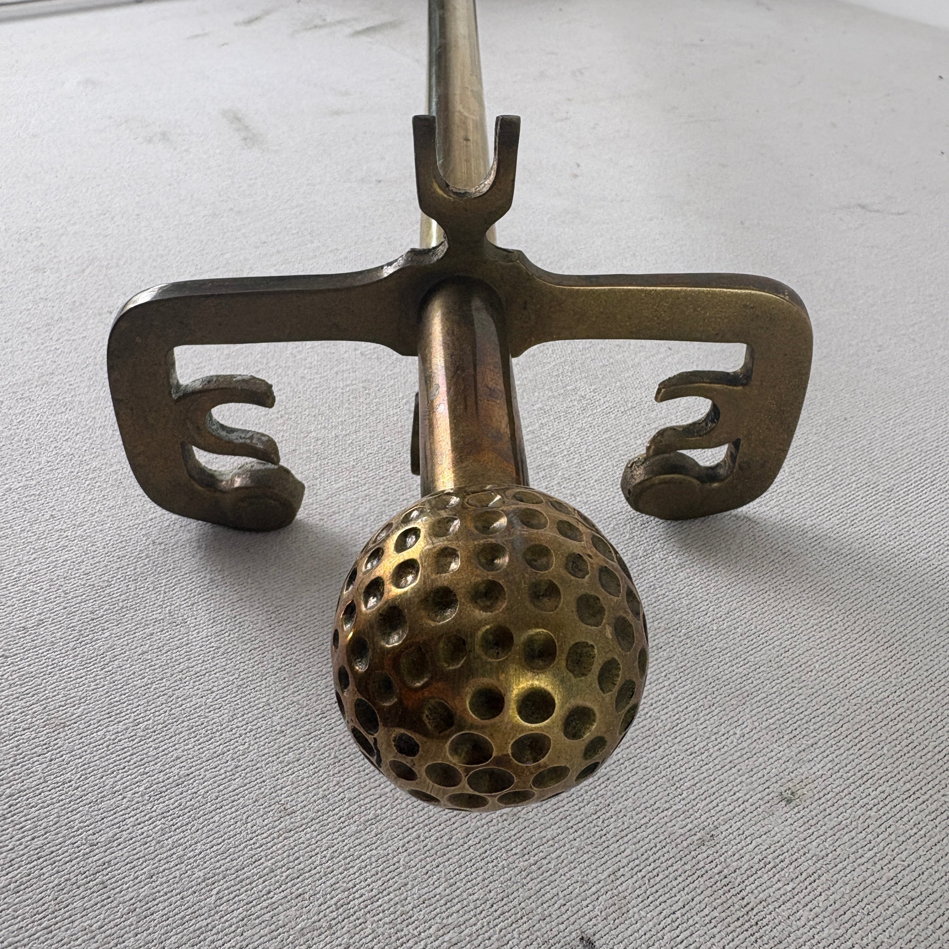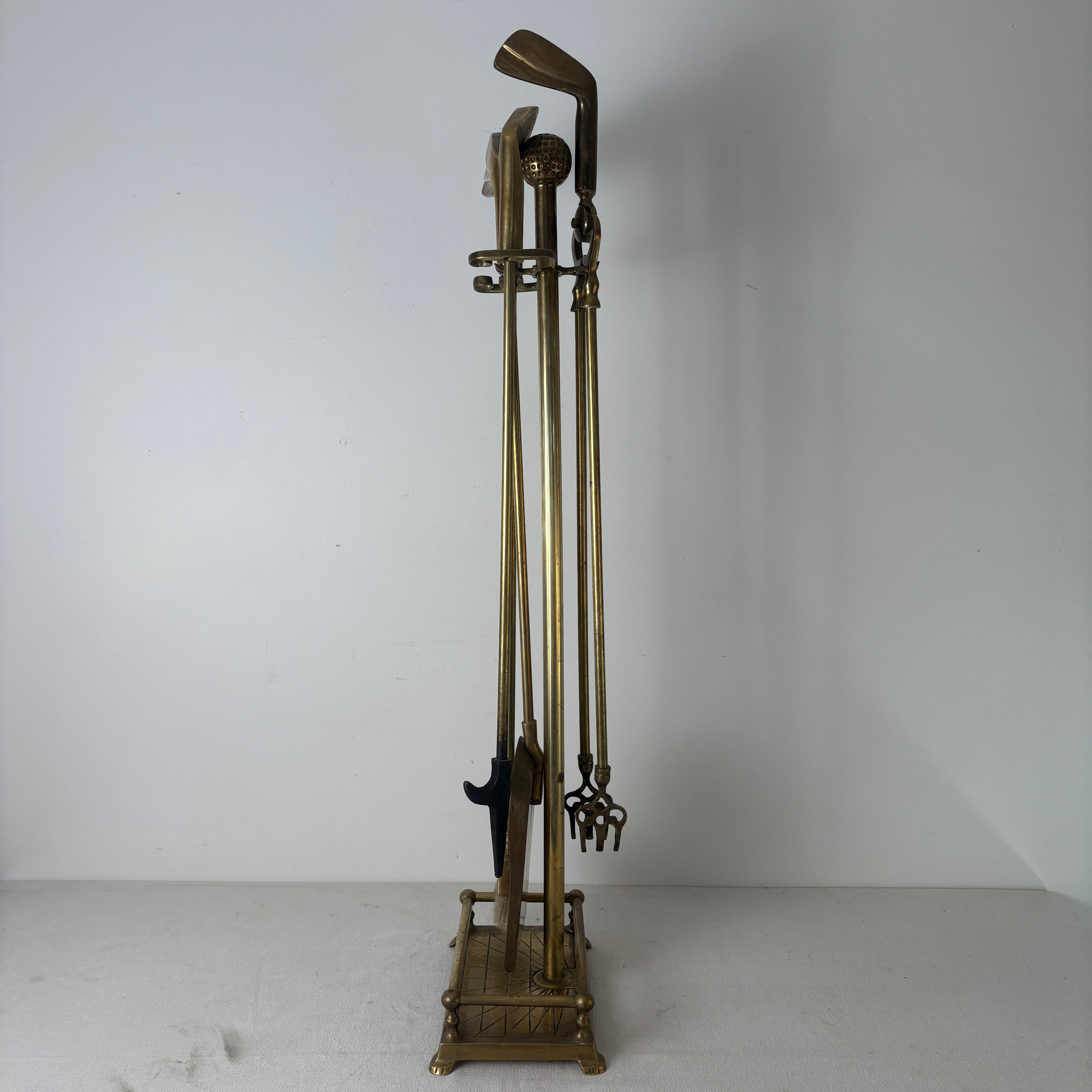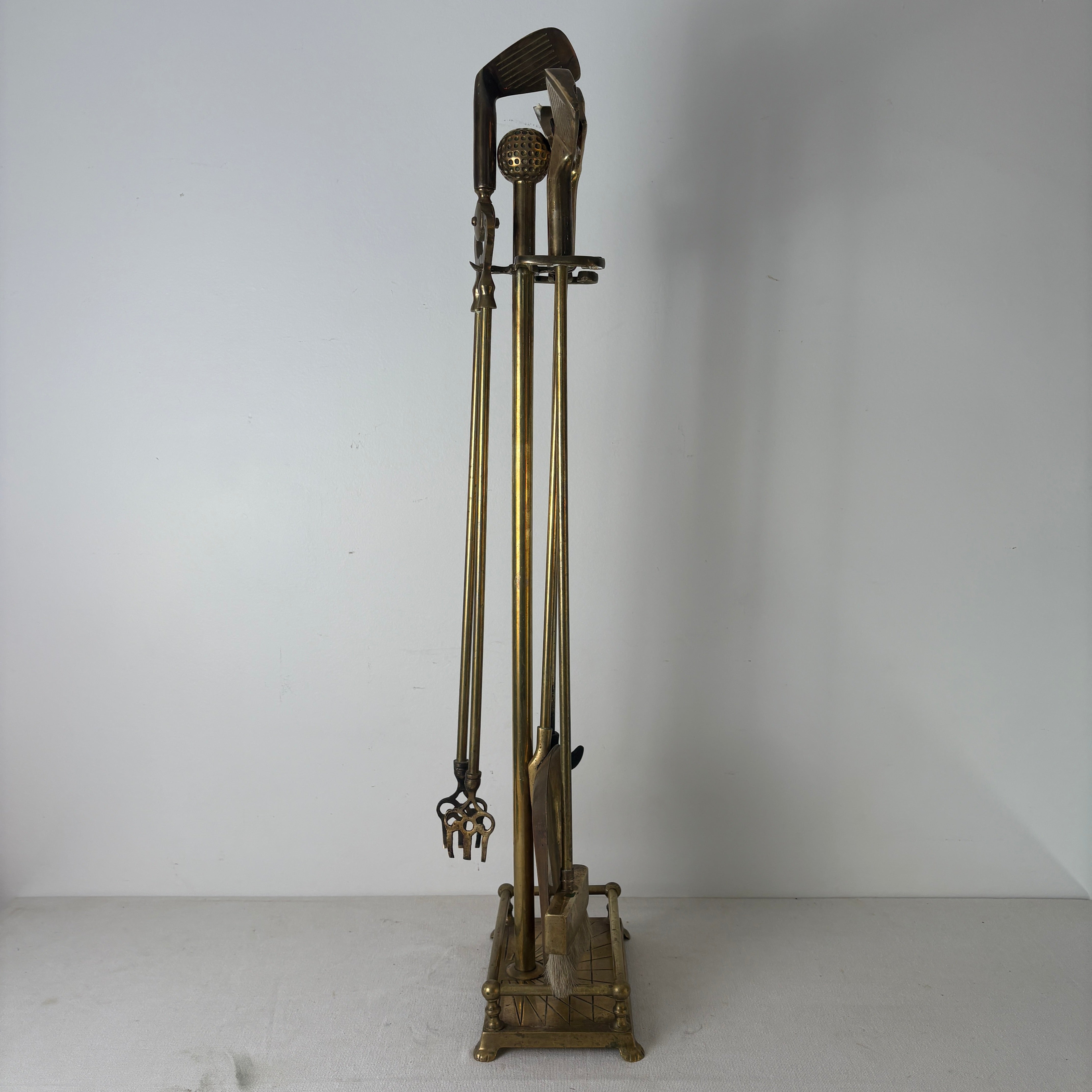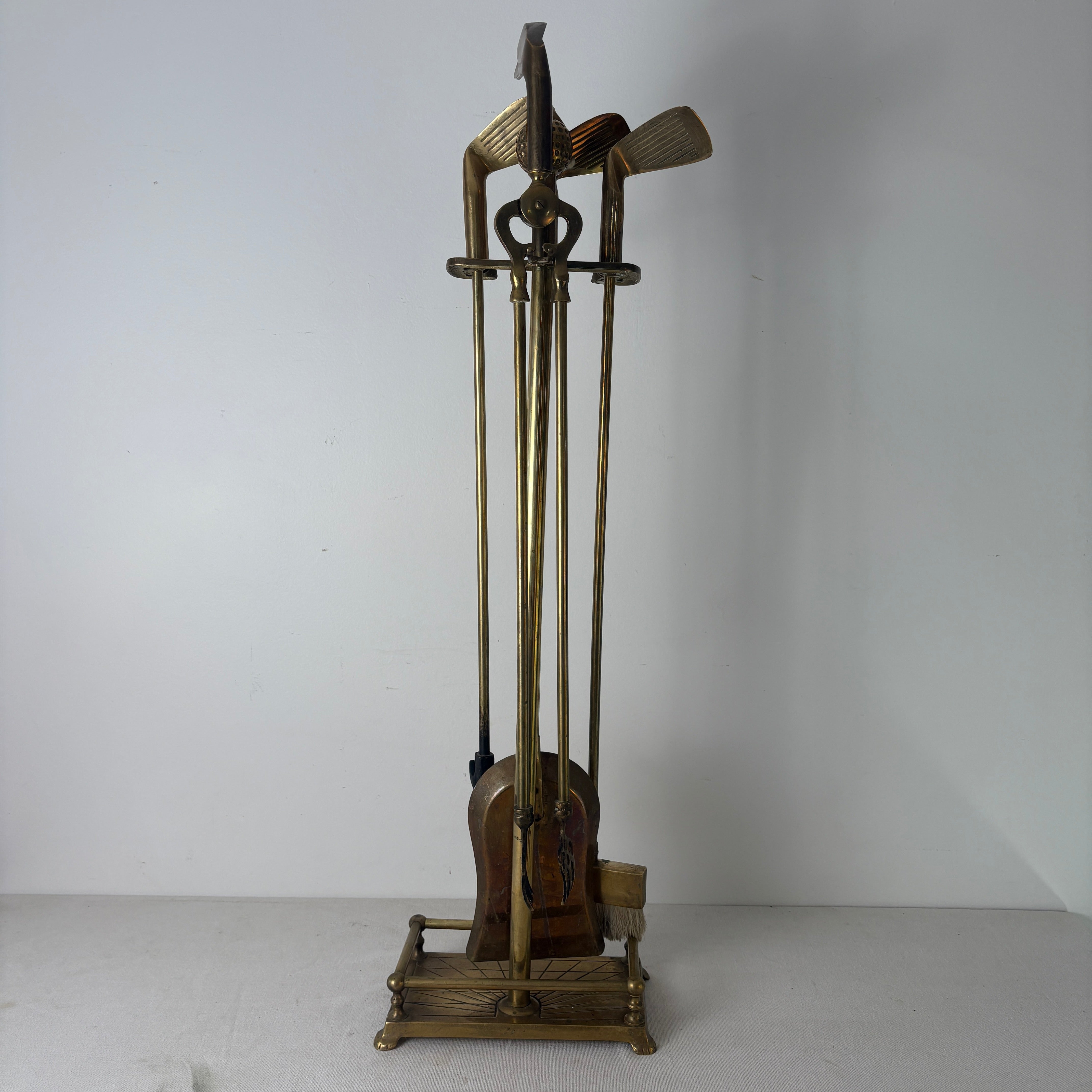 Brass Golf Themed Fireplace Tool Set in Brushed, Aged Brass. Five Piece including Frame.