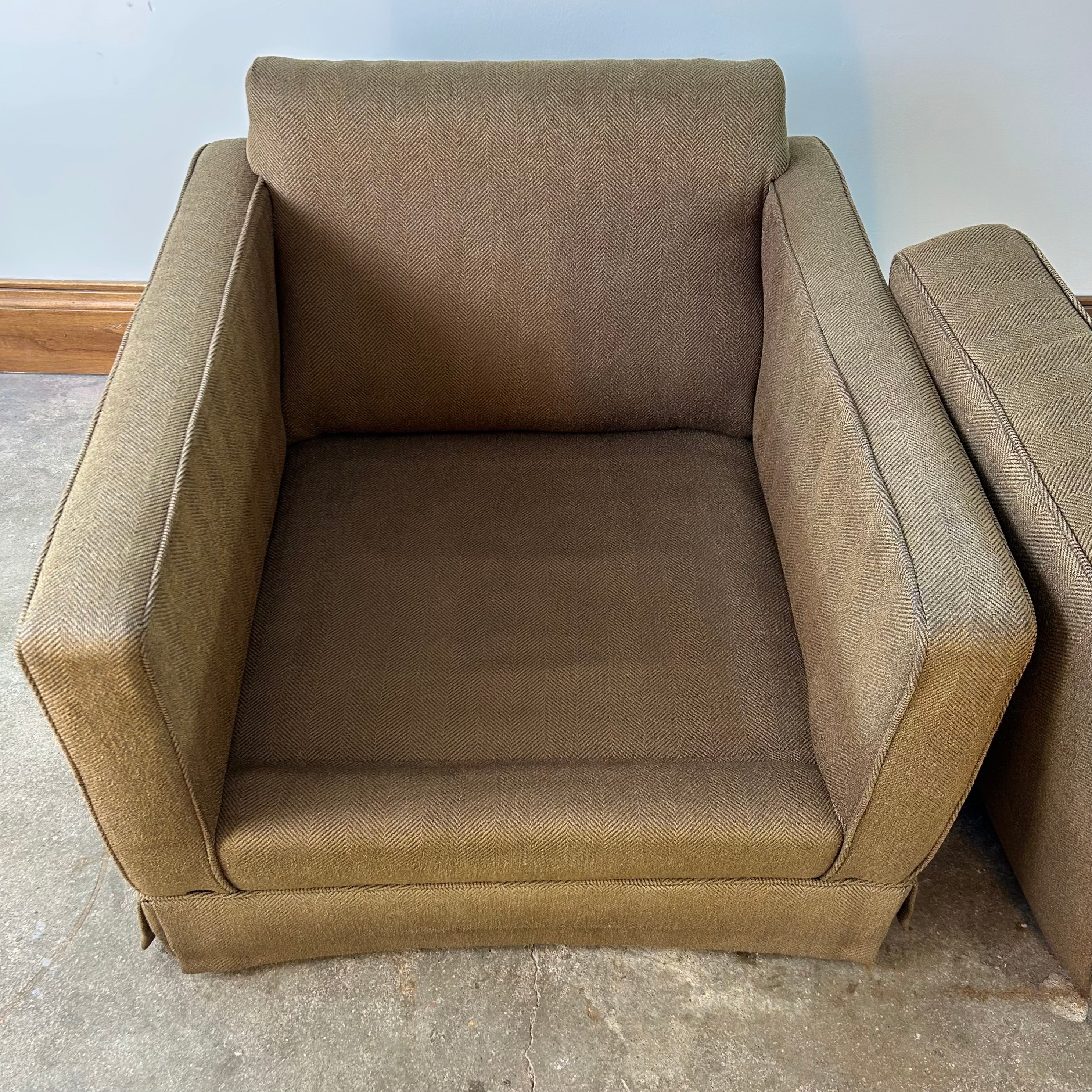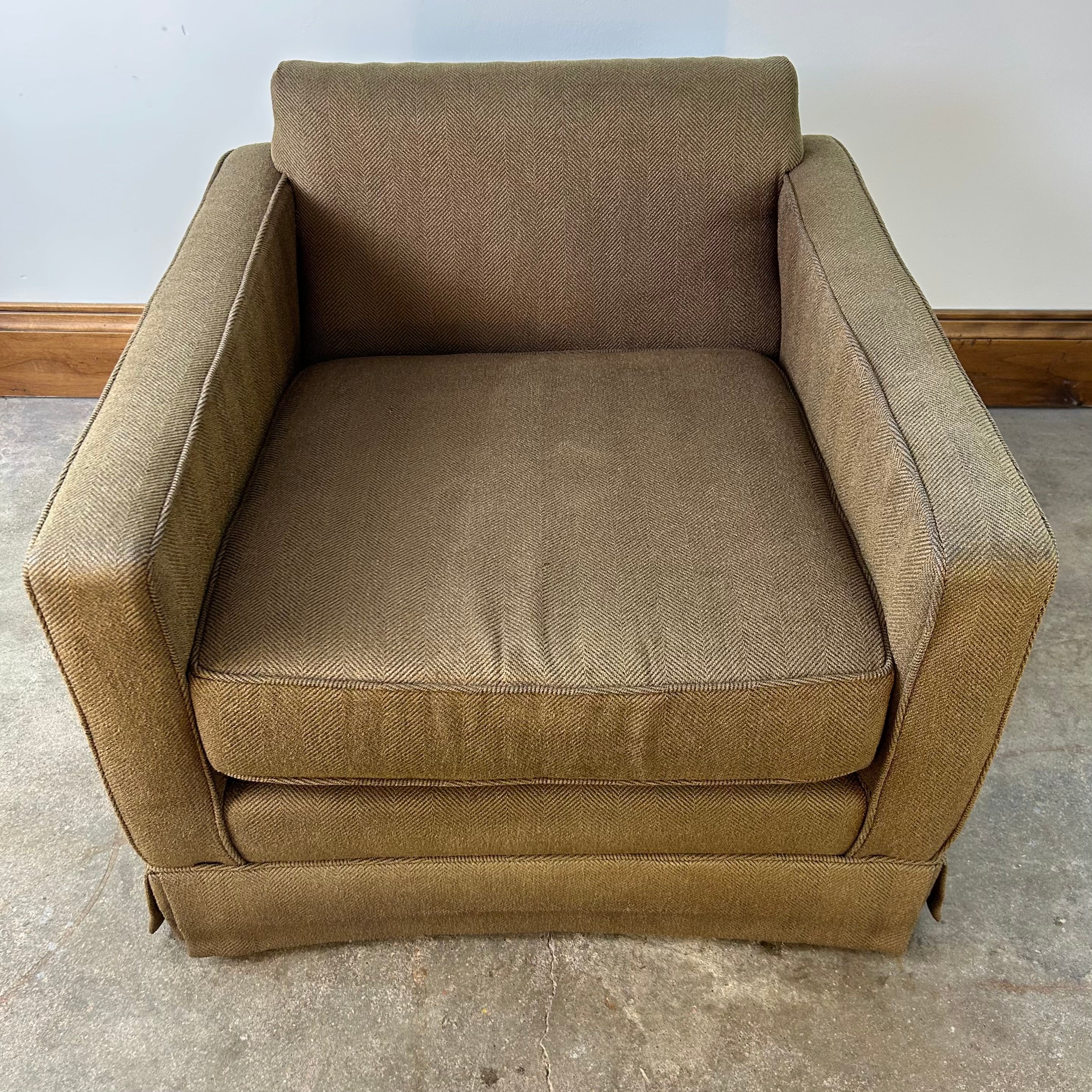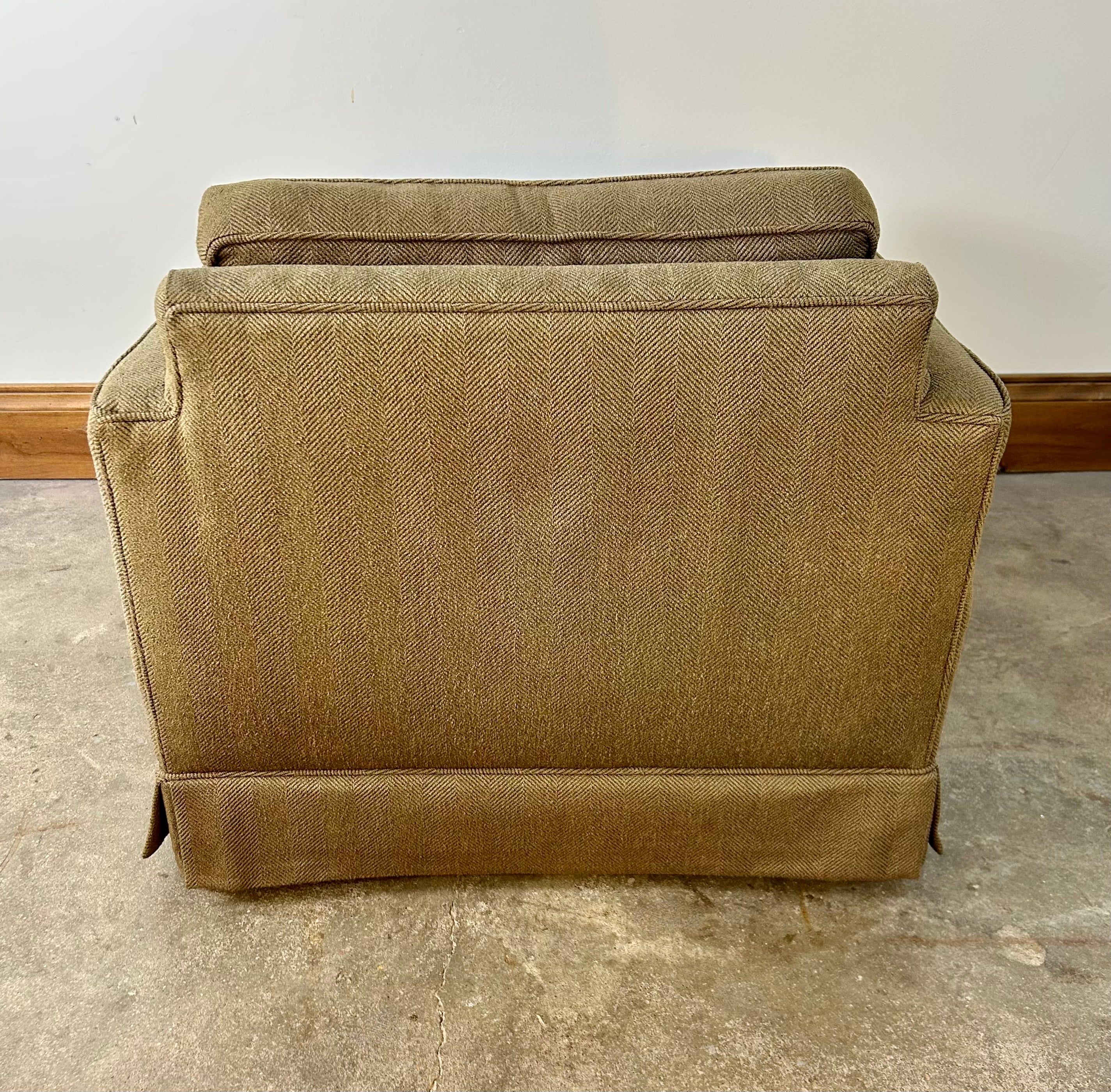 Lounge Chair in Brown Green Herringbone Upholstery Fabric with Track Arms and Skirted Detail.