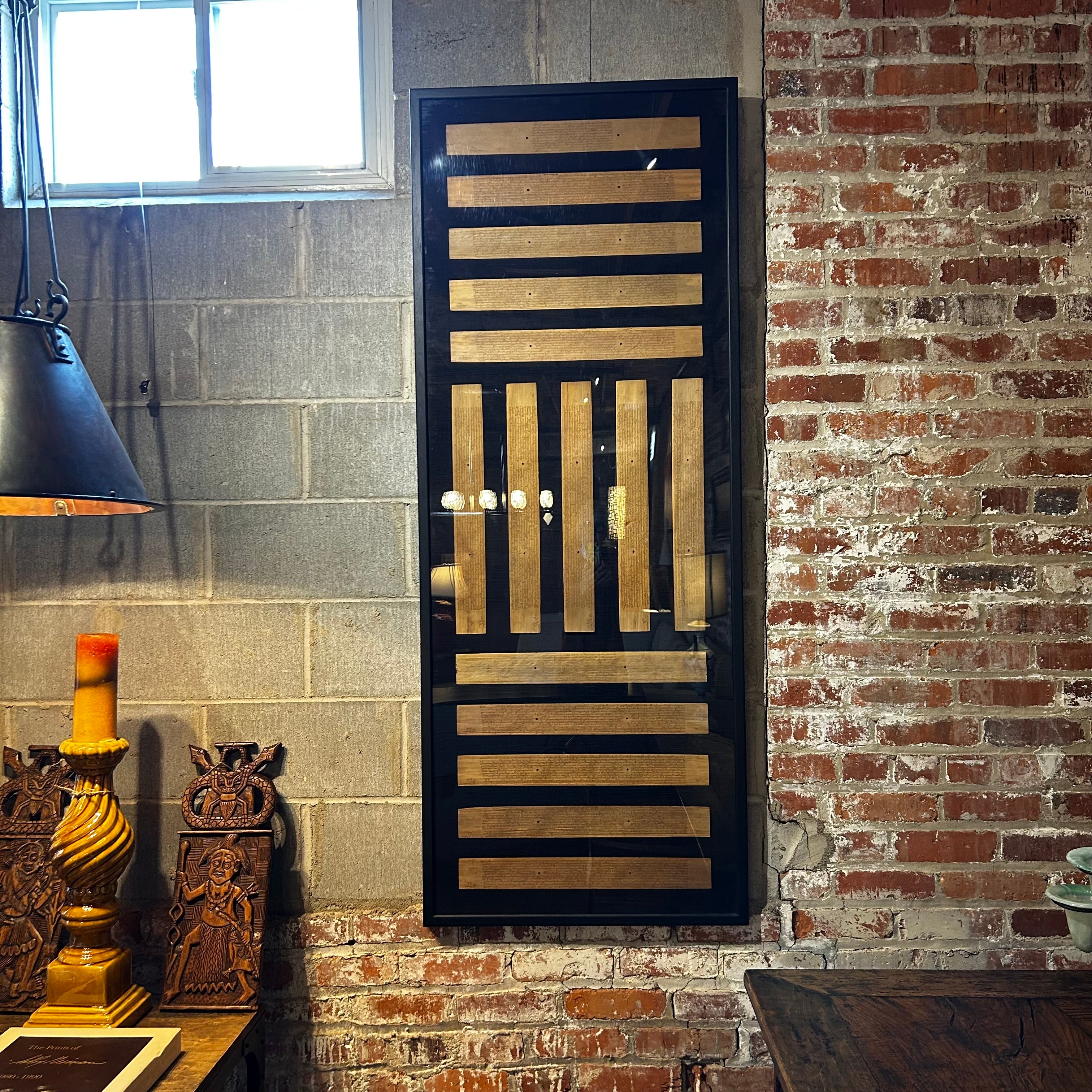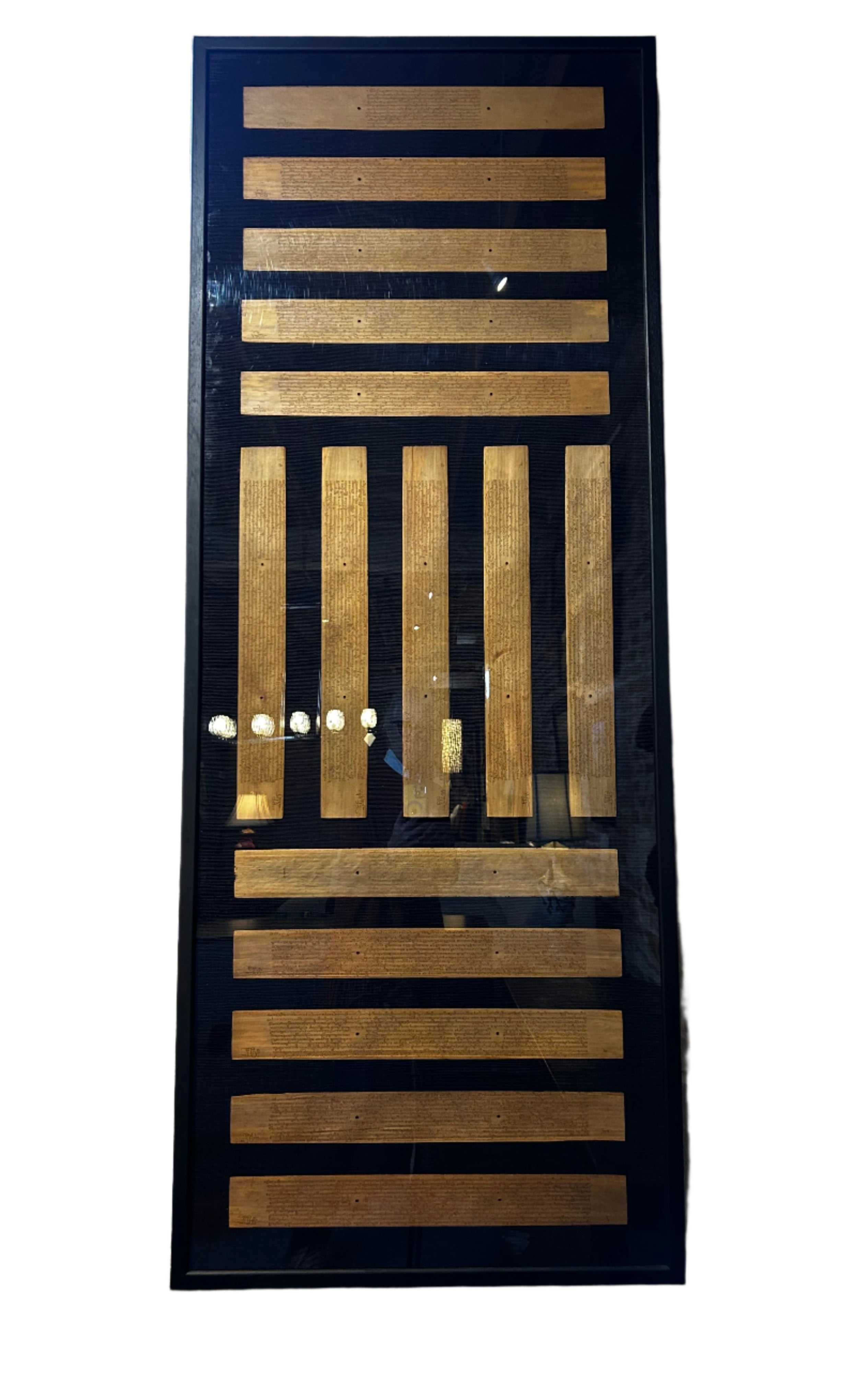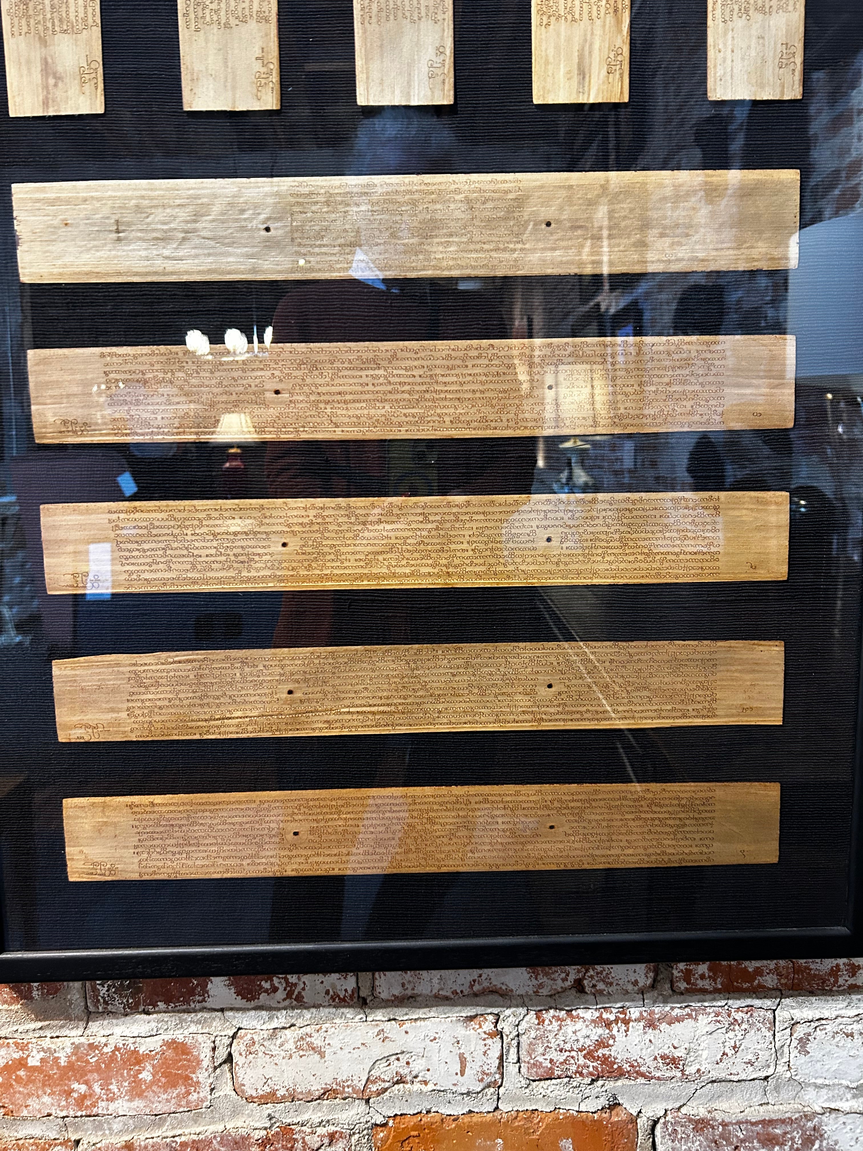 Burmese handwriting on handmade strips of paper, framed in black wood with plexiglass cover.