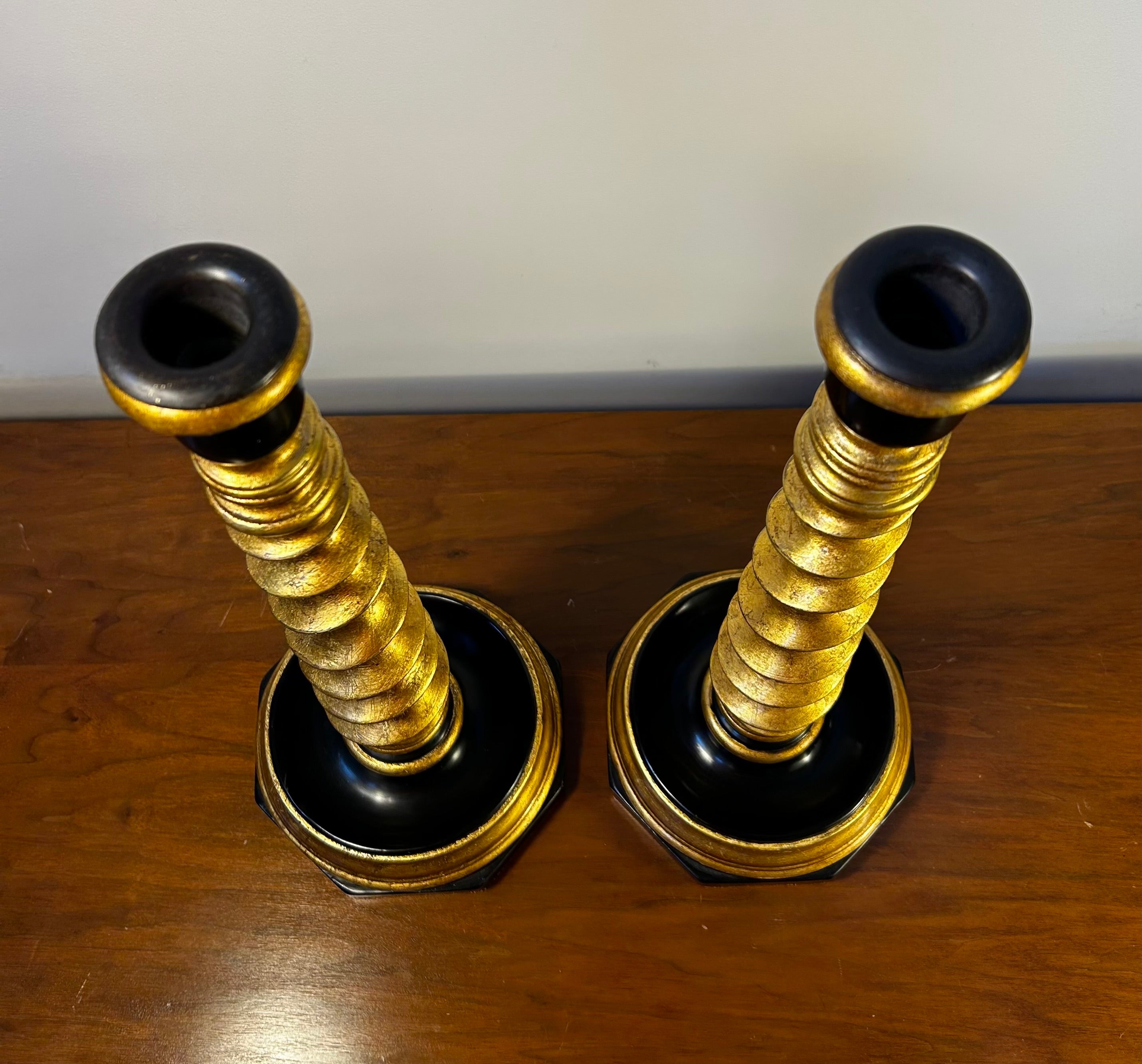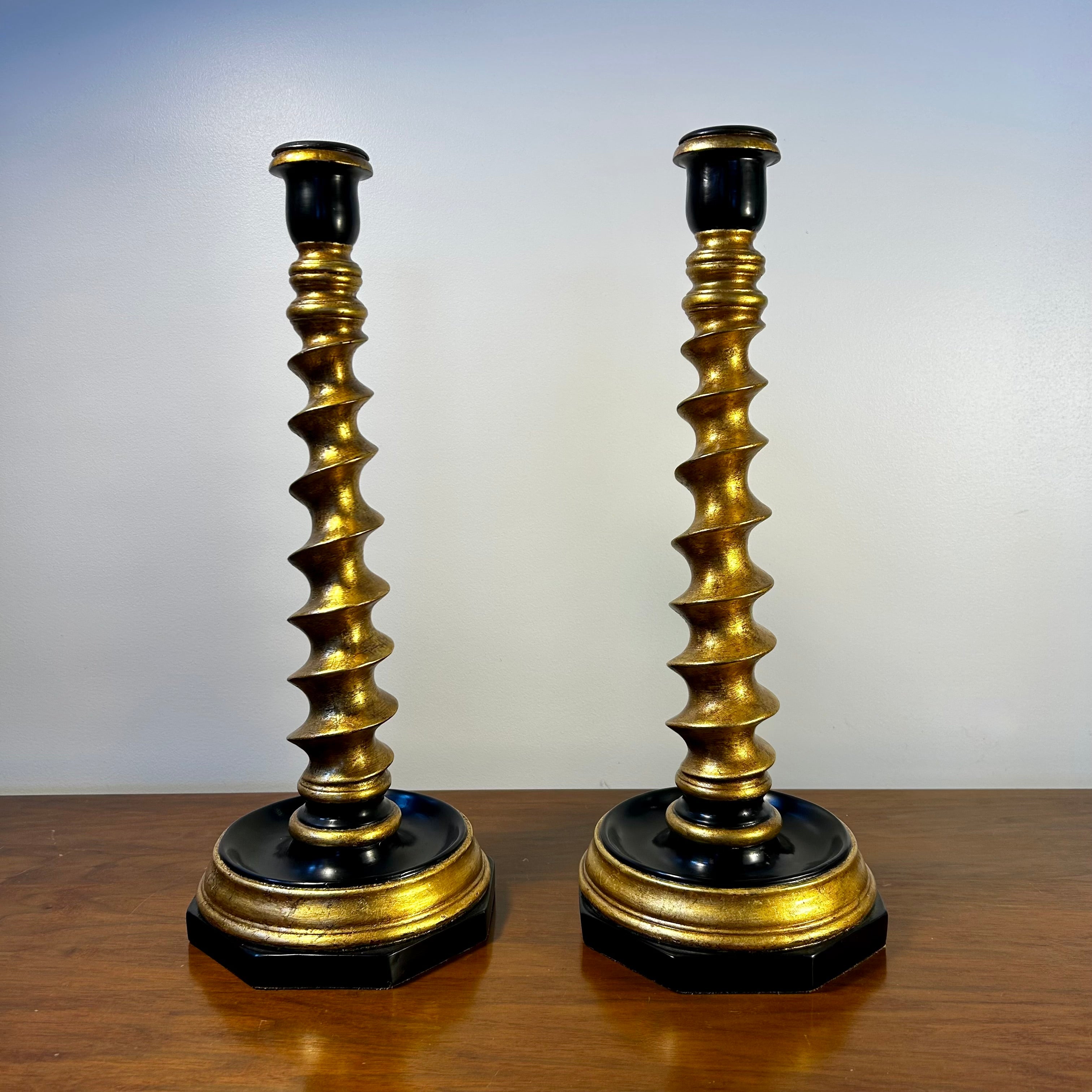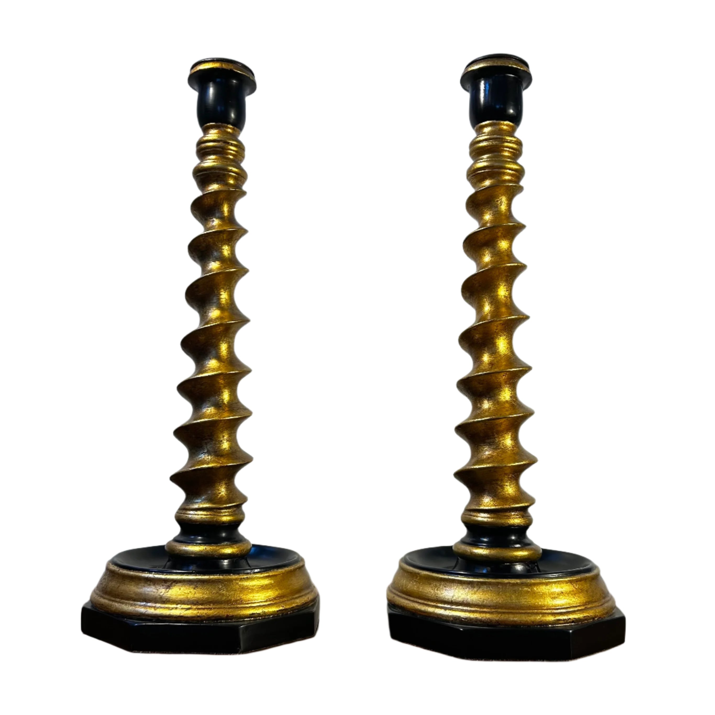 Candle stands in gold and black with barley twist design, octogonal shaped base with leather on the bottom. Sold as a pair.