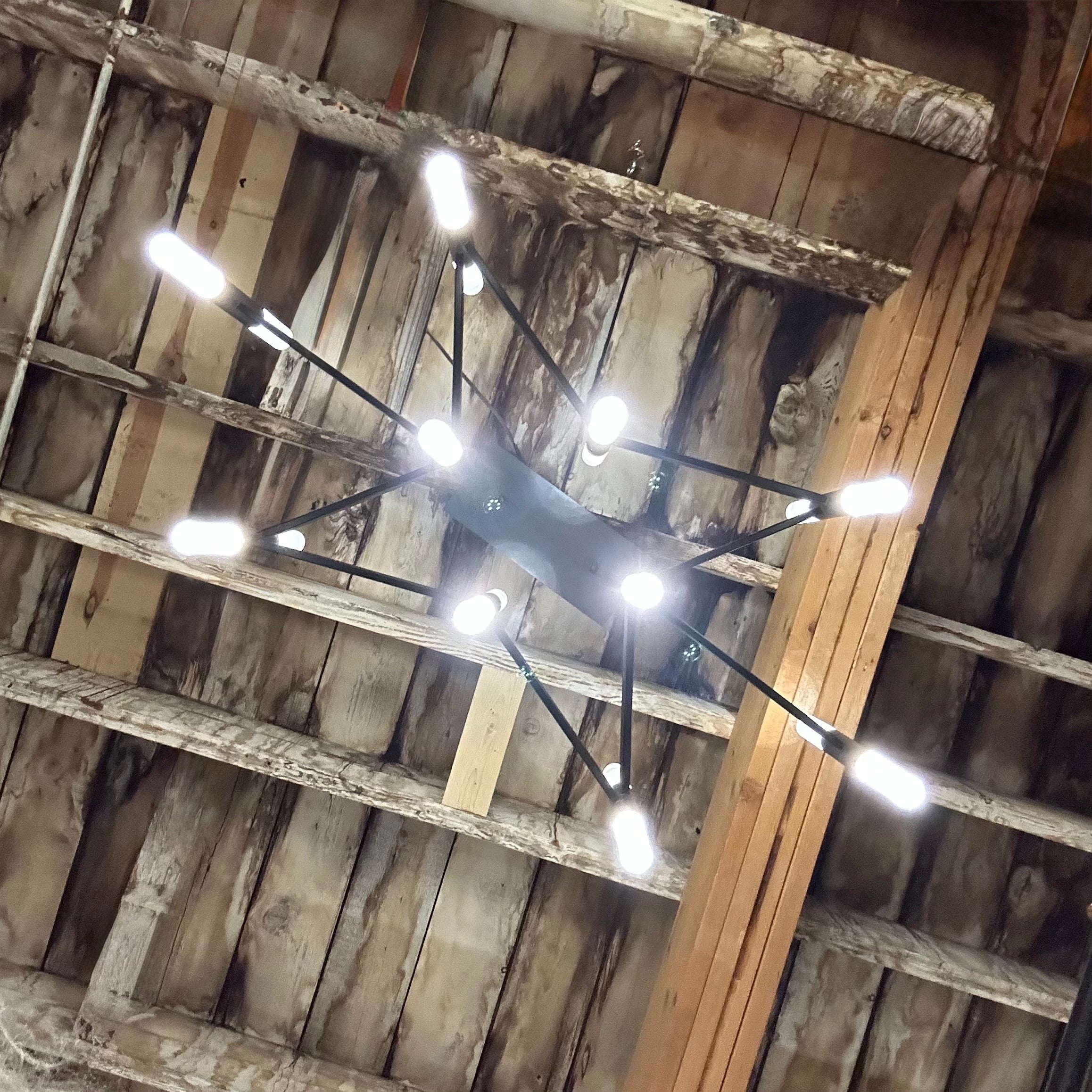 Chandelier with black metal frame and white candle stick style lights. Contemporary in design with two upper support rods. 16 lights.