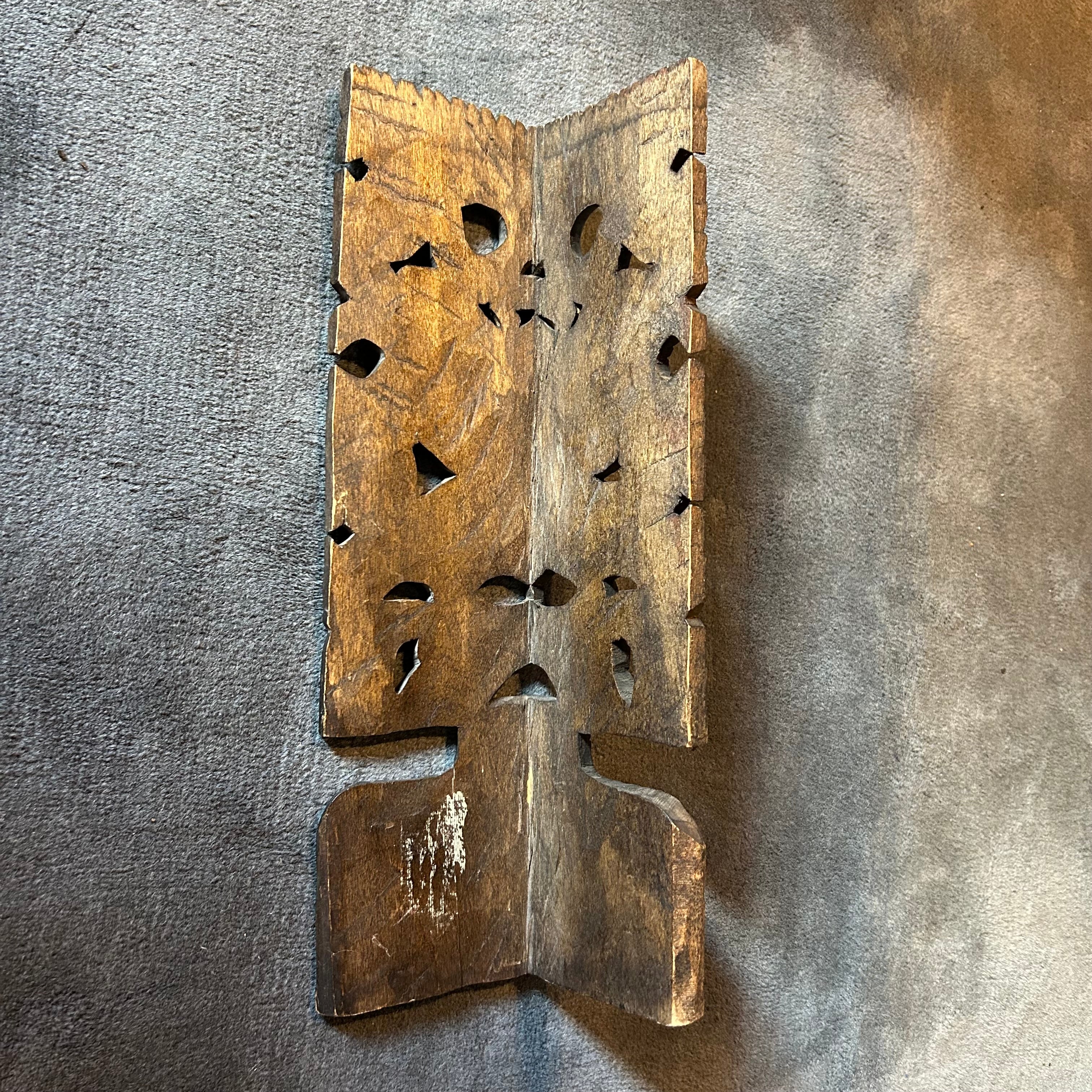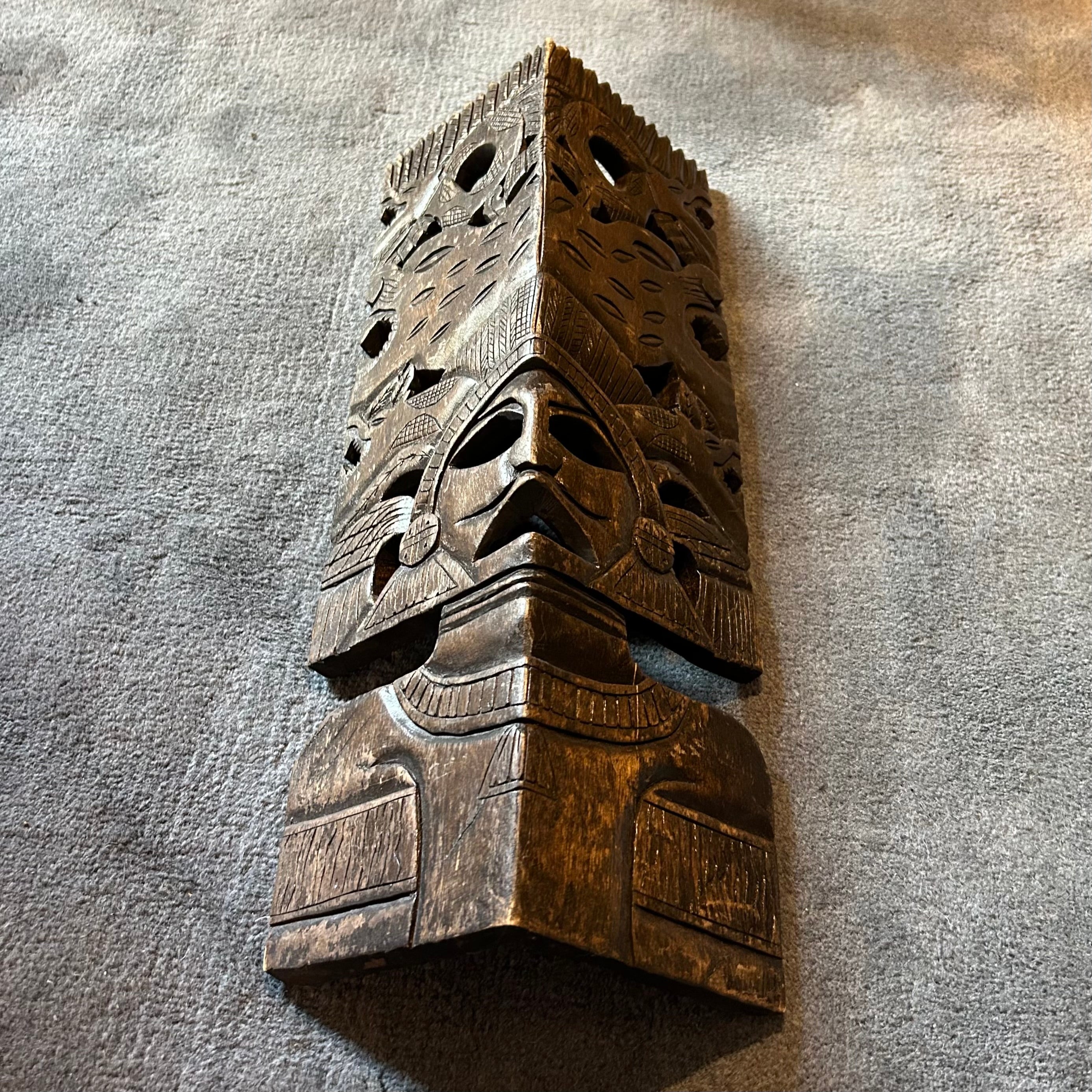 Hand carved wood mask, wood cut out, possibly mayan with "L" shape sides.