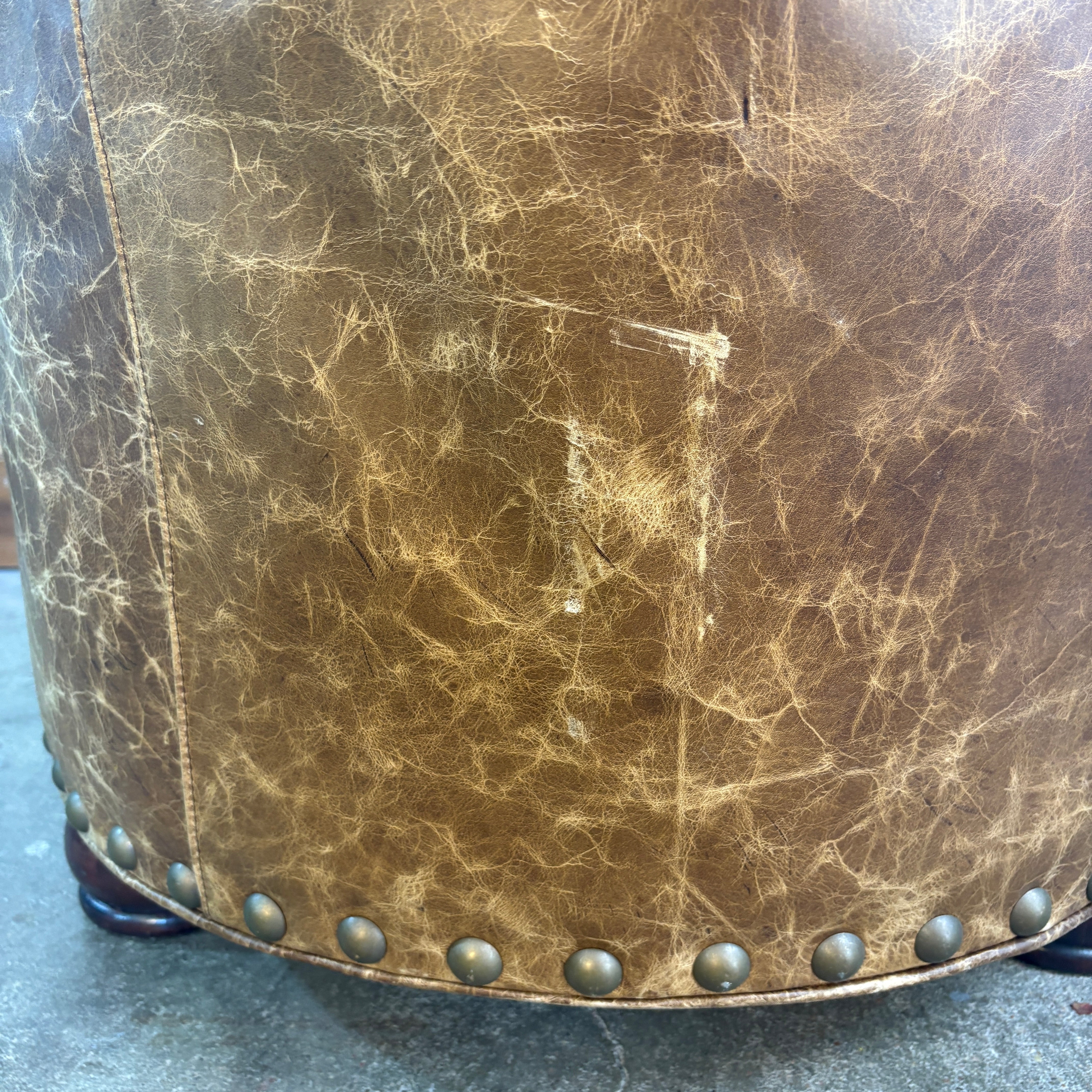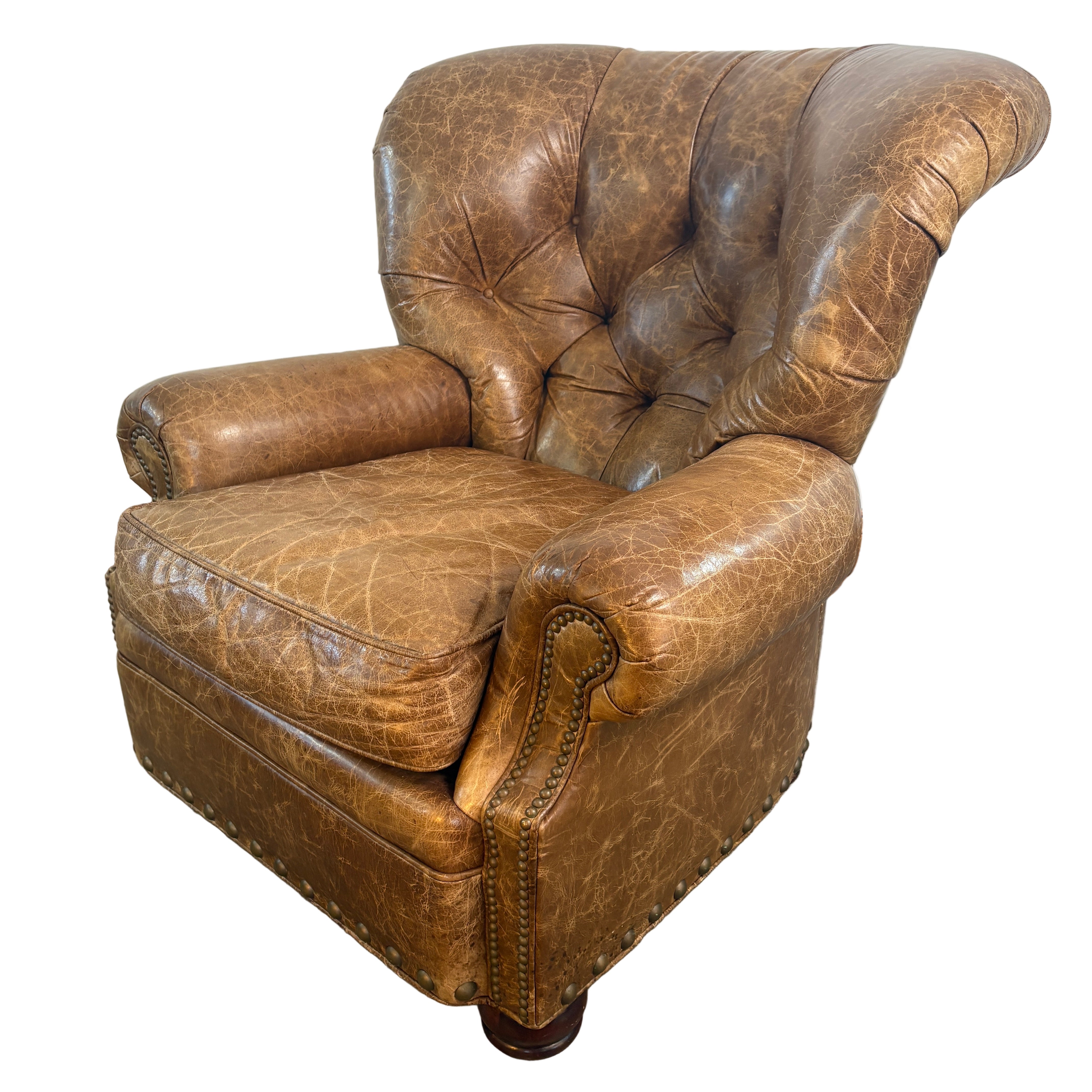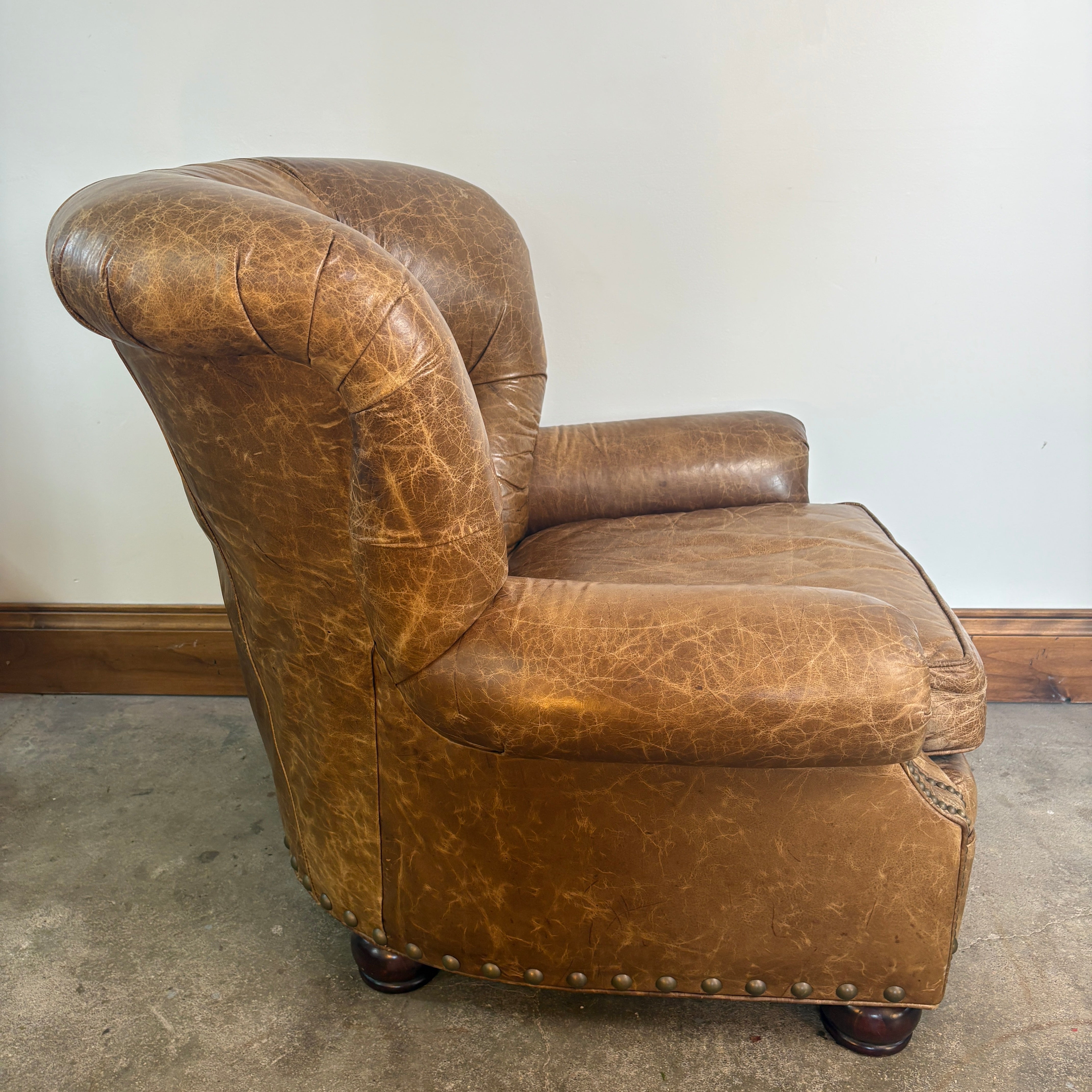 Century leather tufted wingback armchair in light brown with distressed leather and nail head detail.