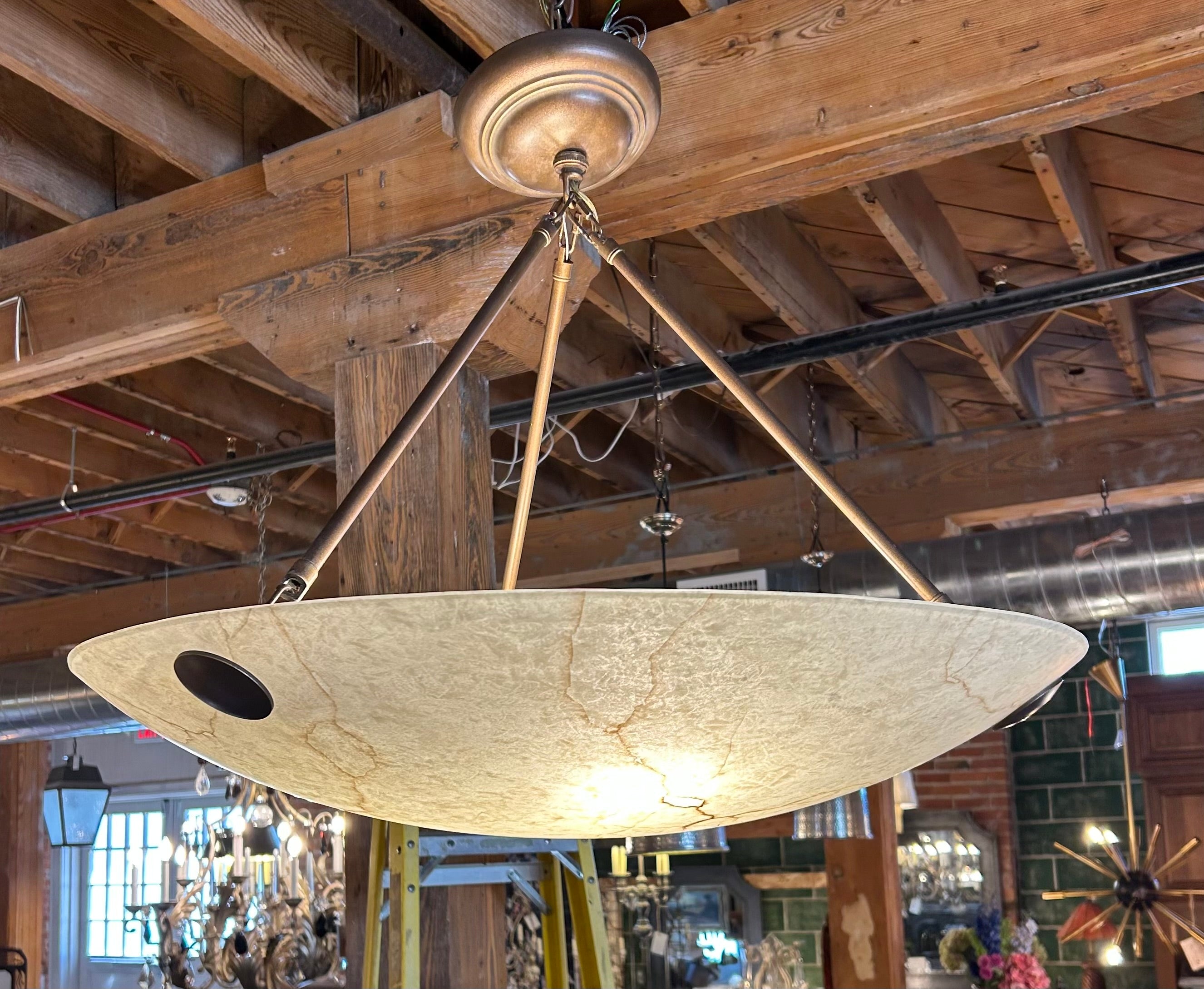 Chandelier in Faux Alabaster, Round, Three Arm with Copper Colored Metal Hardware and three standard light sockets.