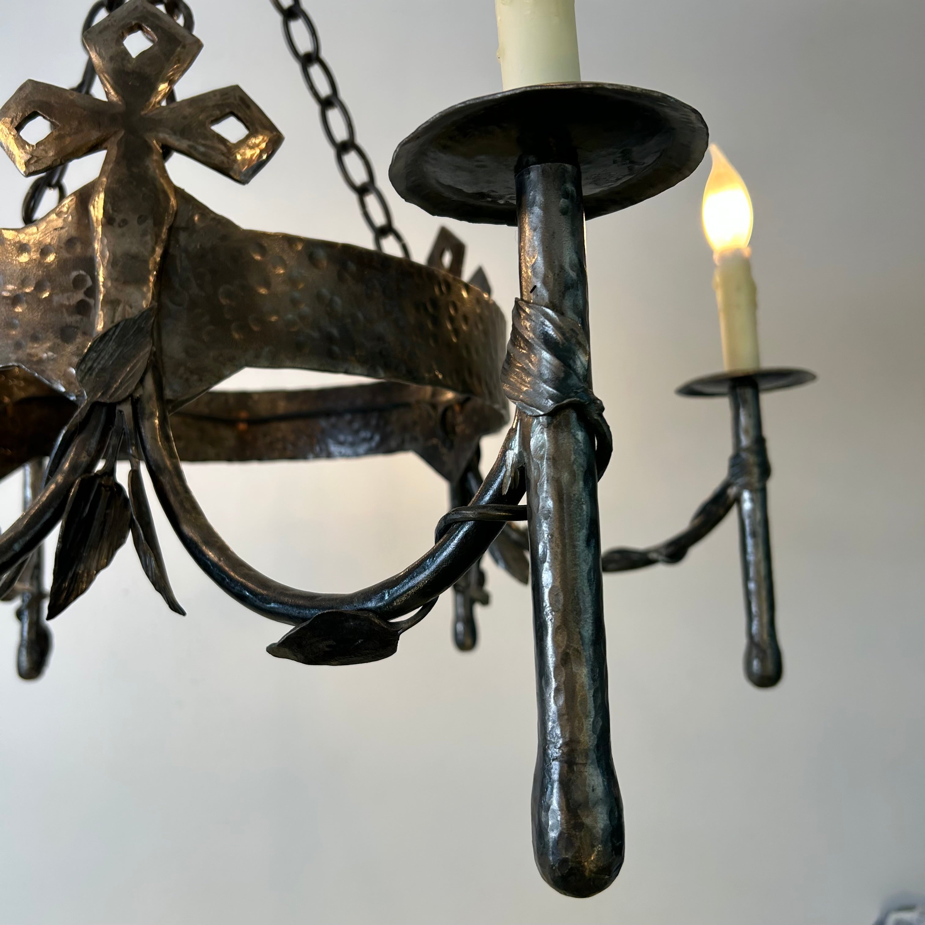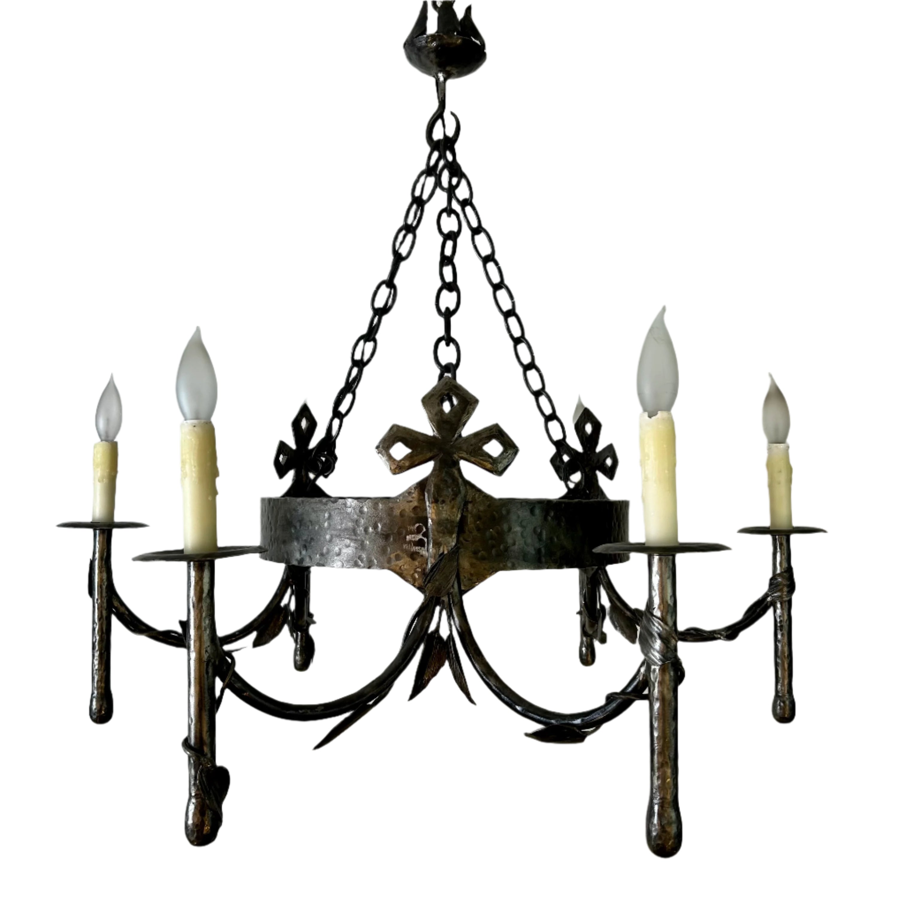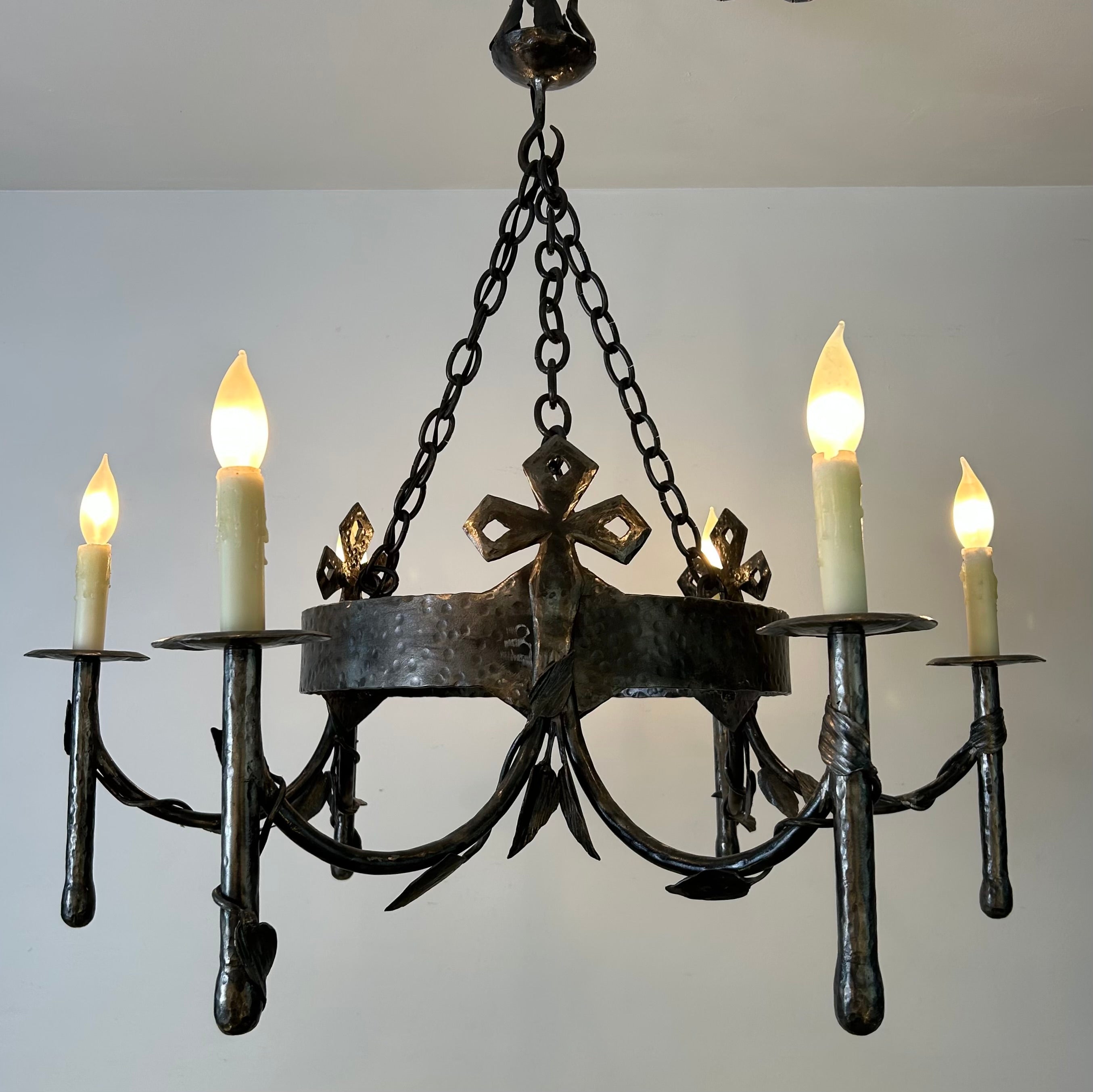 Chandelier in gothic style with a pewter finish, six candlesticks.