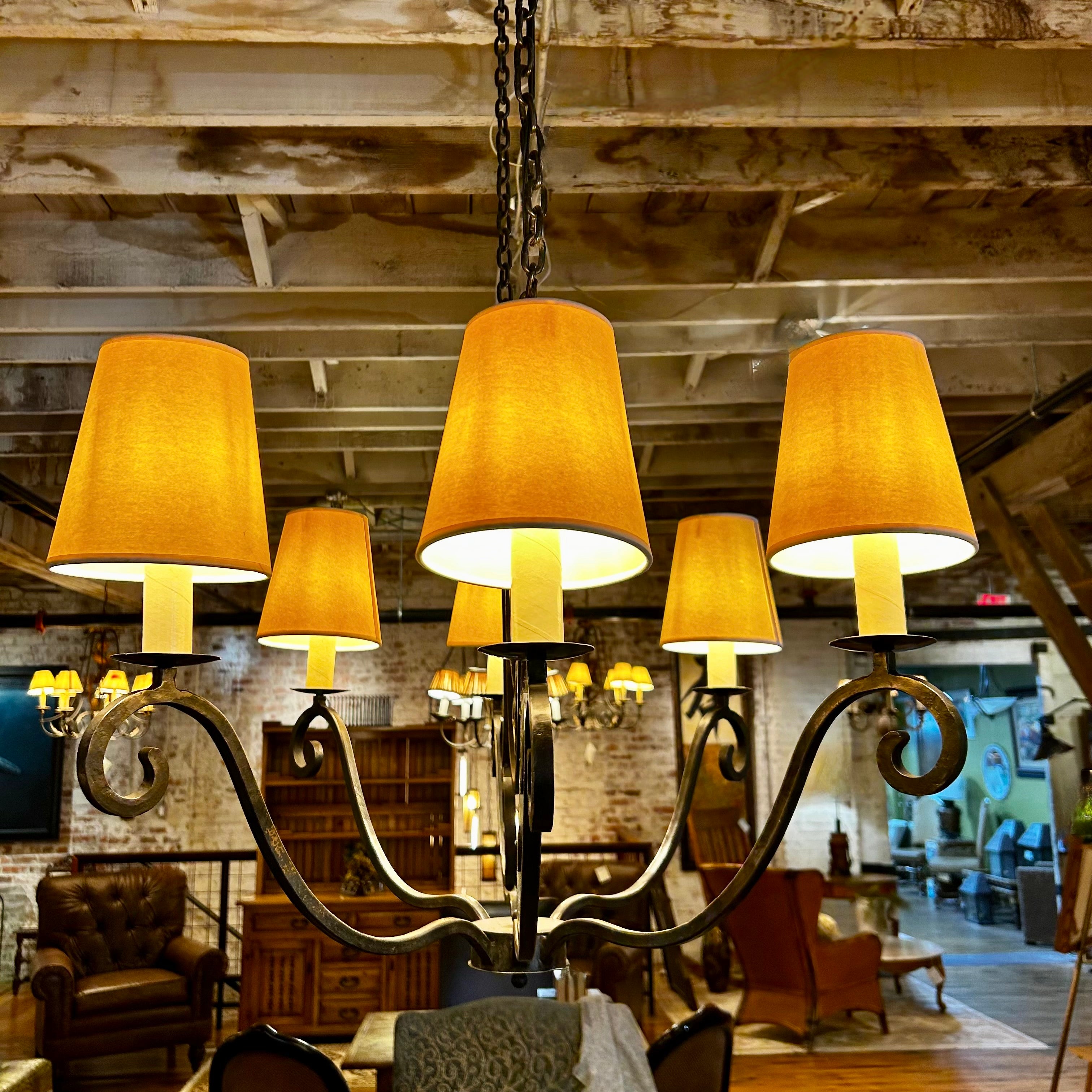 Chandelier, Iron, Black, Six Arm, Six Candle Stick, Branch with Leaves Design, Rustic. Shades included. Uses standard light bulbs.