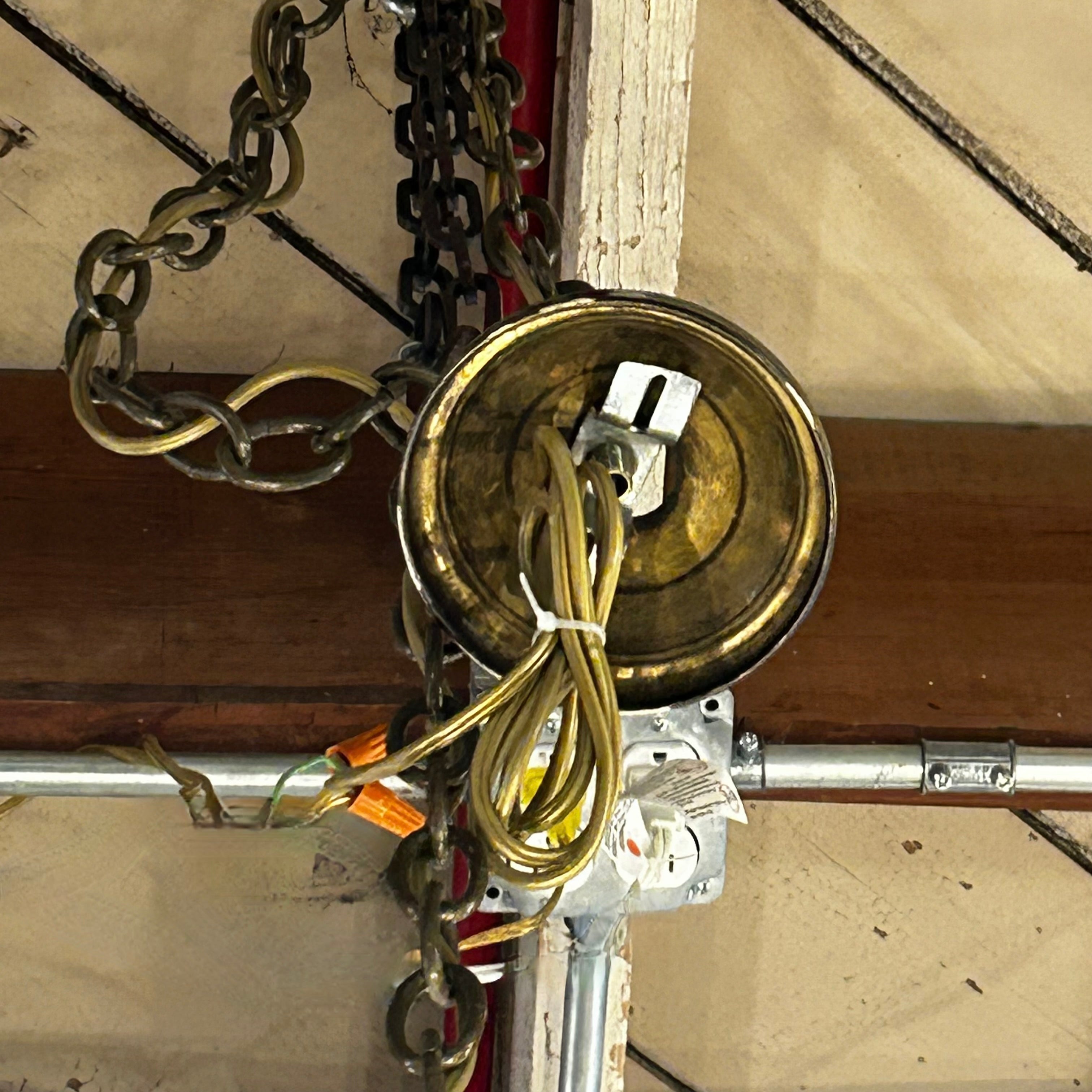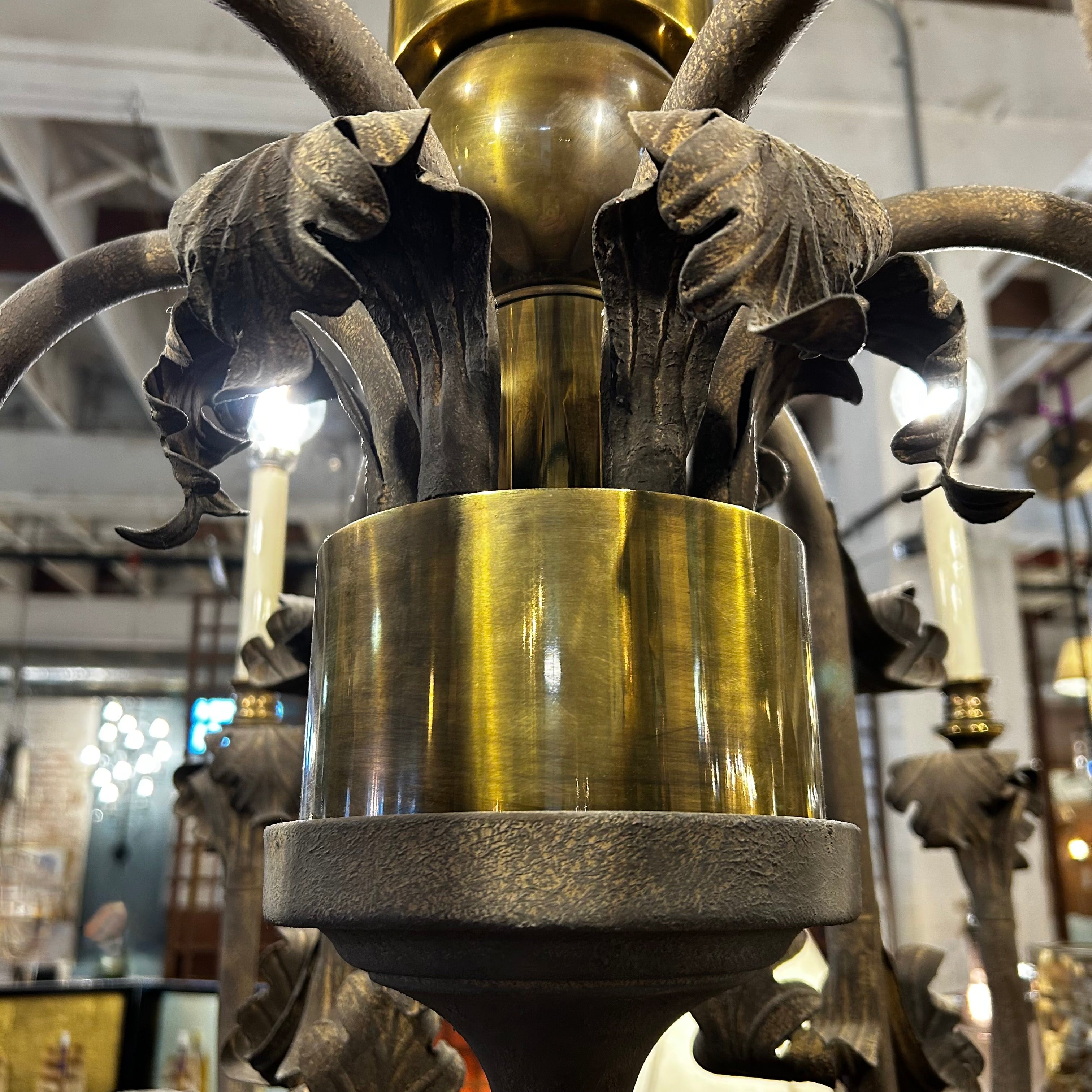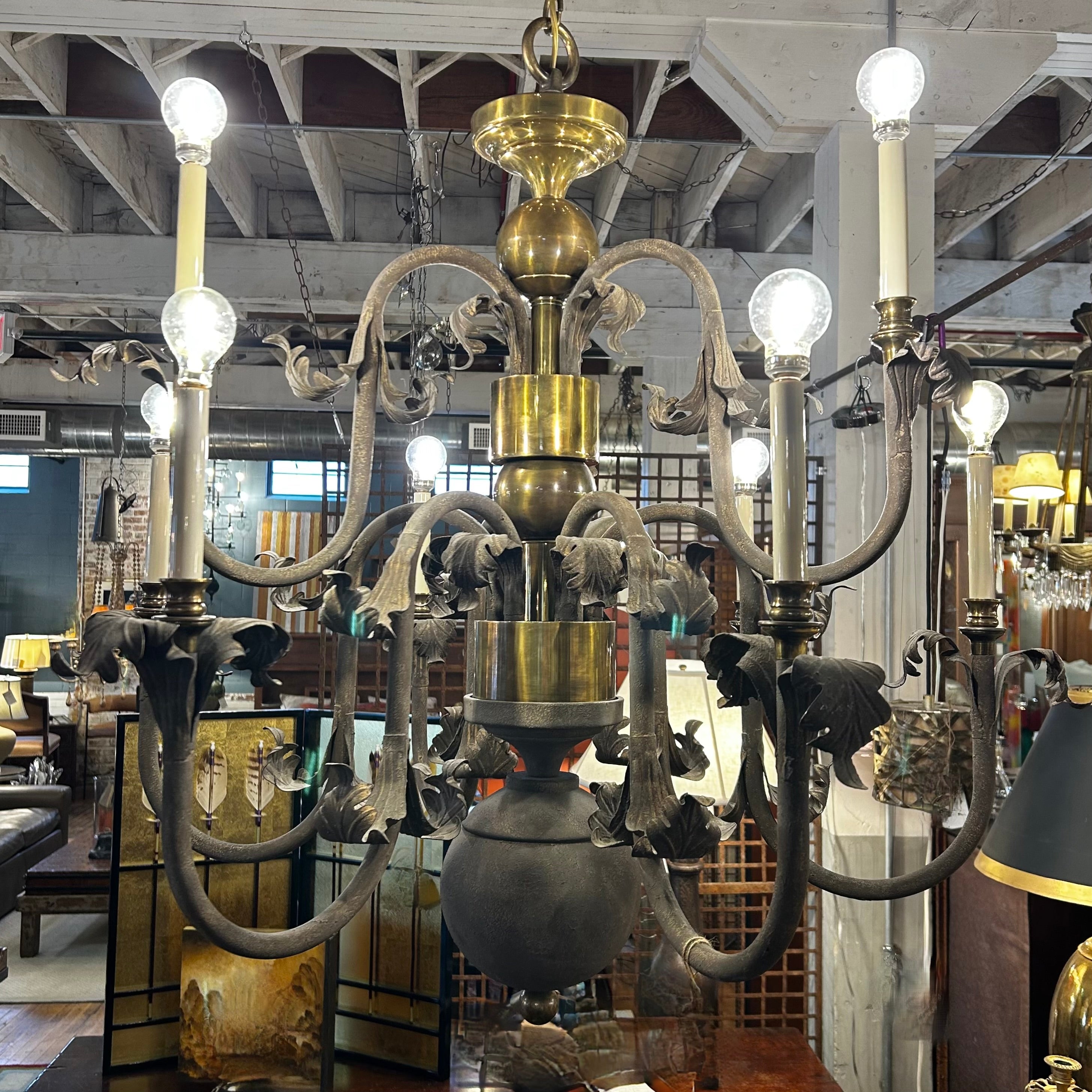 Chandelier, rustic finish brass and painted metal bronze-look framework. It has nine-lights which are small socket.