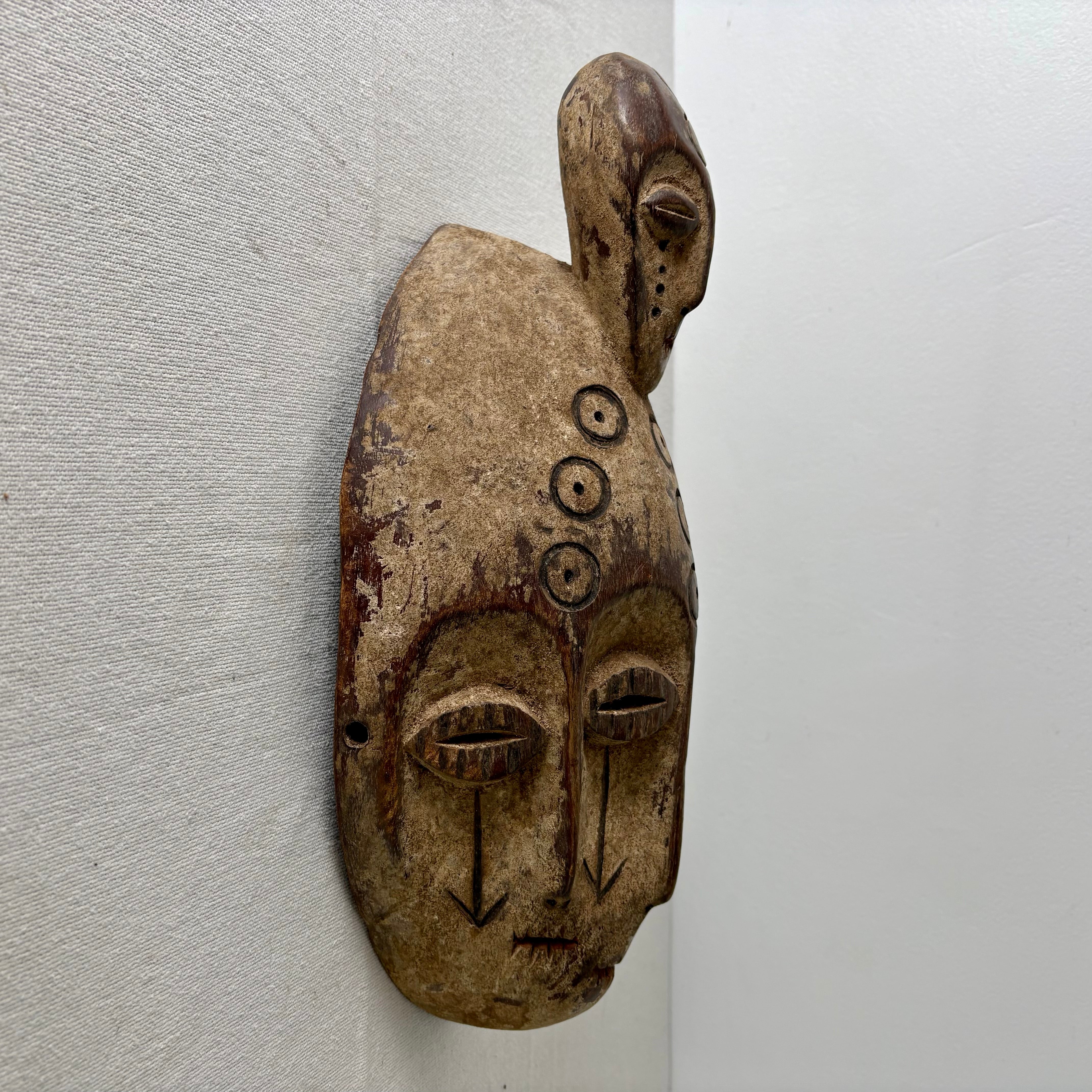 Congo fertility mask, with two heads, hand carved, primitive. The lower head has four eyes. Note: we do not have papers of authenticity on this, but it comes from a longtime art collector's estate (along with dozens of other notable masks).