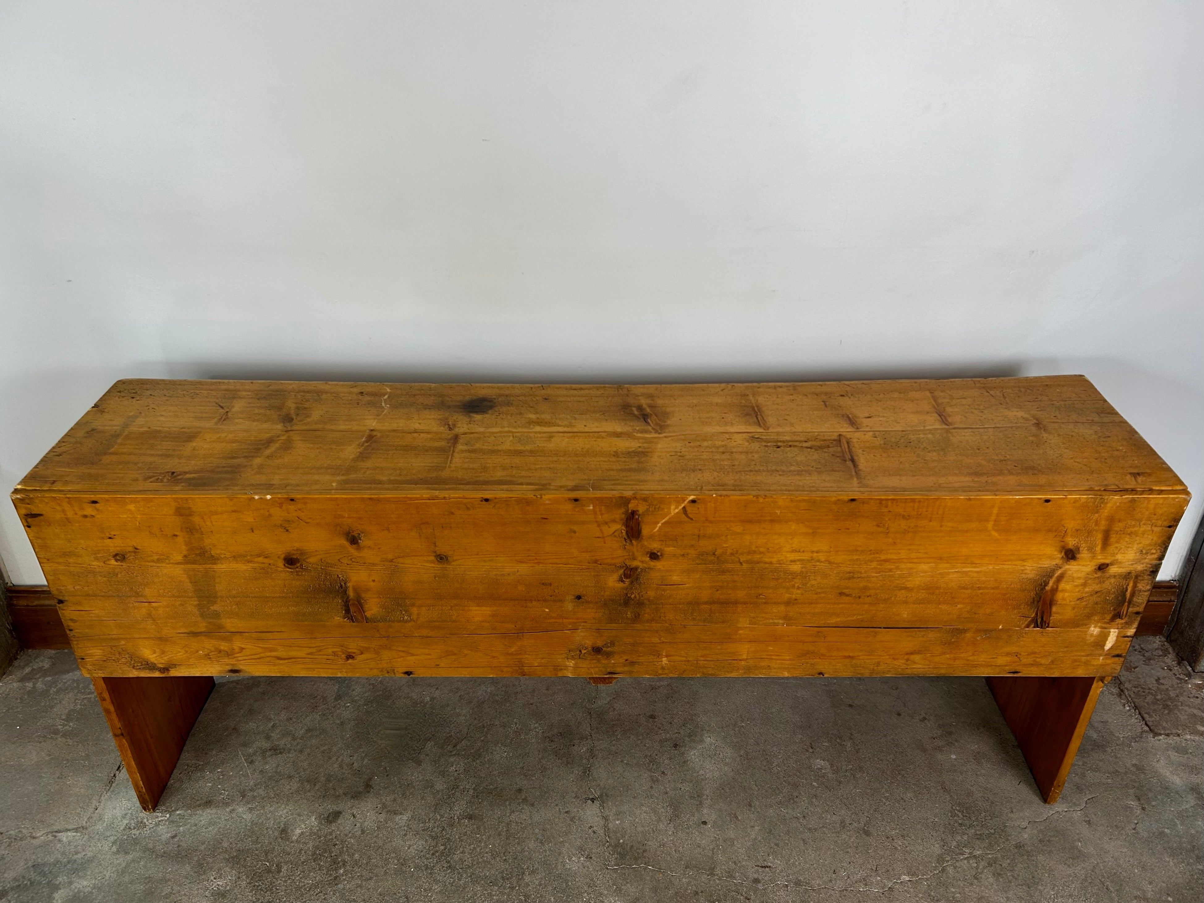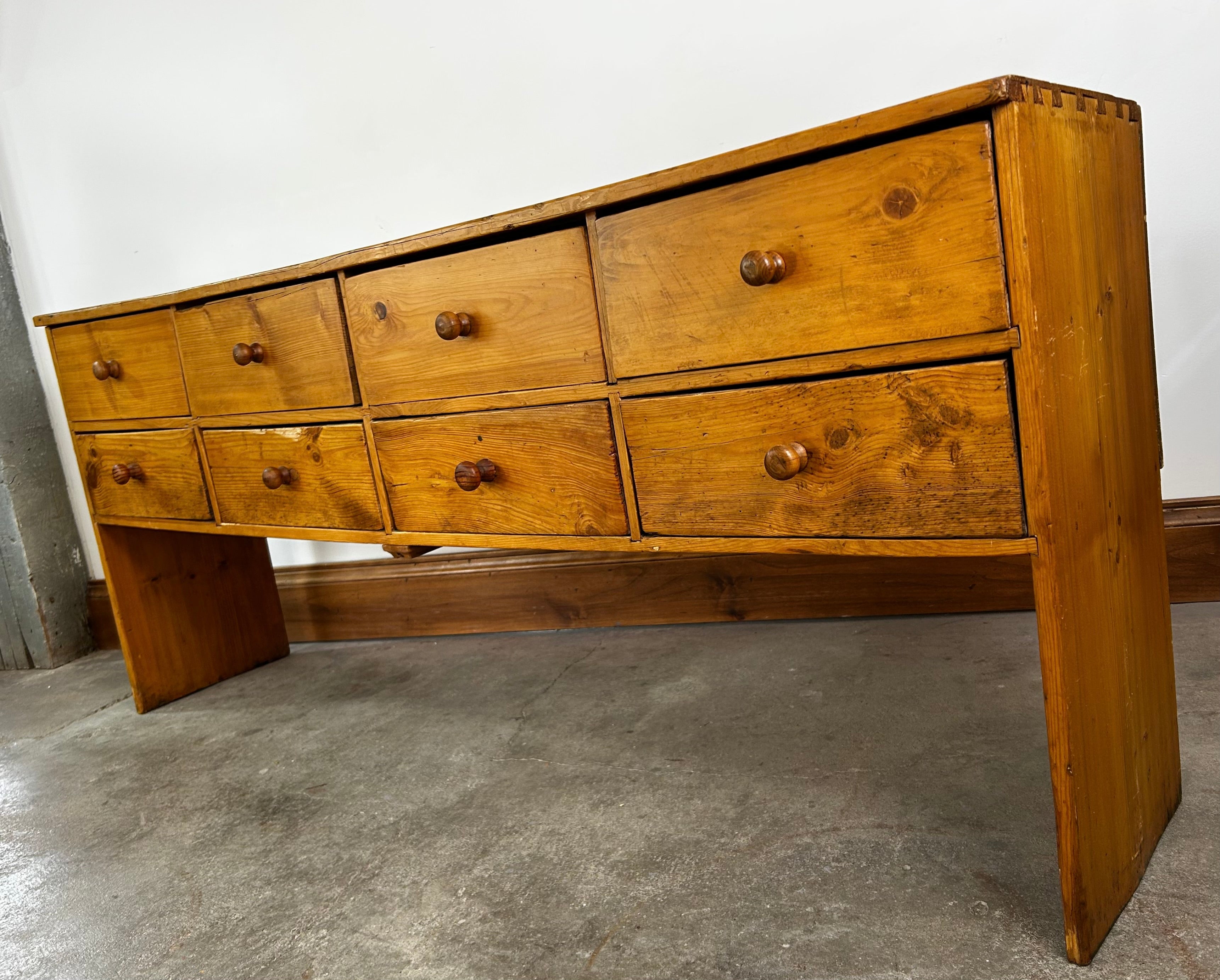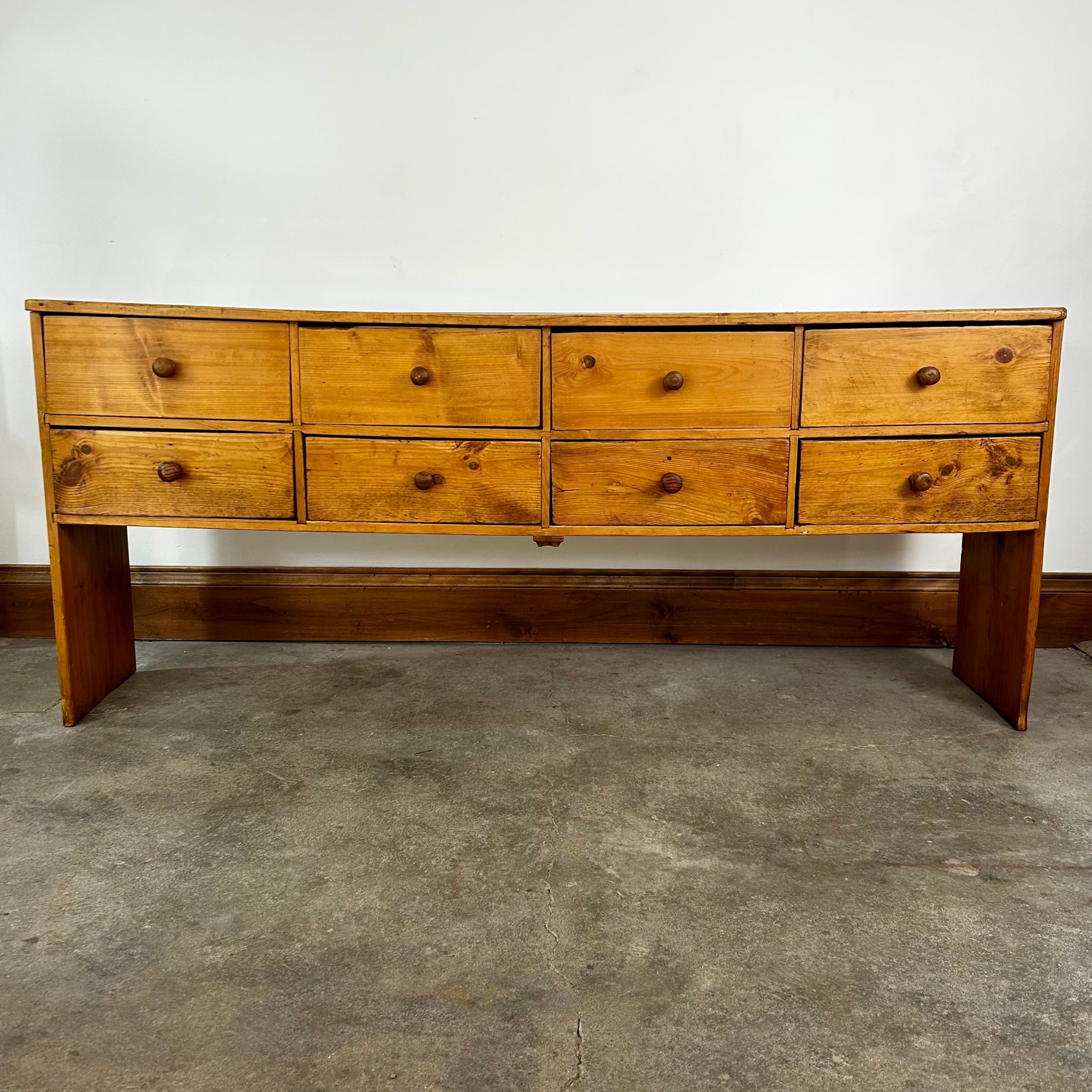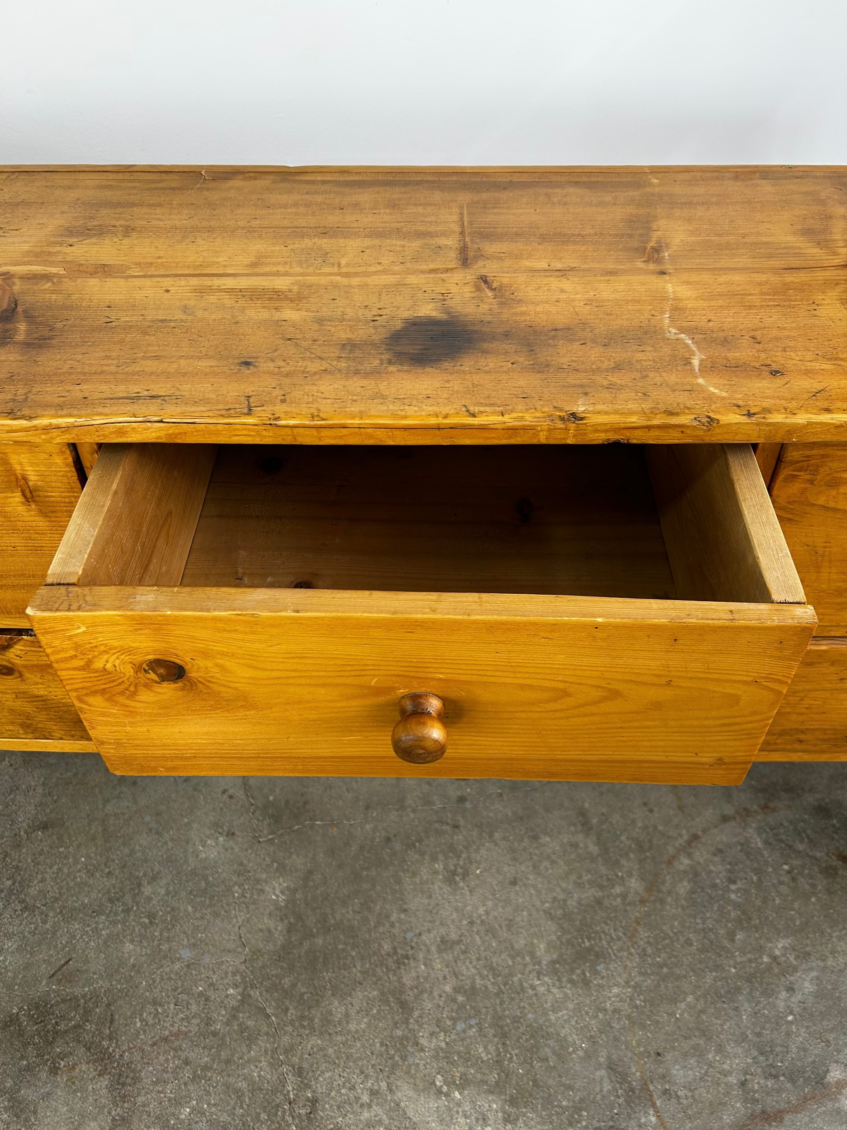 Console table, constructed of pinewood, eight drawers with wood pulls, rustic in style.