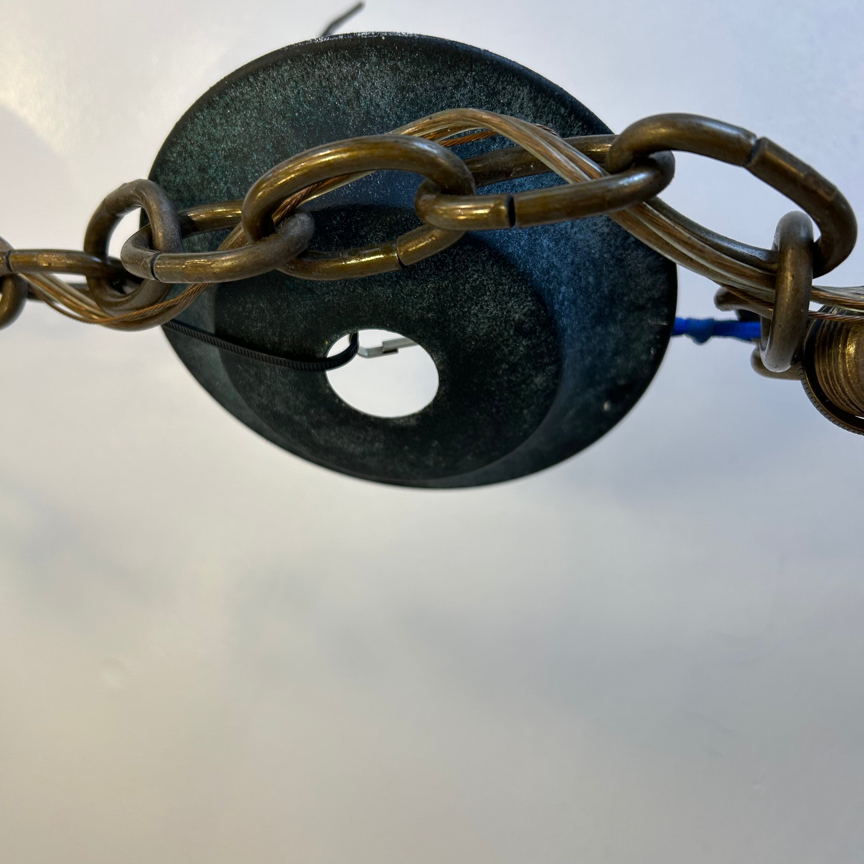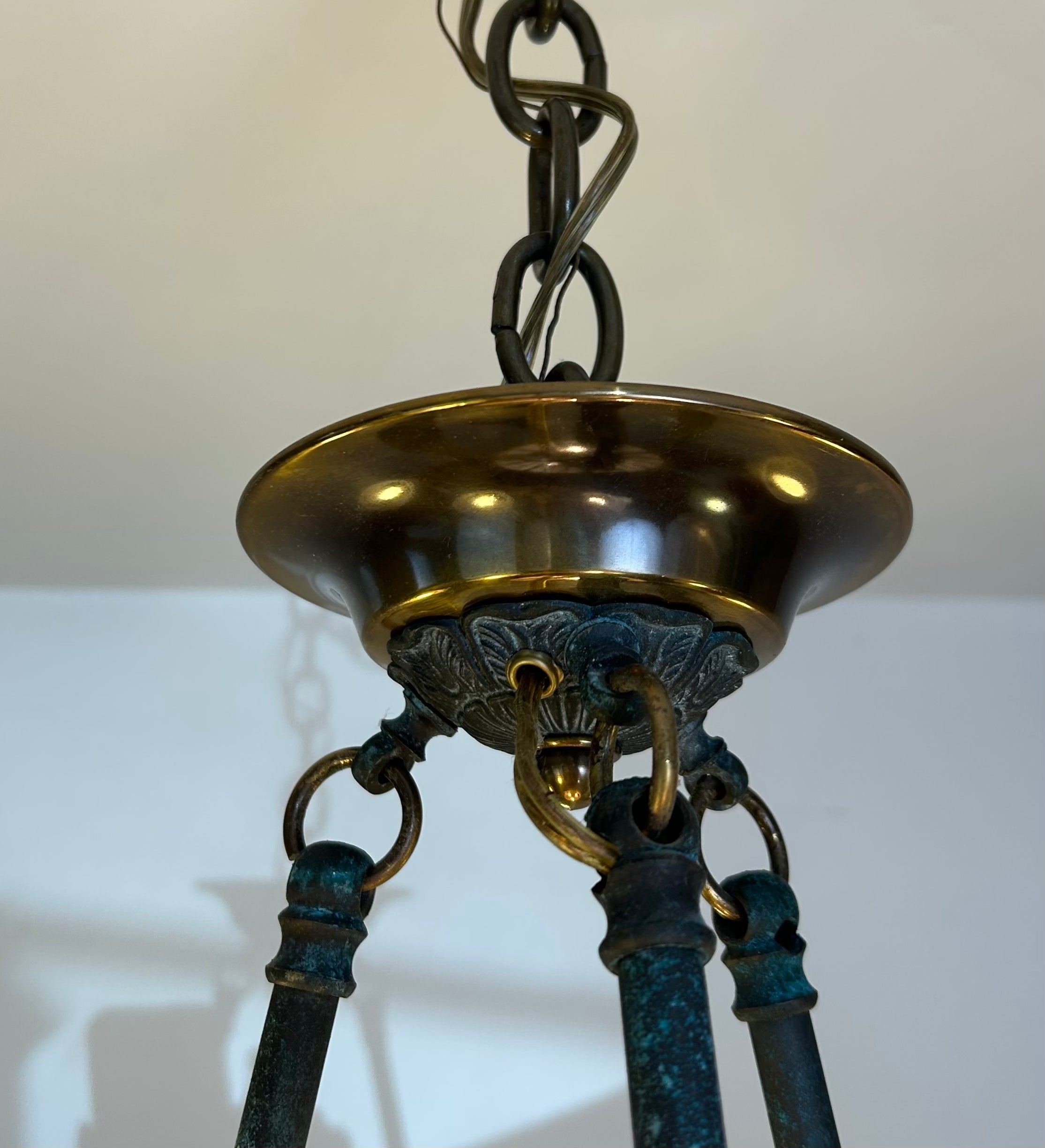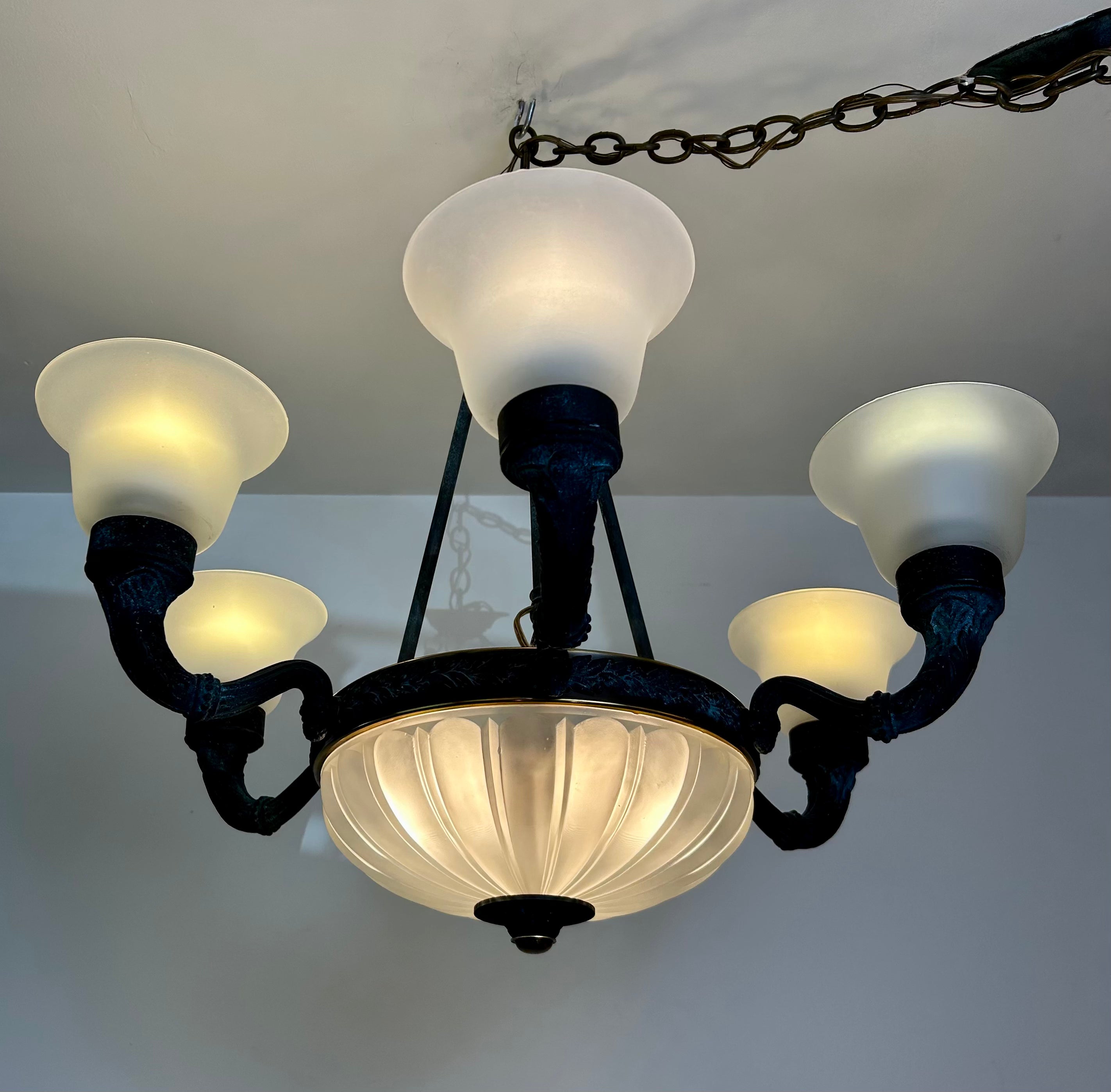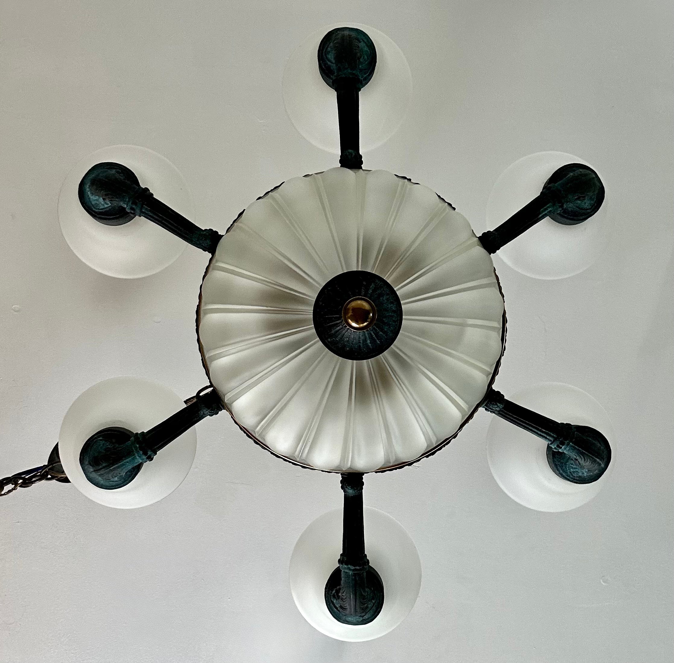 Corbett Chandelier, Six Arm, Bronze and Copper Frame, Frosted Glass Shades.