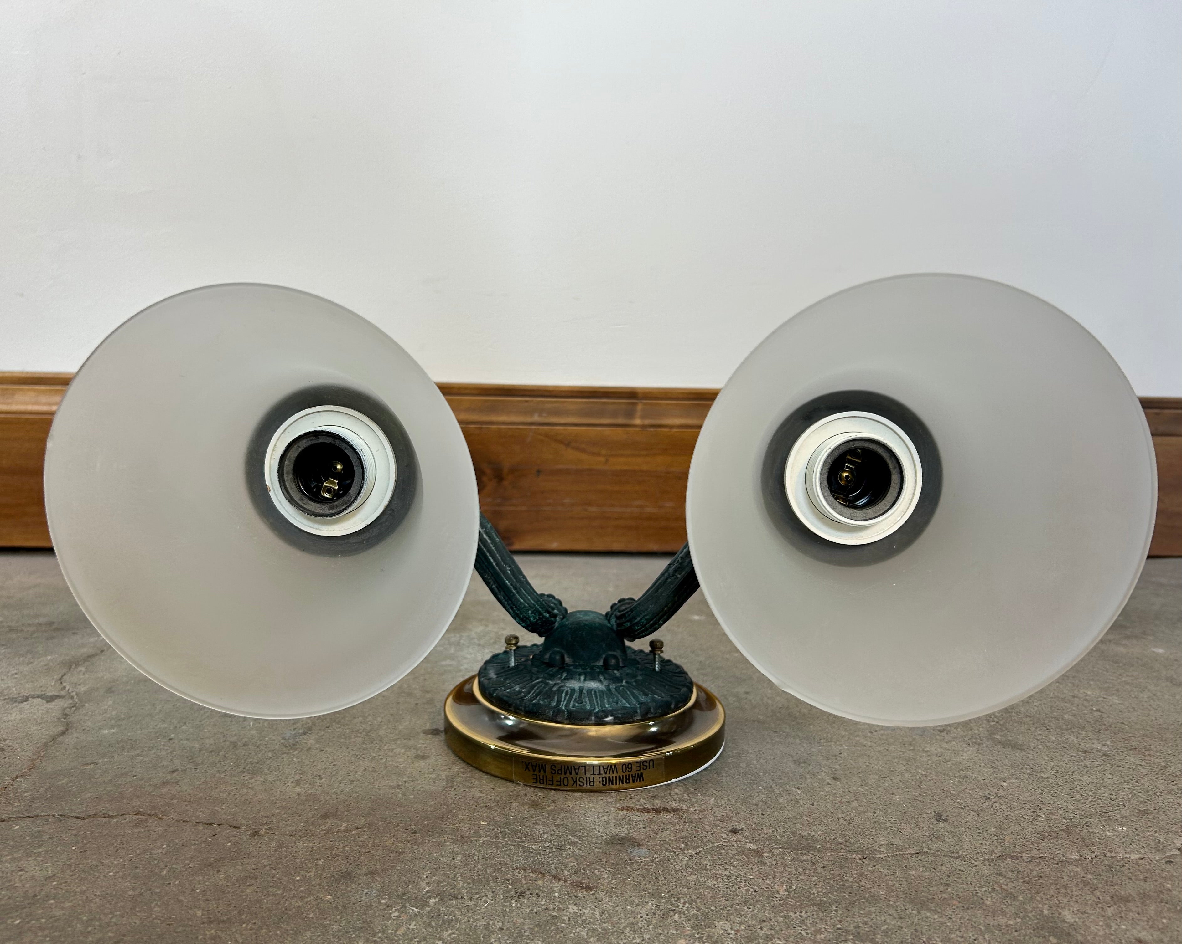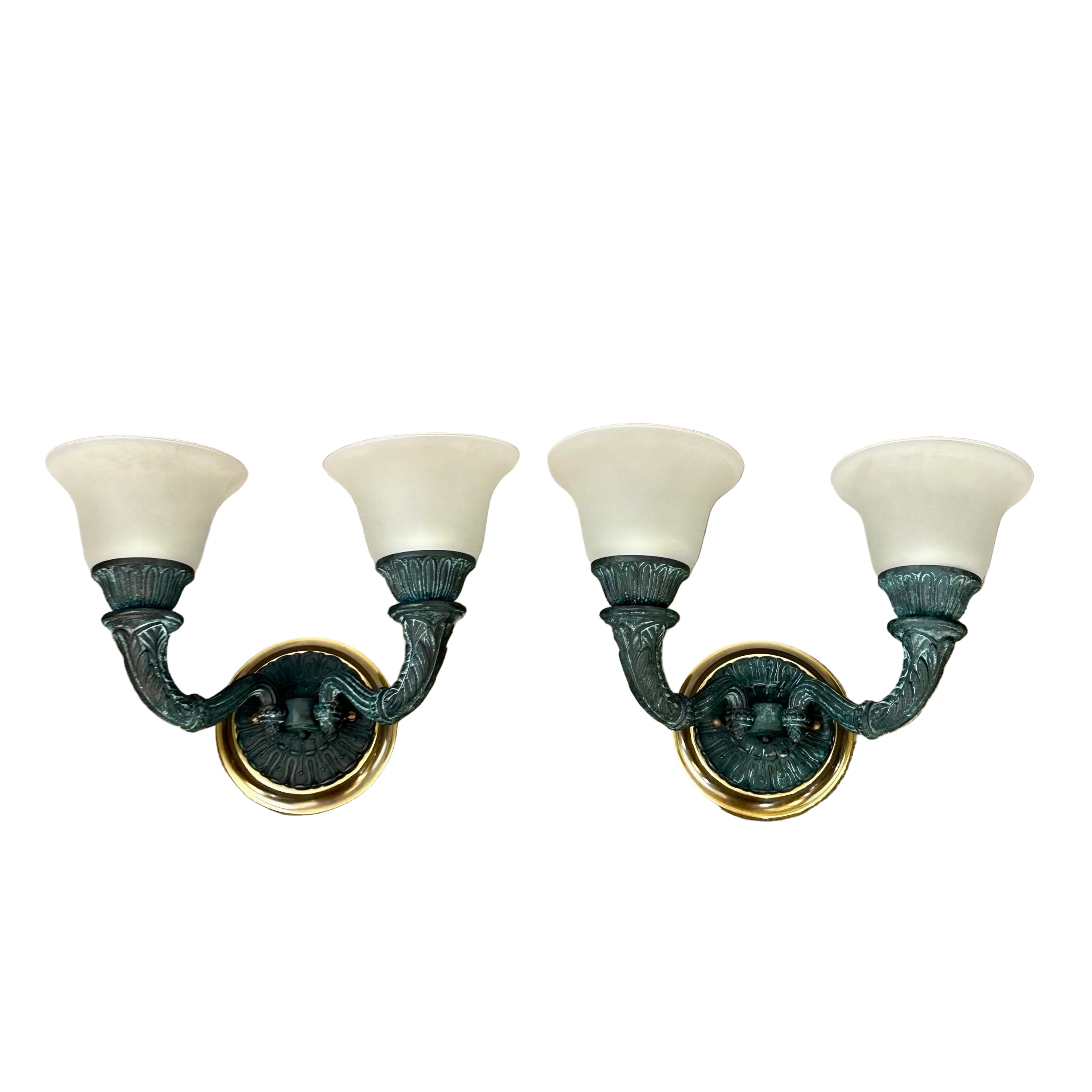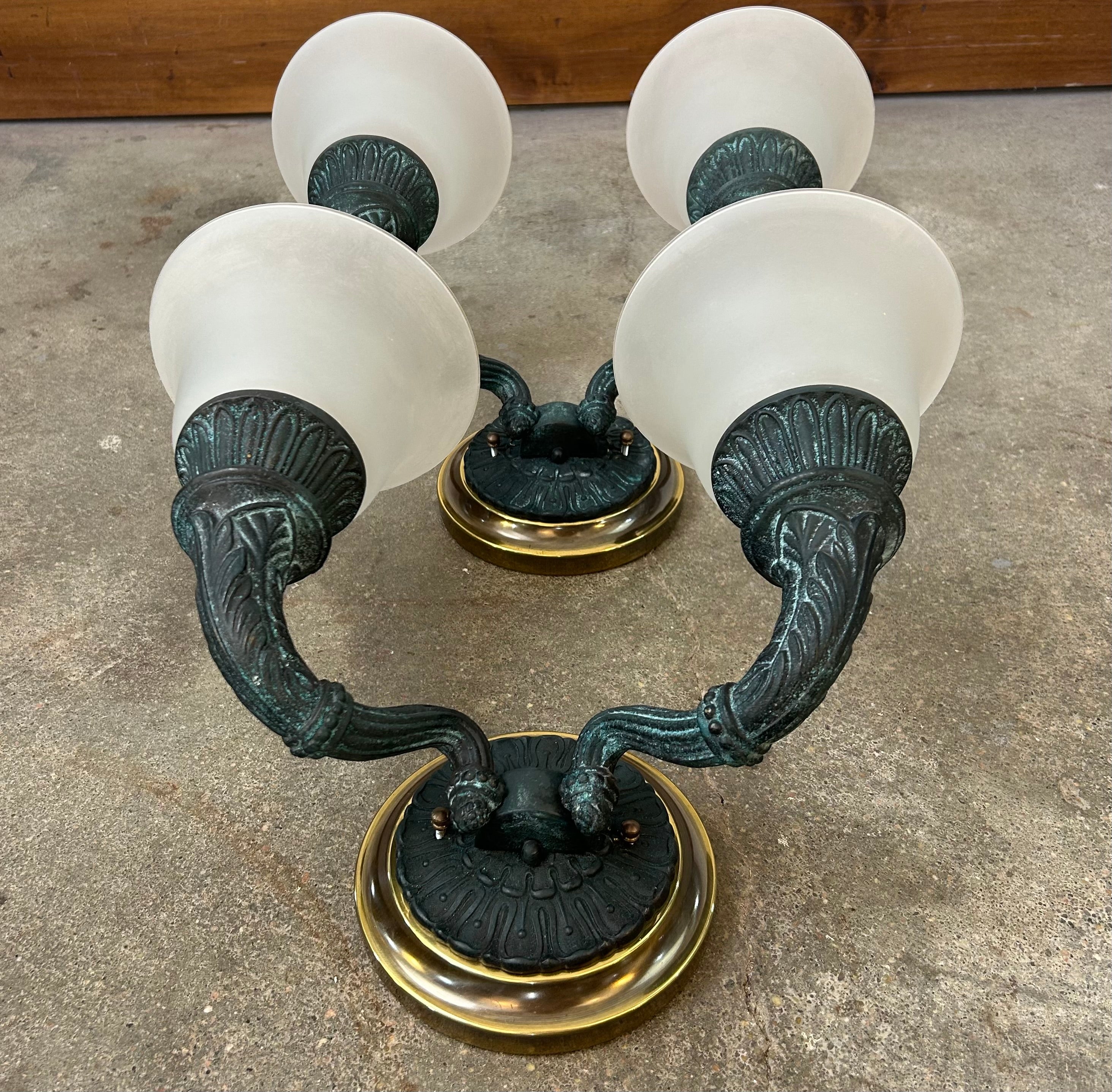 Corbett Lighting double arm light wall sconces with bronze arms and frosted glass shades. Sold as a pair, price reflects two.