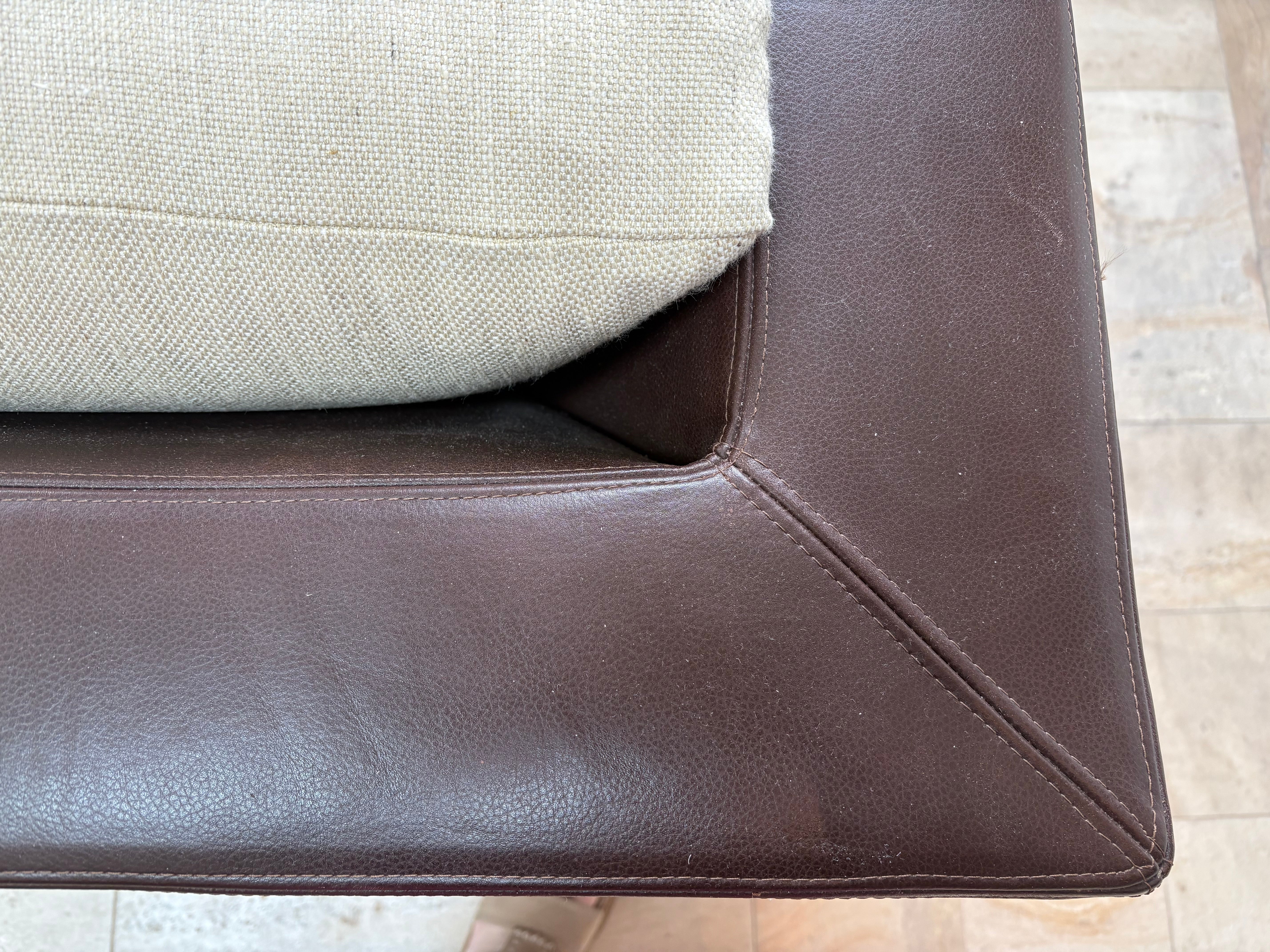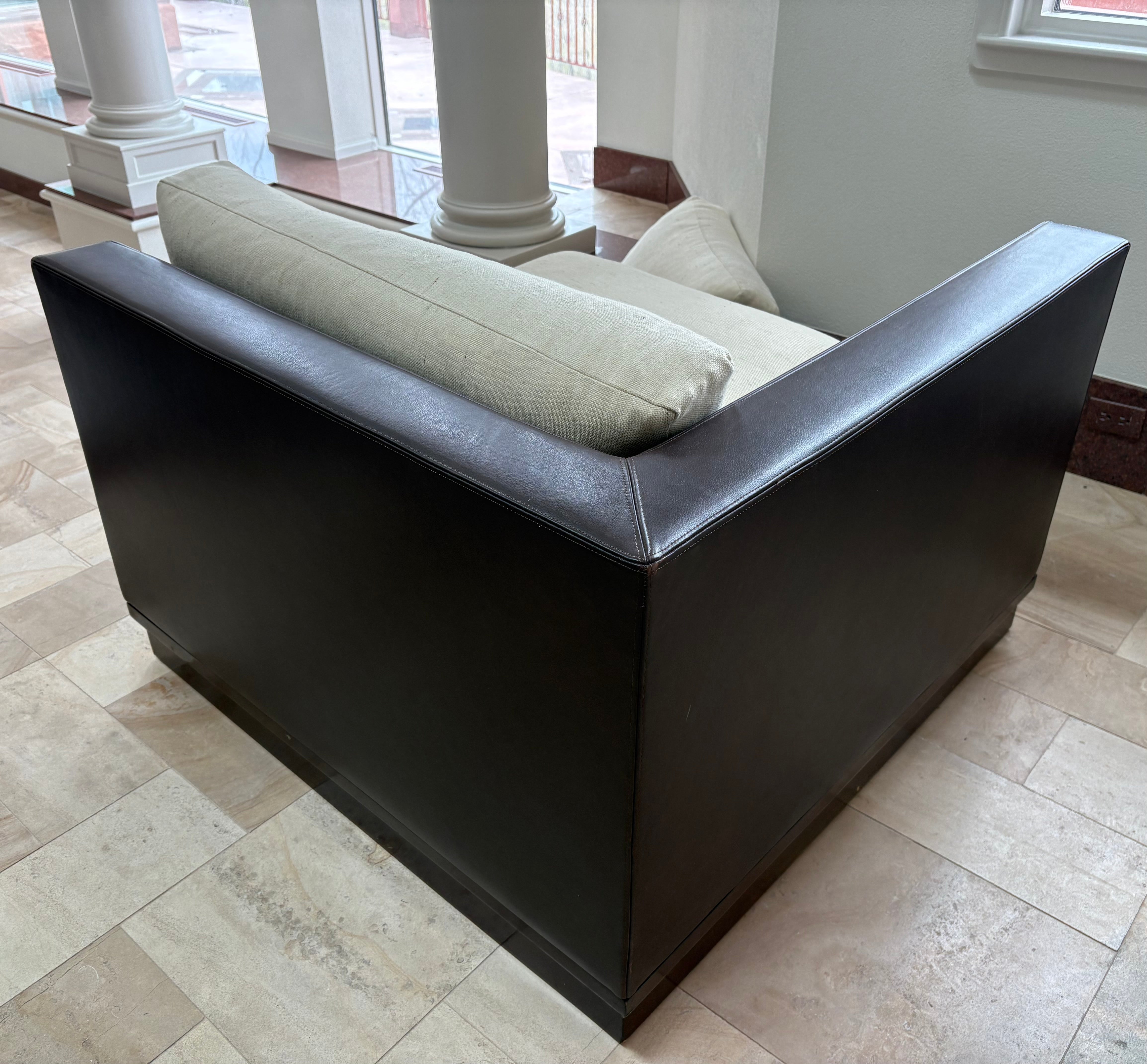 Corner brown leather base chair with white upholstered seat and cushions on top. Note: gallery images include two chairs put together.