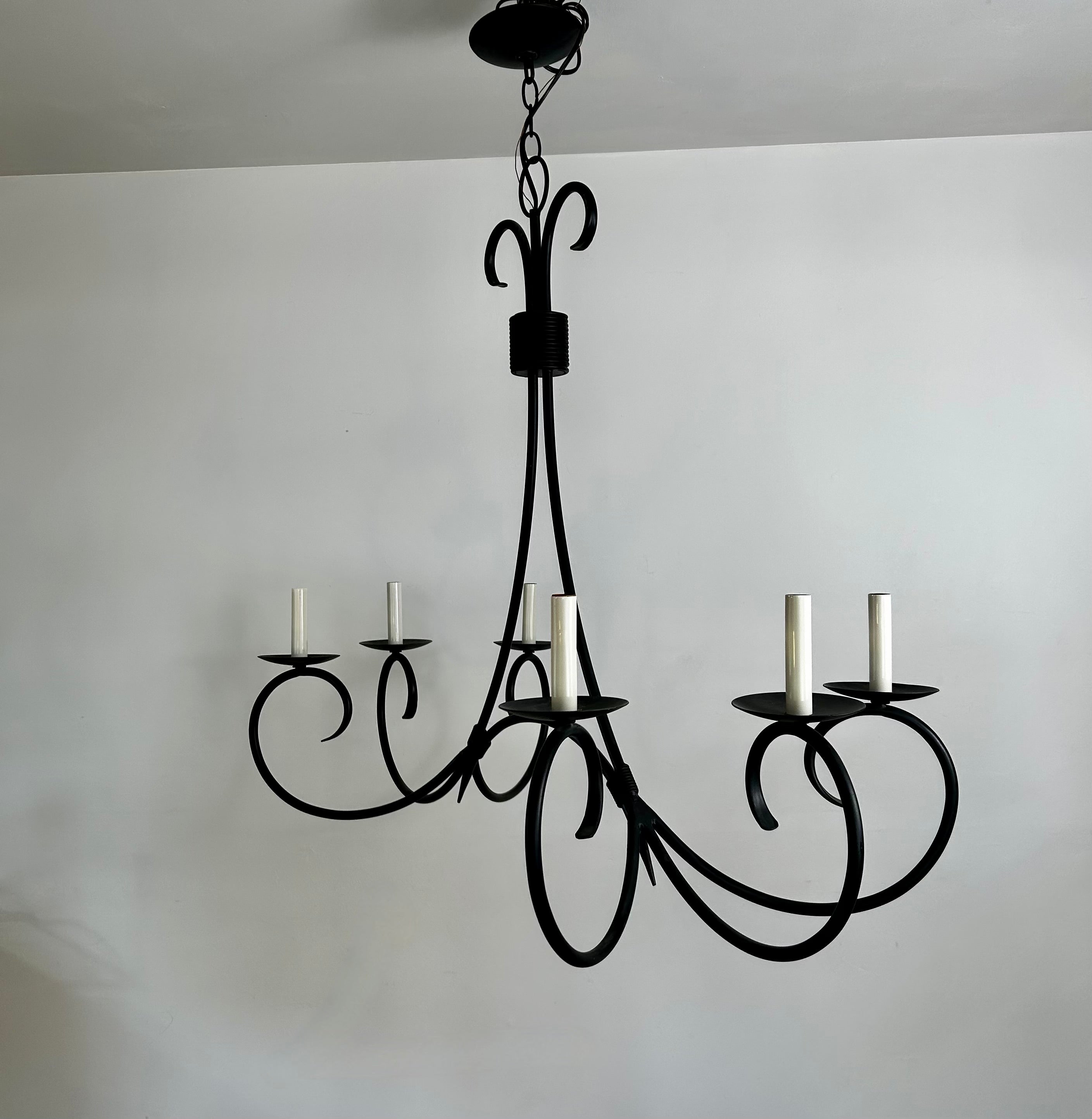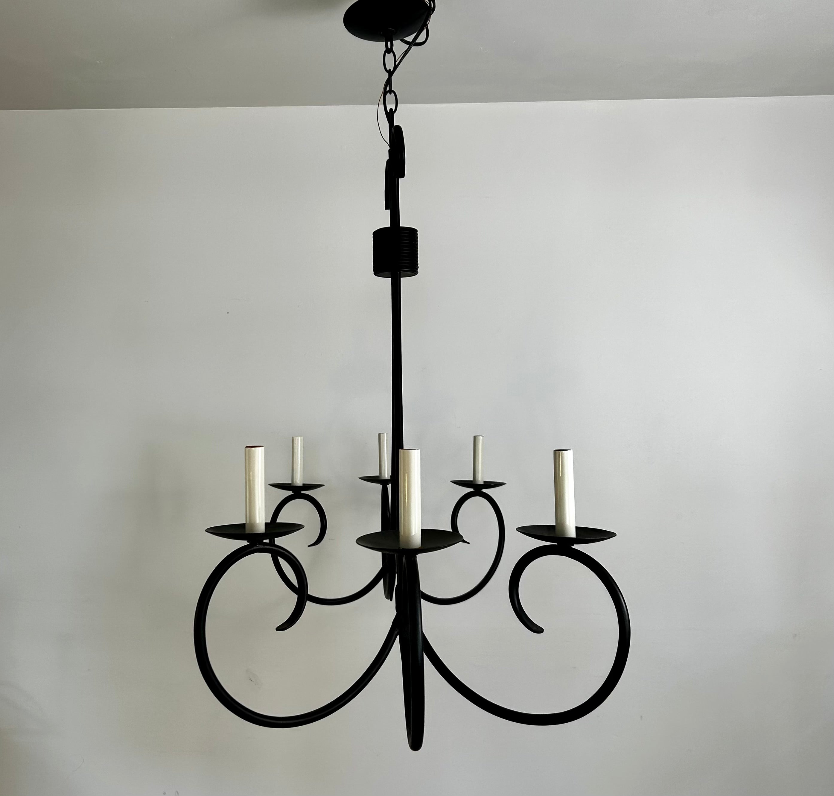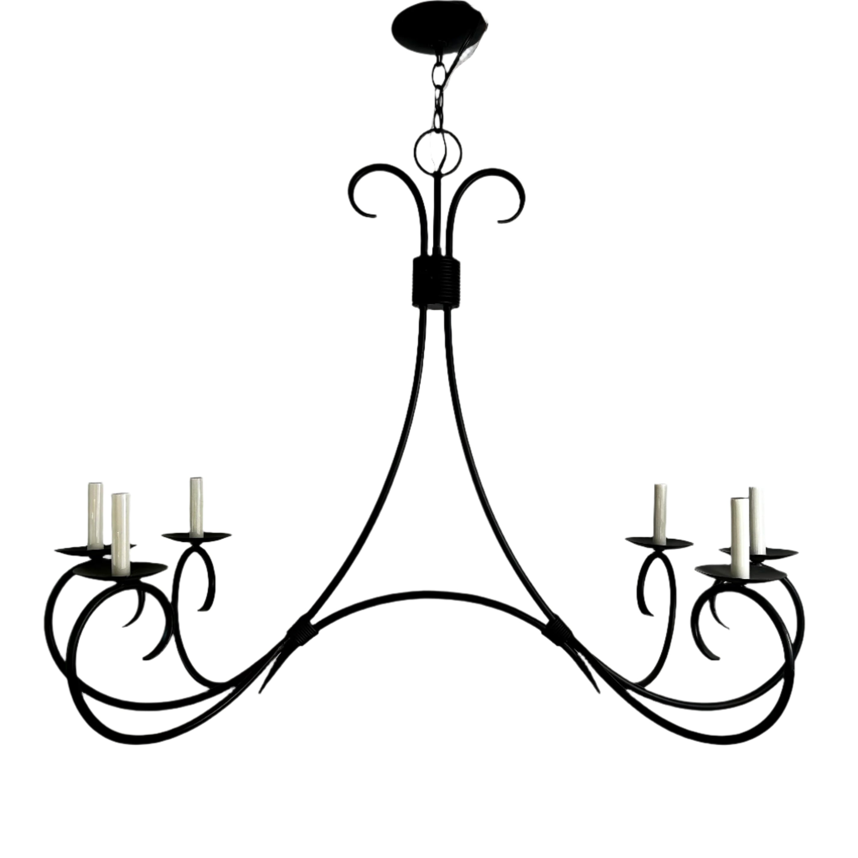 Currey & Company Chandelier, black metal, six-arm, rectangular shape. Ideal for over a rectangle dining table.